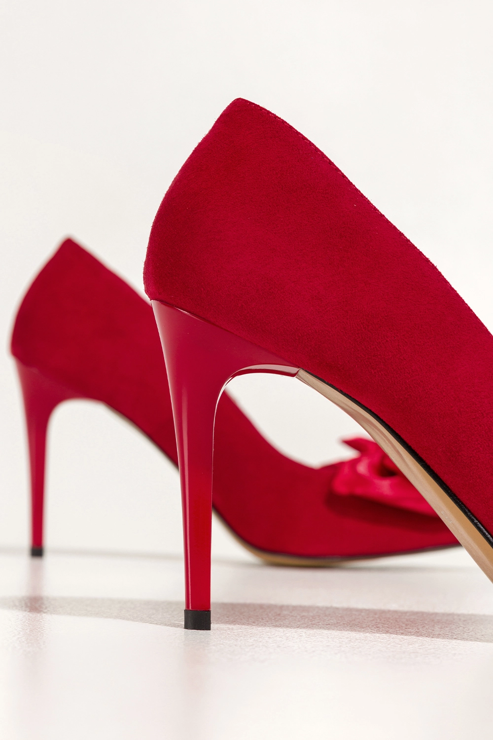 Czerwone czółenka skórzane damskie szpilki z satynową kokardą PRODUKT POLSKI Casu 7006-662-IVW przyciągają spojrzenia. Intensywnie czerwony kolor połączony z aksamitną fakturą skóry zamszowej tworzy niezwykle wyrazisty efekt, a elegancka satynowa kokarda na przodzie dodaje całości luksusowego charakteru. Smukły, szpiczasty nosek oraz lakierowany obcas szpilka pięknie wysmuklają sylwetkę i nadają butom karnawałowej energii.