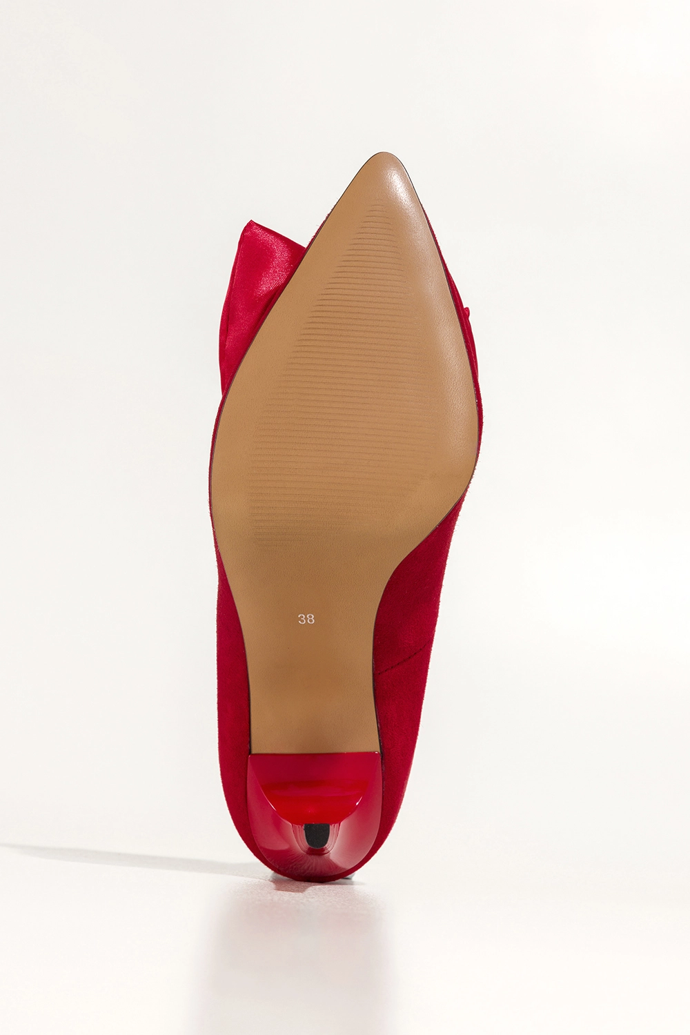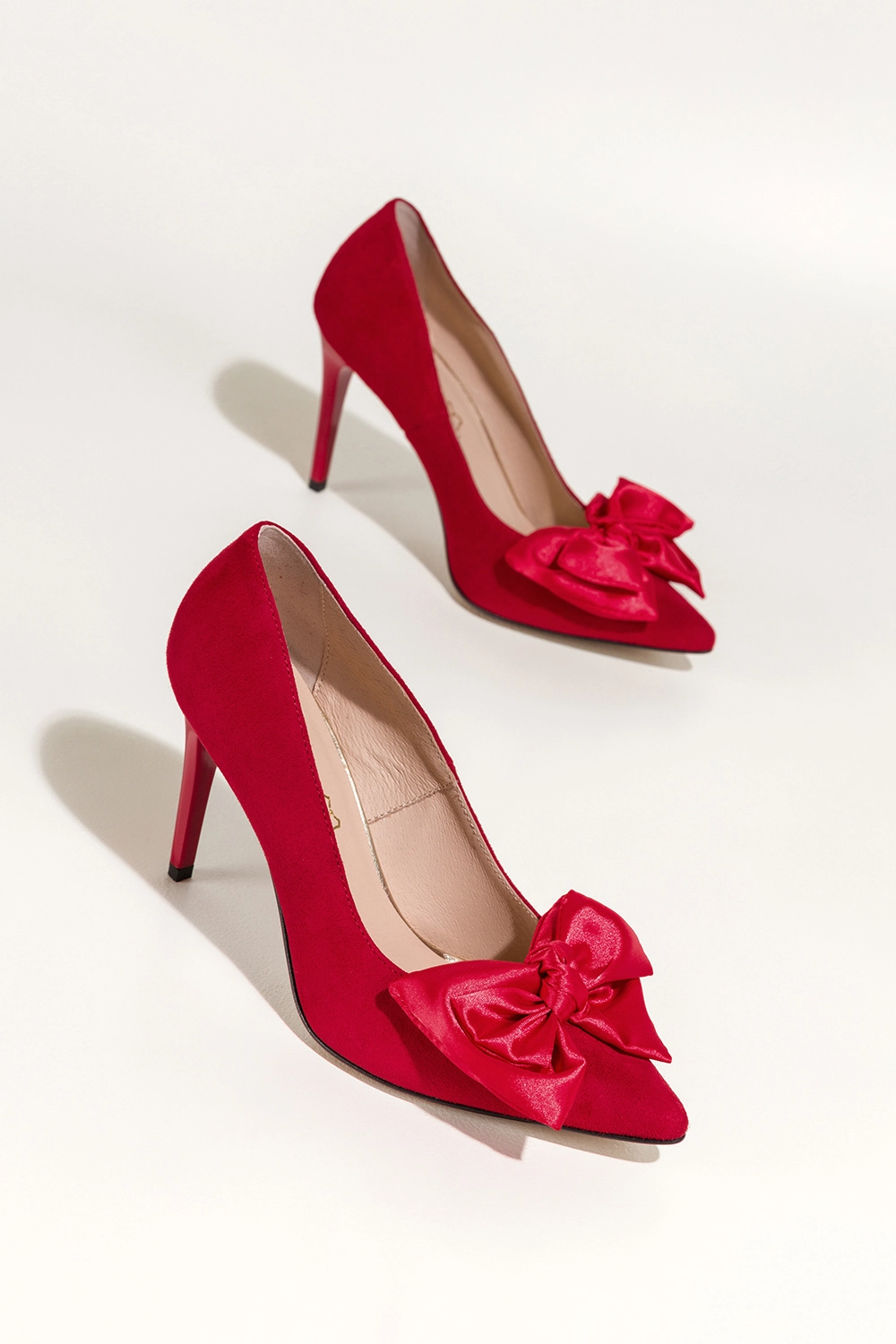 Czerwone czółenka skórzane damskie szpilki z satynową kokardą PRODUKT POLSKI Casu 7006-662-IVW