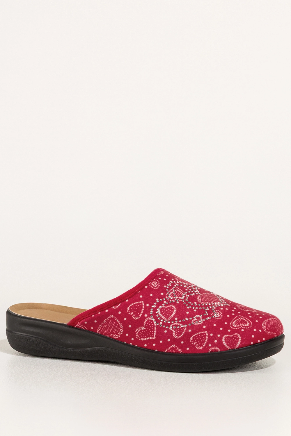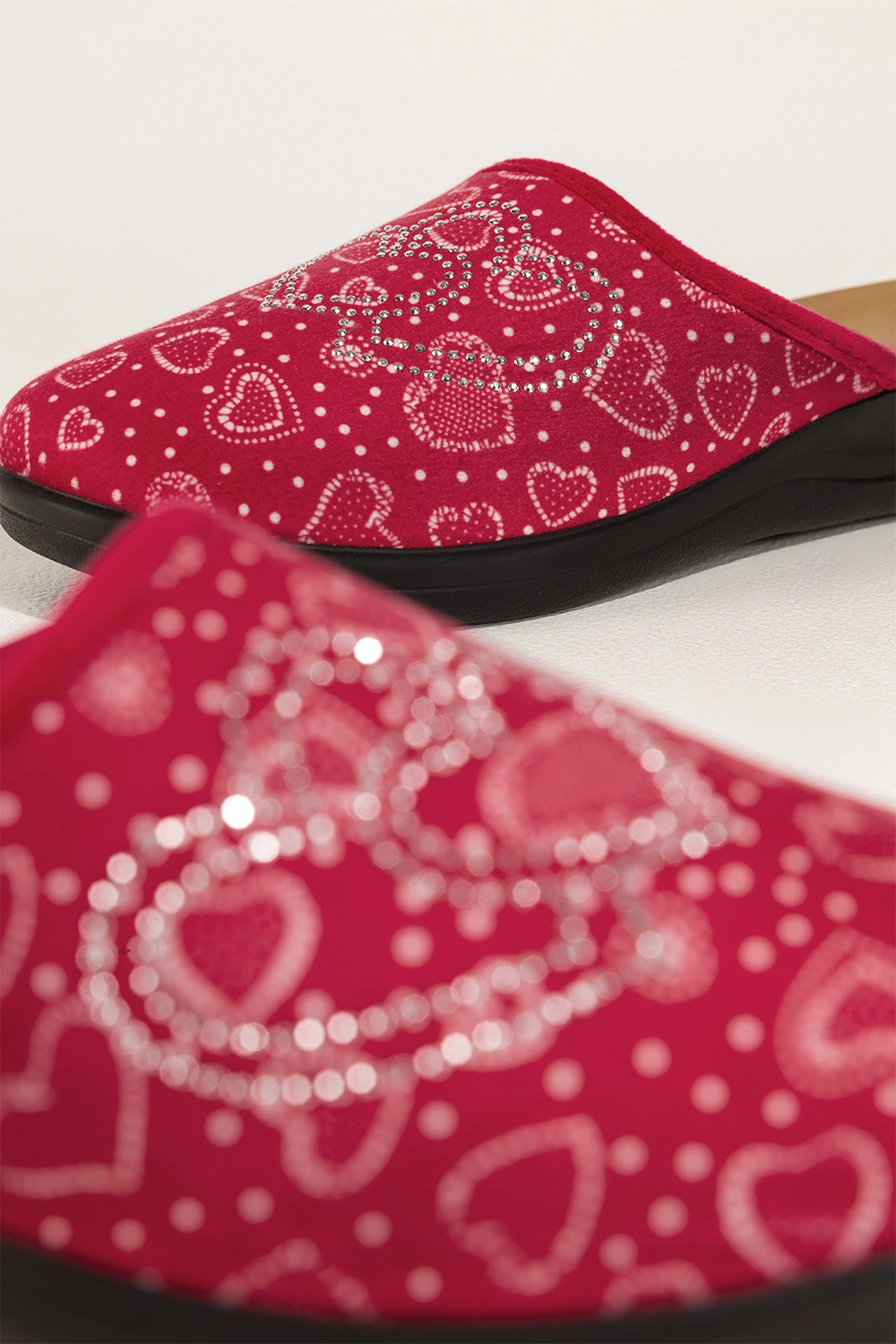 Model na cholewce zdobią urocze serca wysadzane błyszczącymi cyrkoniami, dodając subtelnego blasku i kobiecego charakteru. Wsuwana konstrukcja ułatwia zakładanie i zdejmowanie, a podeszwa na delikatnym klinie zapewnia stabilność oraz optymalne podparcie.