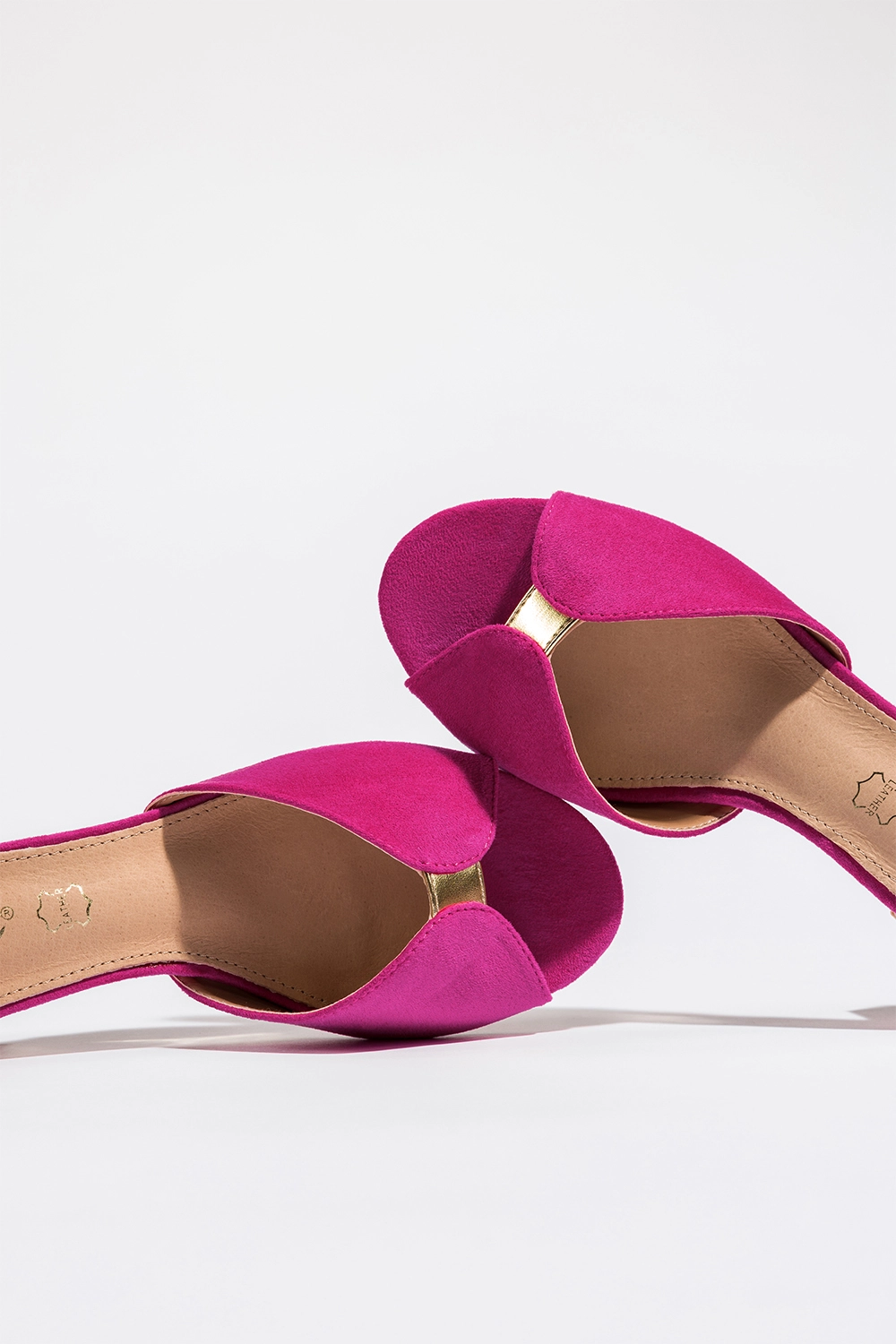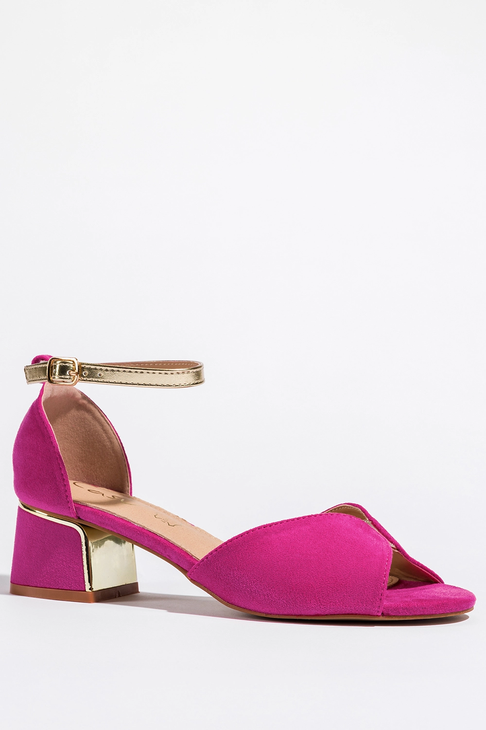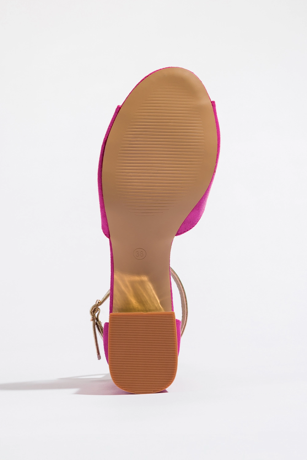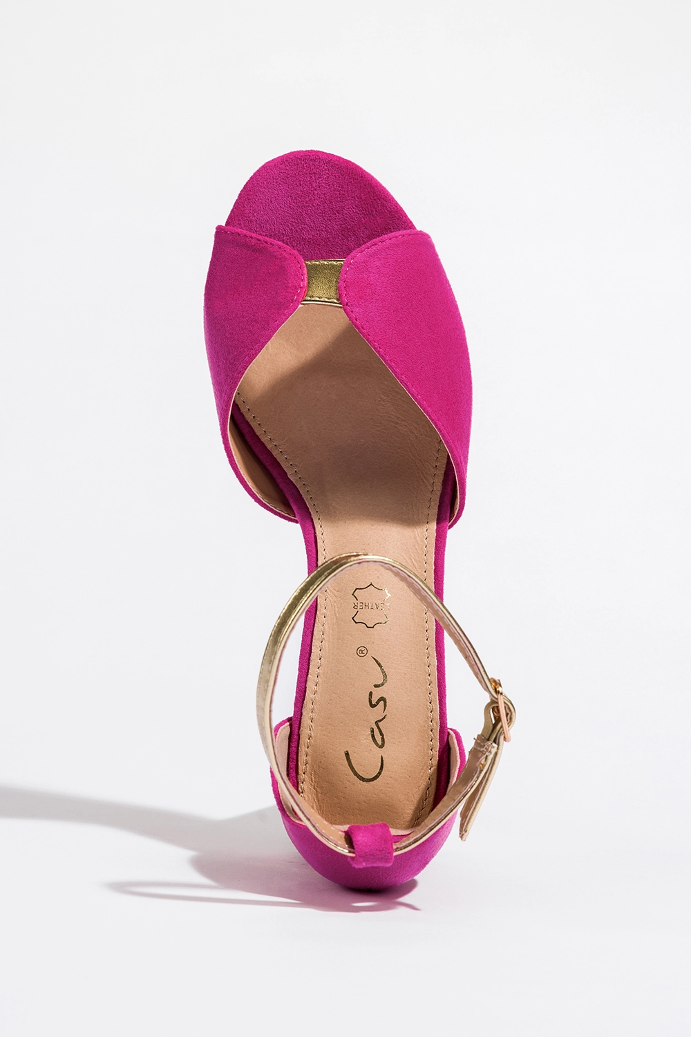 Fuksjowe sandały damskie na ozdobnym klocku z zakrytą piętą, pasek wokół kostki, złote dodatki, skórzana wkładka Casu model ER23X8-F to propozycja dla kobiet, które cenią sobie połączenie elegancji, wygody i odważnych, modnych akcentów. Wykonane z wysokogatunkowego zamszu ekologicznego, zachwycają swoją miękkością i doskonałym dopasowaniem do stopy. Intensywnie fuksjowy kolor dodaje butom charakteru, czyniąc je niezastąpionym elementem letnich stylizacji. Zastosowanie stabilnego obcasa w formie klocka ze złotymi detalami nie tylko przyciąga spojrzenia, ale również zapewnia komfort i pewność kroku przez cały dzień. Delikatny złoty pasek wokół kostki z regulowanym zapięciem podkreśla smukłość nogi, optycznie ją wydłużając i nadając sylwetce subtelnej lekkości.