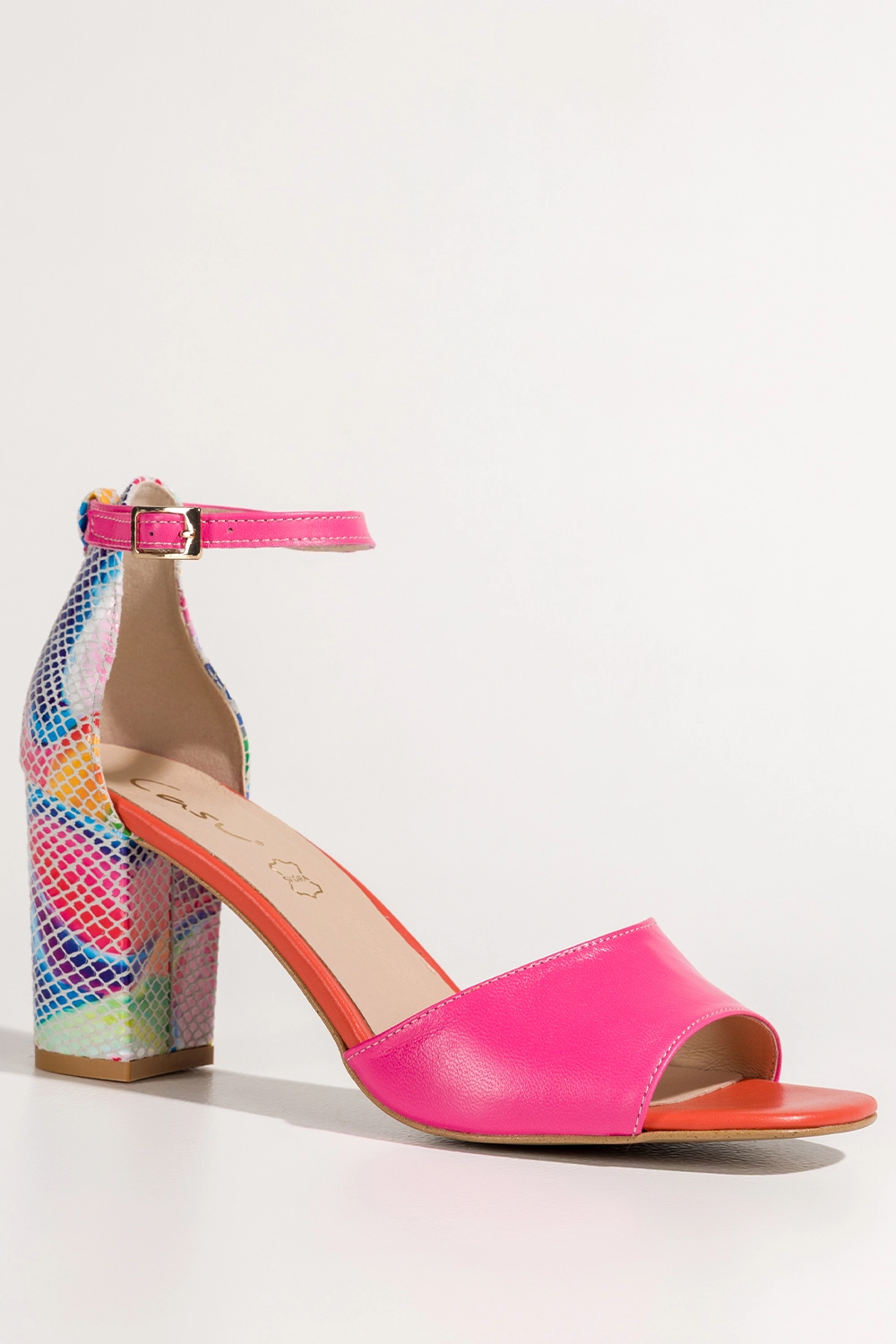 Fuksjowe sandały skórzane damskie na ozdobnym słupku z zakrytą piętą Casu model 2671-196 to kwintesencja elegancji i wyrafinowanego stylu, stworzona z myślą o kobietach, które pragną wyróżniać się w tłumie. Ten produkt to efekt pracy polskich rzemieślników i projektantów, którzy połączyli doskonałą jakość naturalnej skóry z niebanalnym wzornictwem i komfortem użytkowania. Sandały wyróżnia intensywny, głęboki kolor fuksji, który przyciąga wzrok i dodaje energii każdej stylizacji, a ozdobny obcas typu słupek pokryty wzorzystą, kolorową skórą sprawia, że całość prezentuje się jak małe dzieło sztuki użytkowej. To propozycja dla kobiet, które nie chcą rezygnować z wygody na rzecz mody – ten model łączy w sobie obie te cechy w mistrzowski sposób.