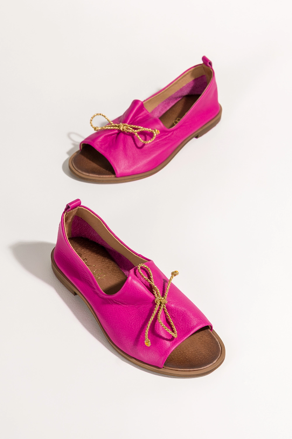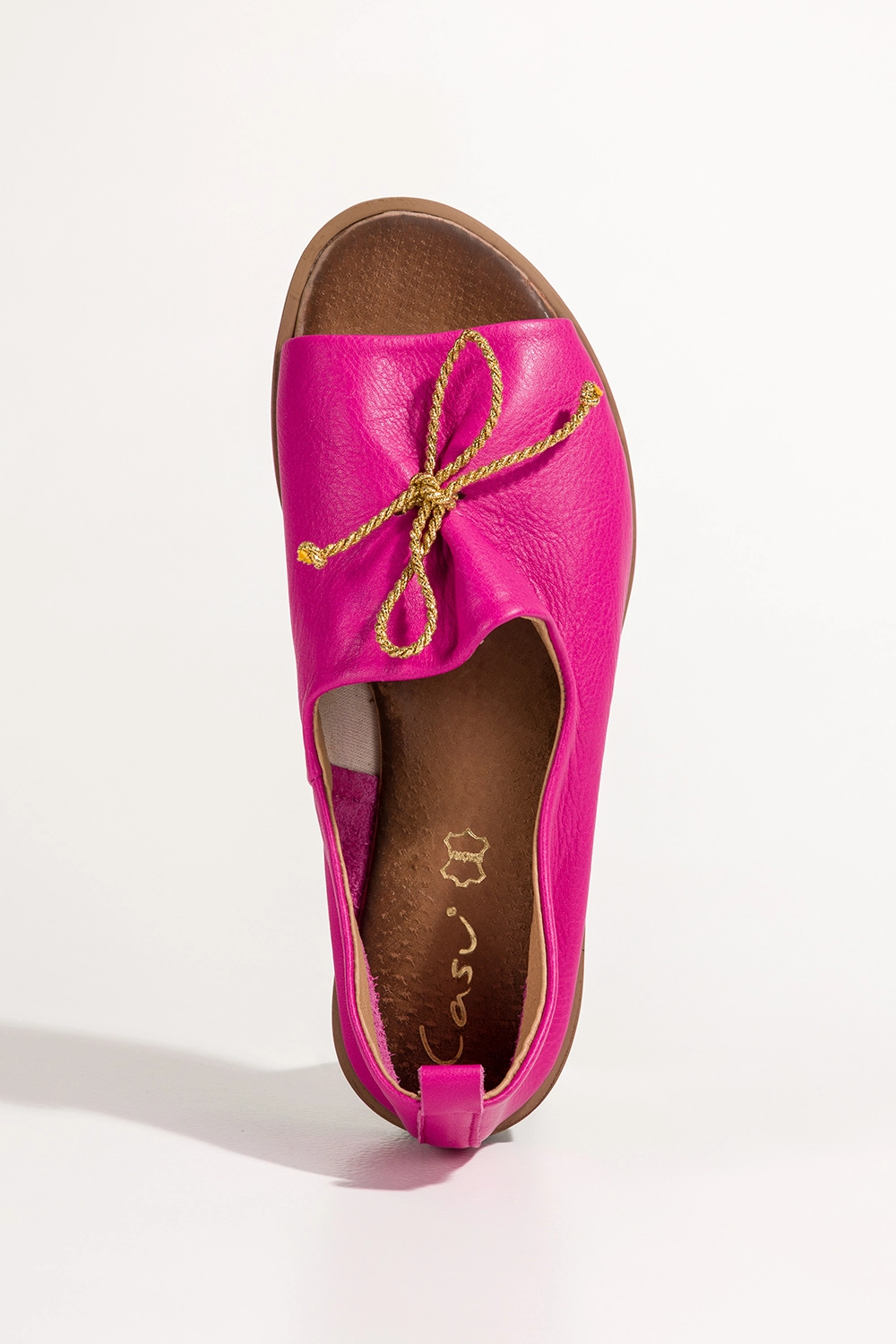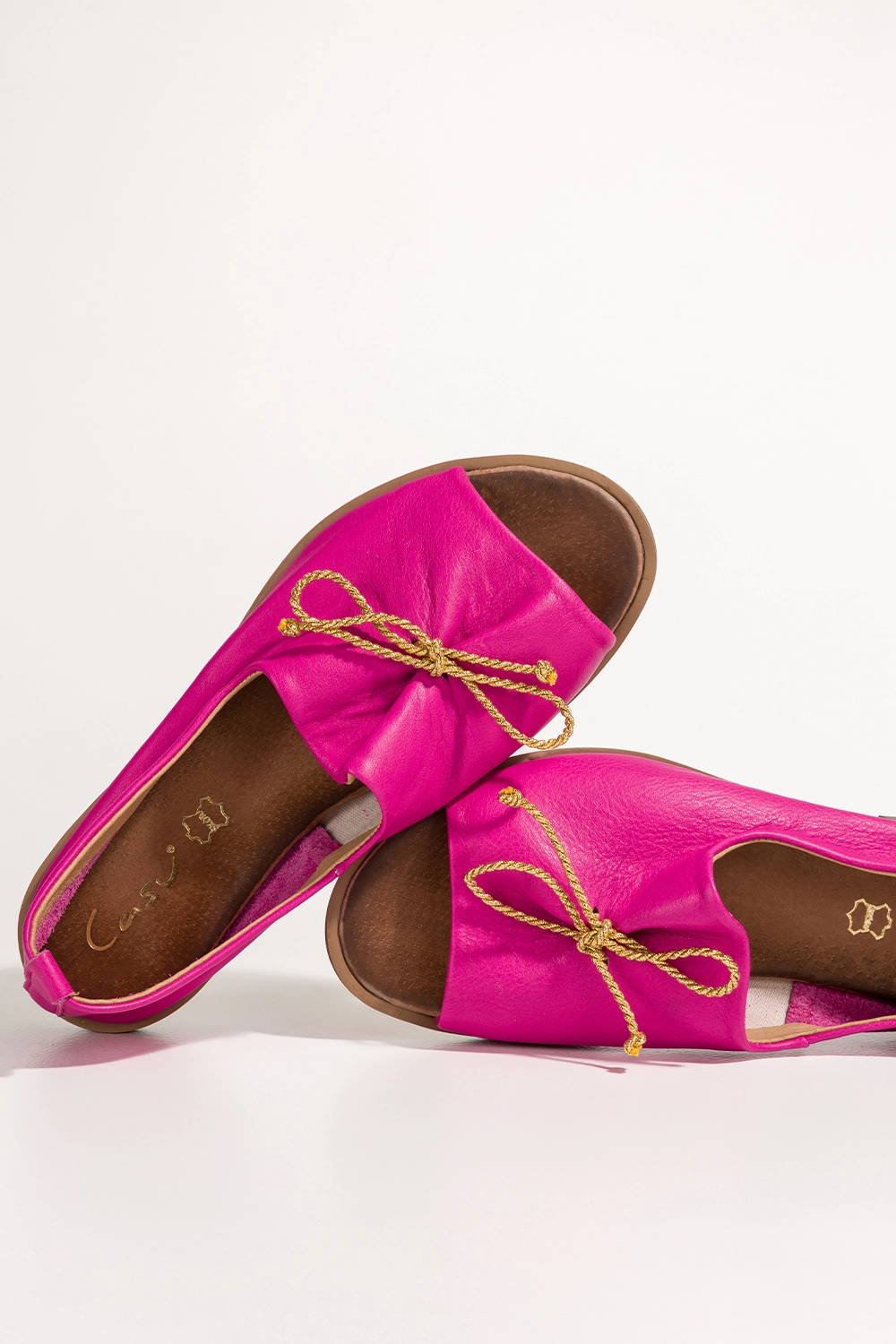 Fuksjowe sandały skórzane damskie zabudowane ze złotą kokardą PRODUKT POLSKI Casu model 2660-073 to wyjątkowe połączenie kobiecej elegancji, wygody i ponadczasowego stylu, które przyciąga uwagę od pierwszego spojrzenia. Stworzone z najwyższej jakości skóry naturalnej, te unikalne sandały zostały zaprojektowane z myślą o kobietach ceniących wyrafinowany wygląd i komfort noszenia. Głęboki, intensywny odcień fuksji nadaje im energetycznego charakteru, a złota kokarda umieszczona na przodzie subtelnie podkreśla luksusowy design. To nie tylko obuwie – to modowa deklaracja, która pozwala wyrazić siebie w każdej sytuacji.