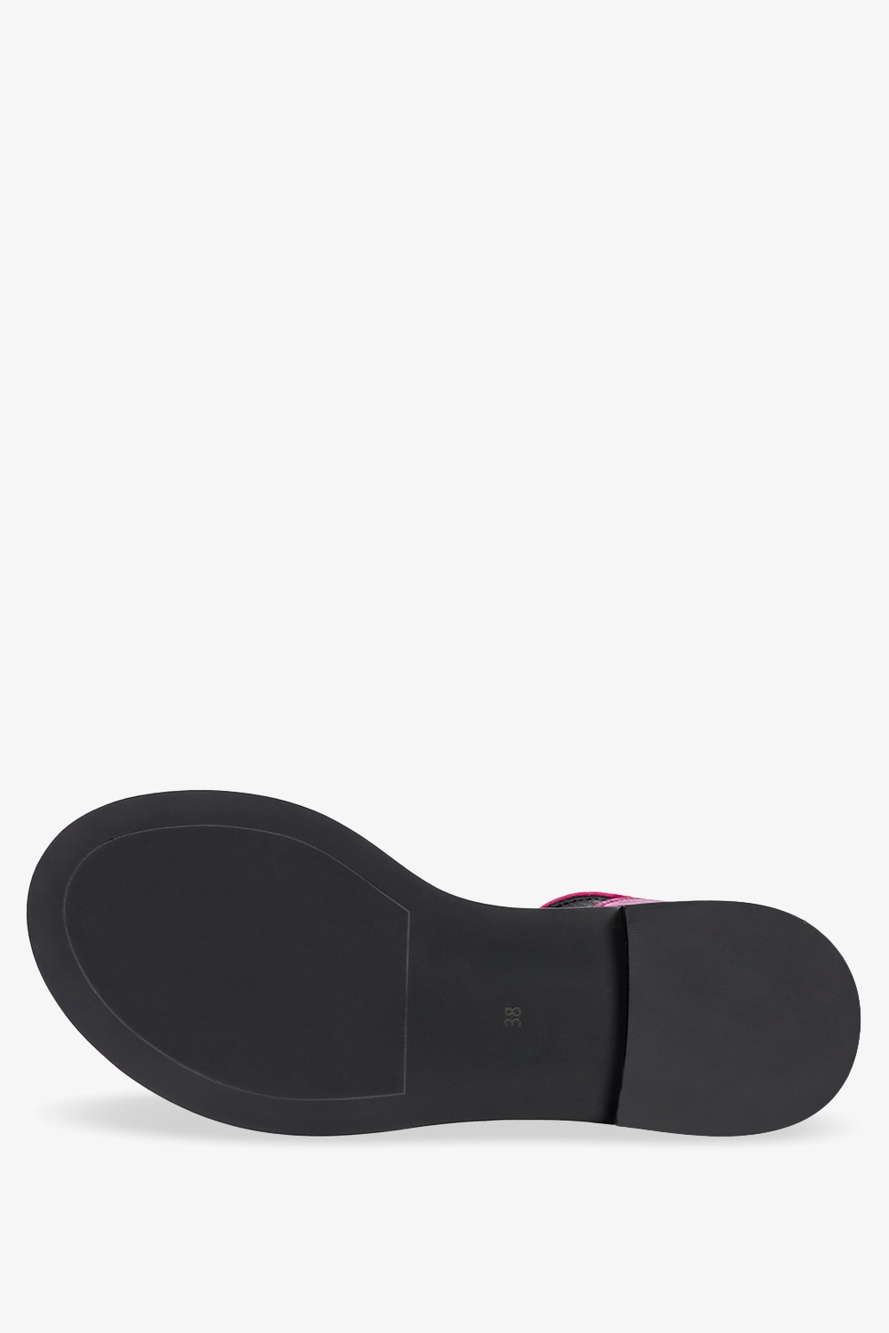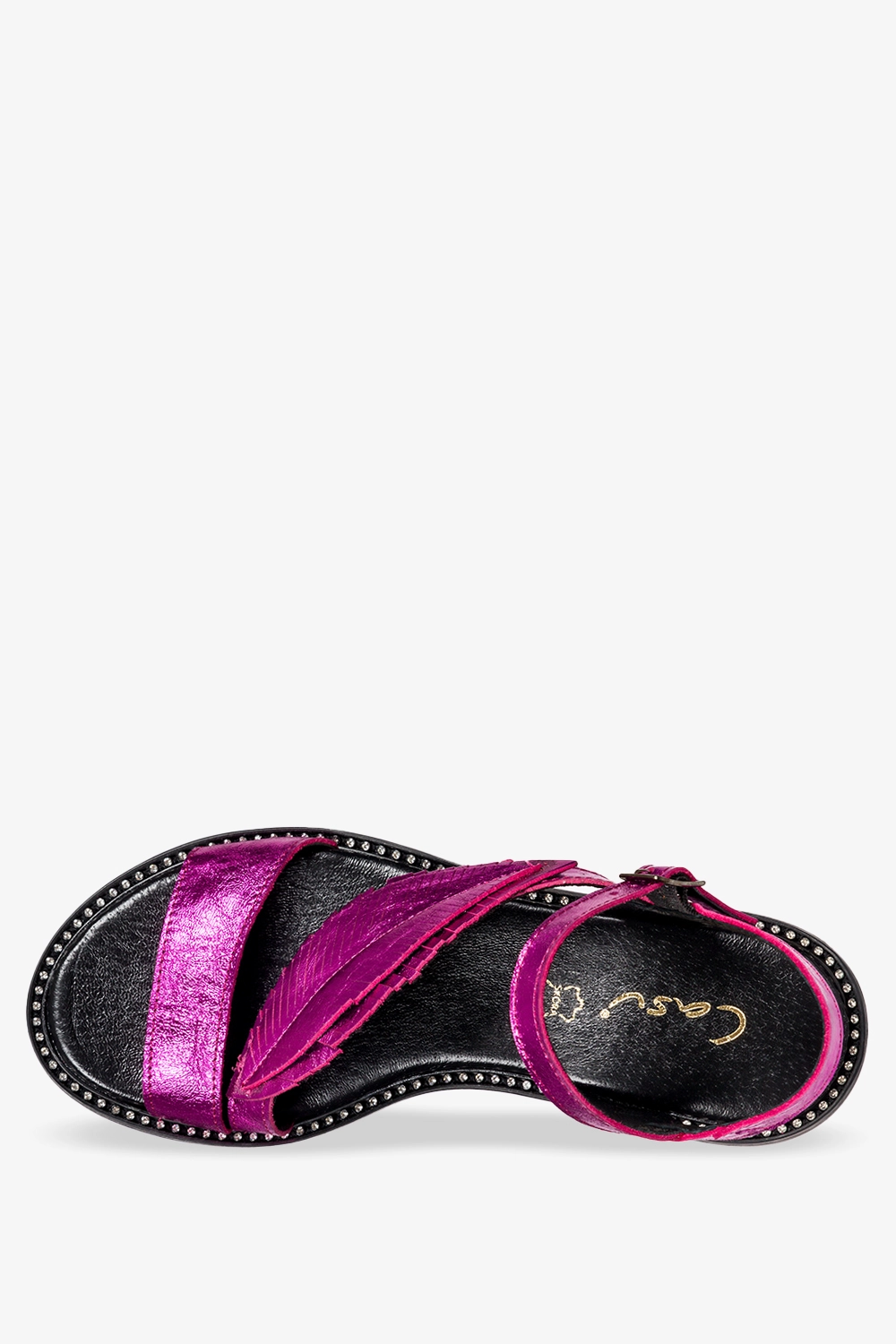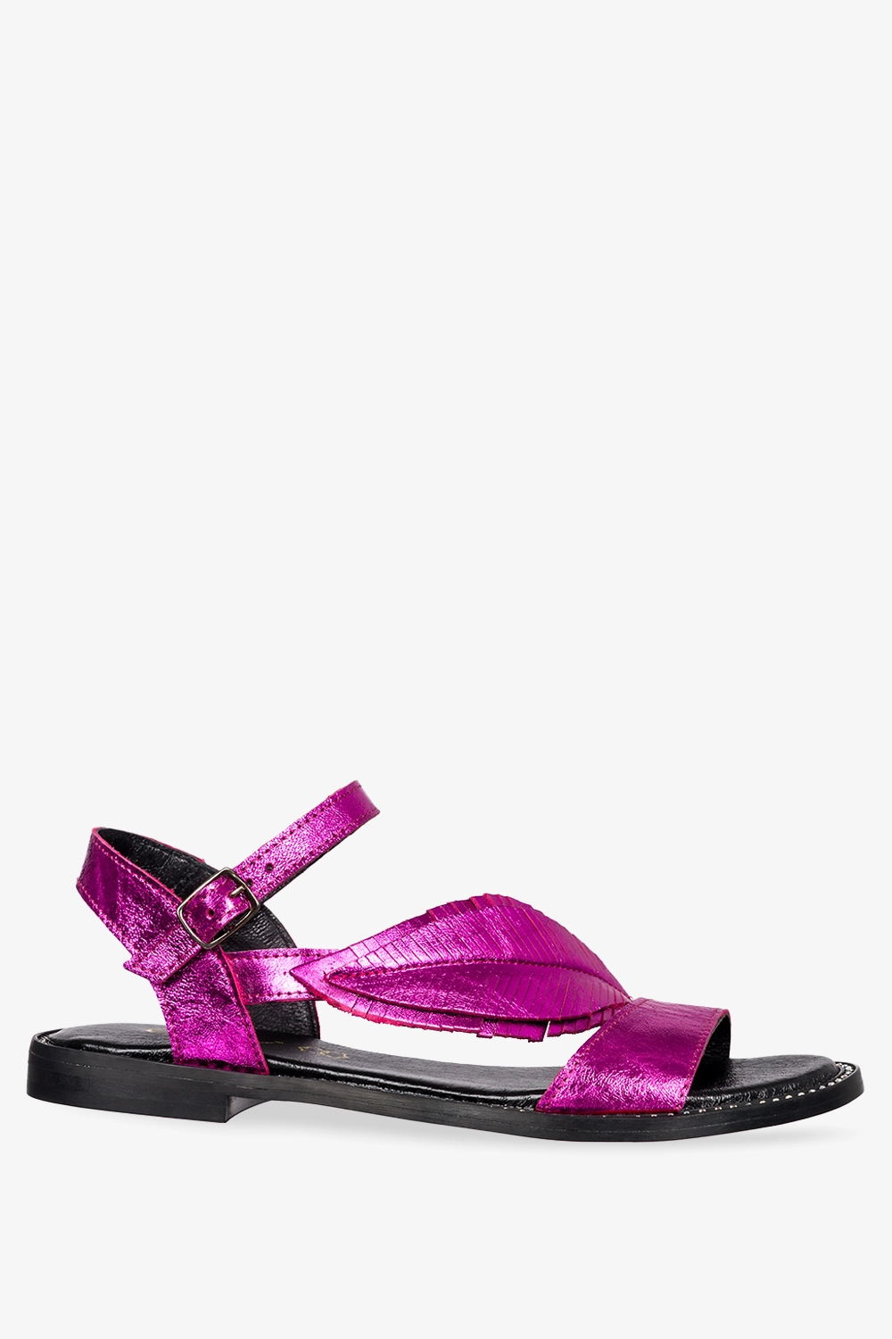 Fuksjowe sandały skórzane metaliczne damskie płaskie z liściem PRODUKT POLSKI Casu 933