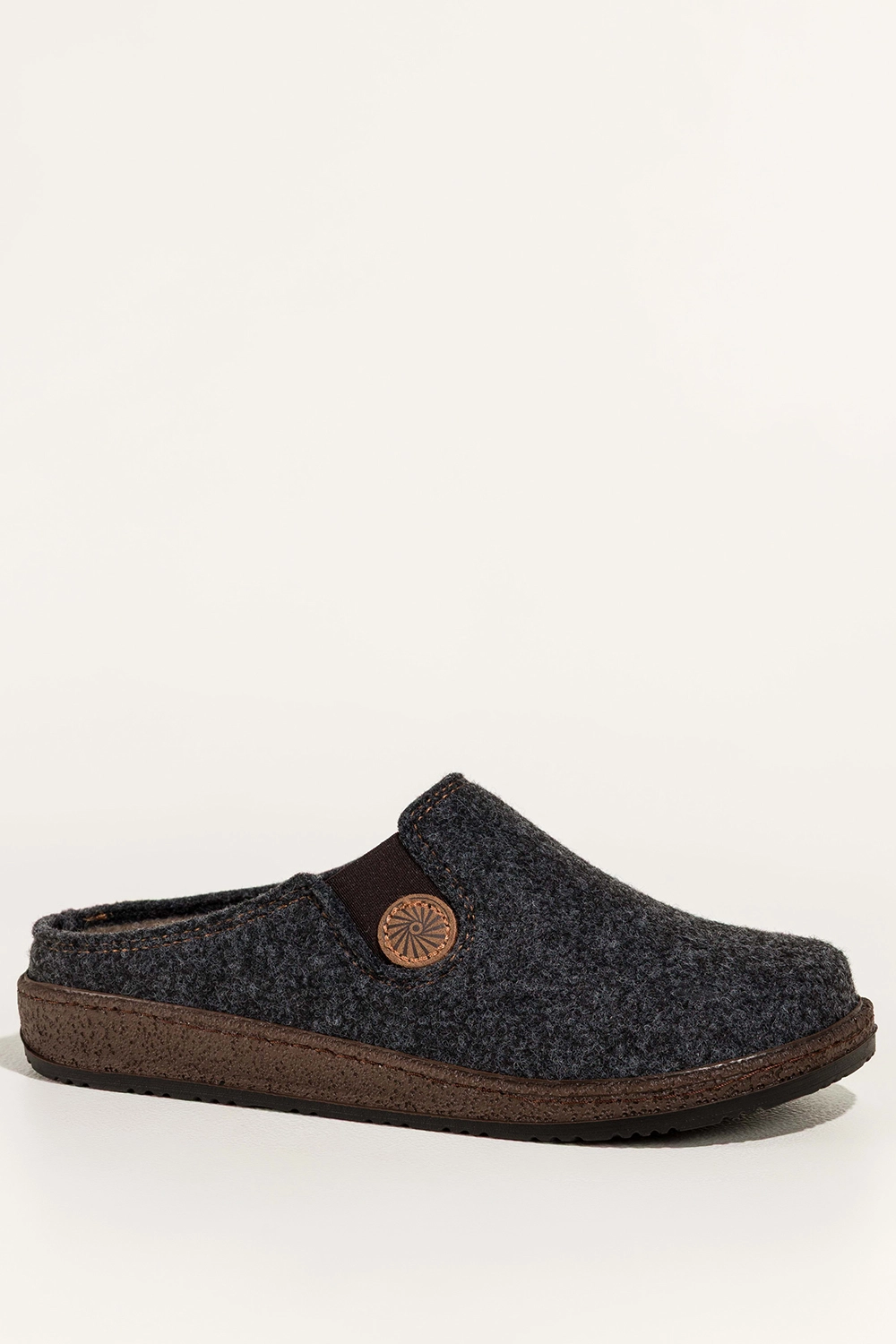 Subtelna ozdoba oraz guma wszyta w cholewkę dodają charakteru i ułatwiają dopasowanie kapci do stopy. Wsuwana konstrukcja oraz zaokrąglony nosek gwarantują maksymalną wygodę zakładania i użytkowania. Ich stonowany, grafitowy kolor świetnie komponuje się z domowymi stylizacjami, od luźnych dresów po miękkie szlafroki, oferując niezrównaną uniwersalność.