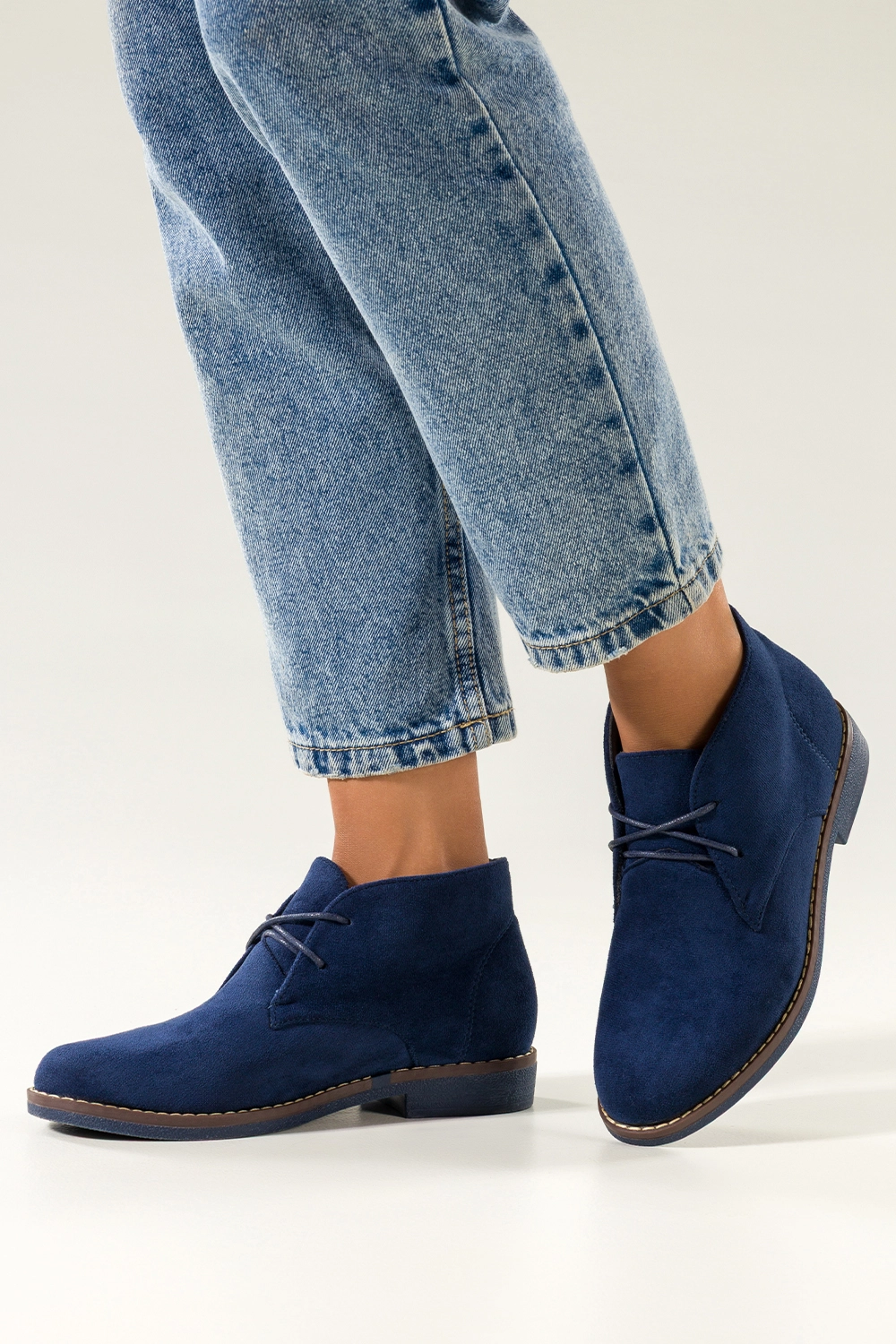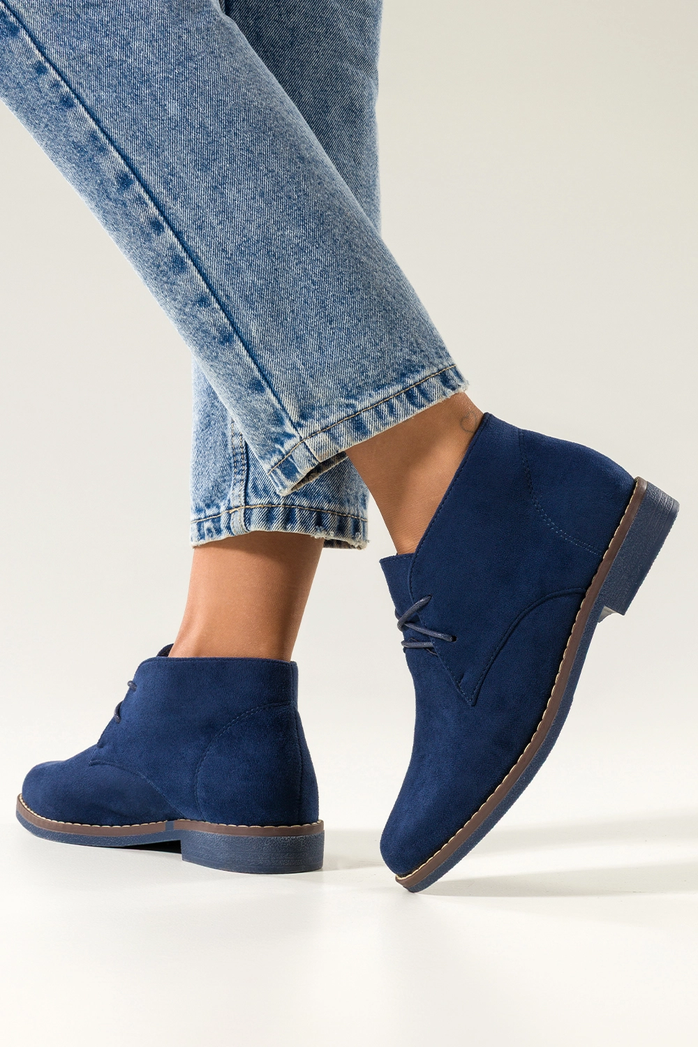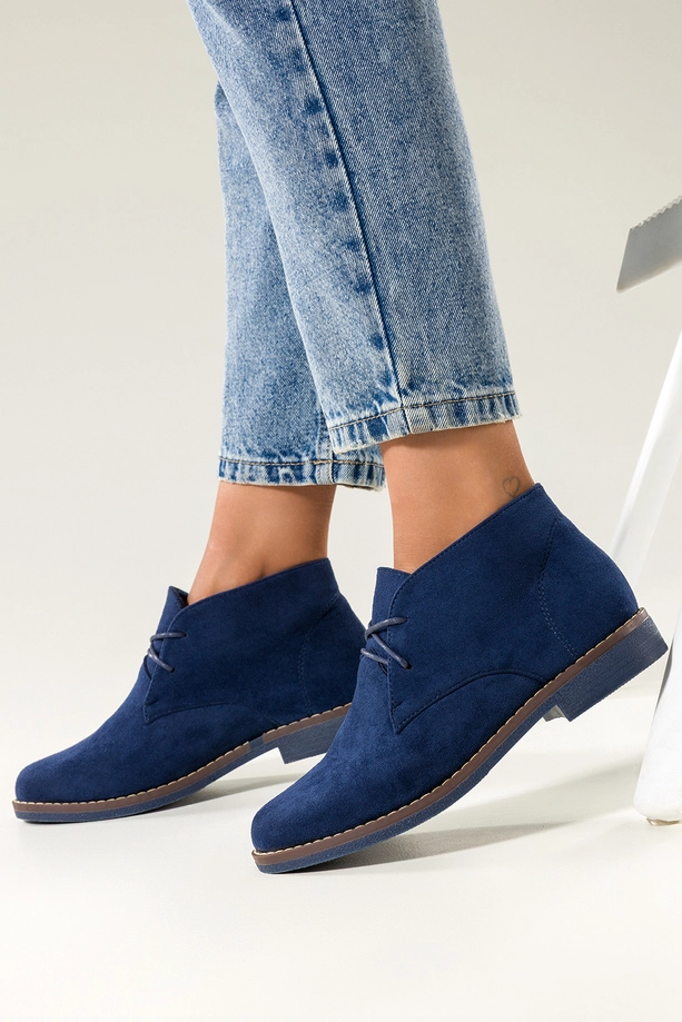 Granatowe botki damskie na płaskiej podeszwie z przeszyciami sznurowane Casu model 8997-3 wykonane zostały z wysokogatunkowego, miękkiego zamszu ekologicznego, który łączy elegancję z troską o środowisko. Precyzyjne przeszycia i solidna konstrukcja zapewniają trwałość na lata, a wnętrze ocieplane przyjemnym kocem obuwniczym gwarantuje ciepło nawet w najchłodniejsze dni. Zaokrąglony nosek i anatomiczny kształt sprawiają, że buty dopasowują się idealnie do stopy, oferując komfort przez cały dzień.