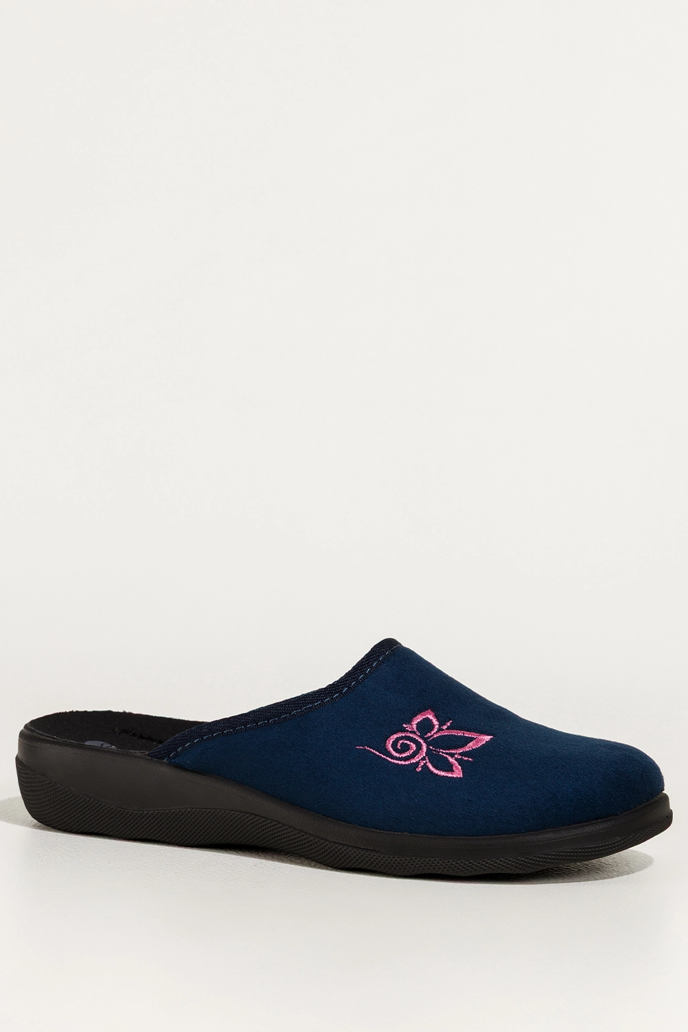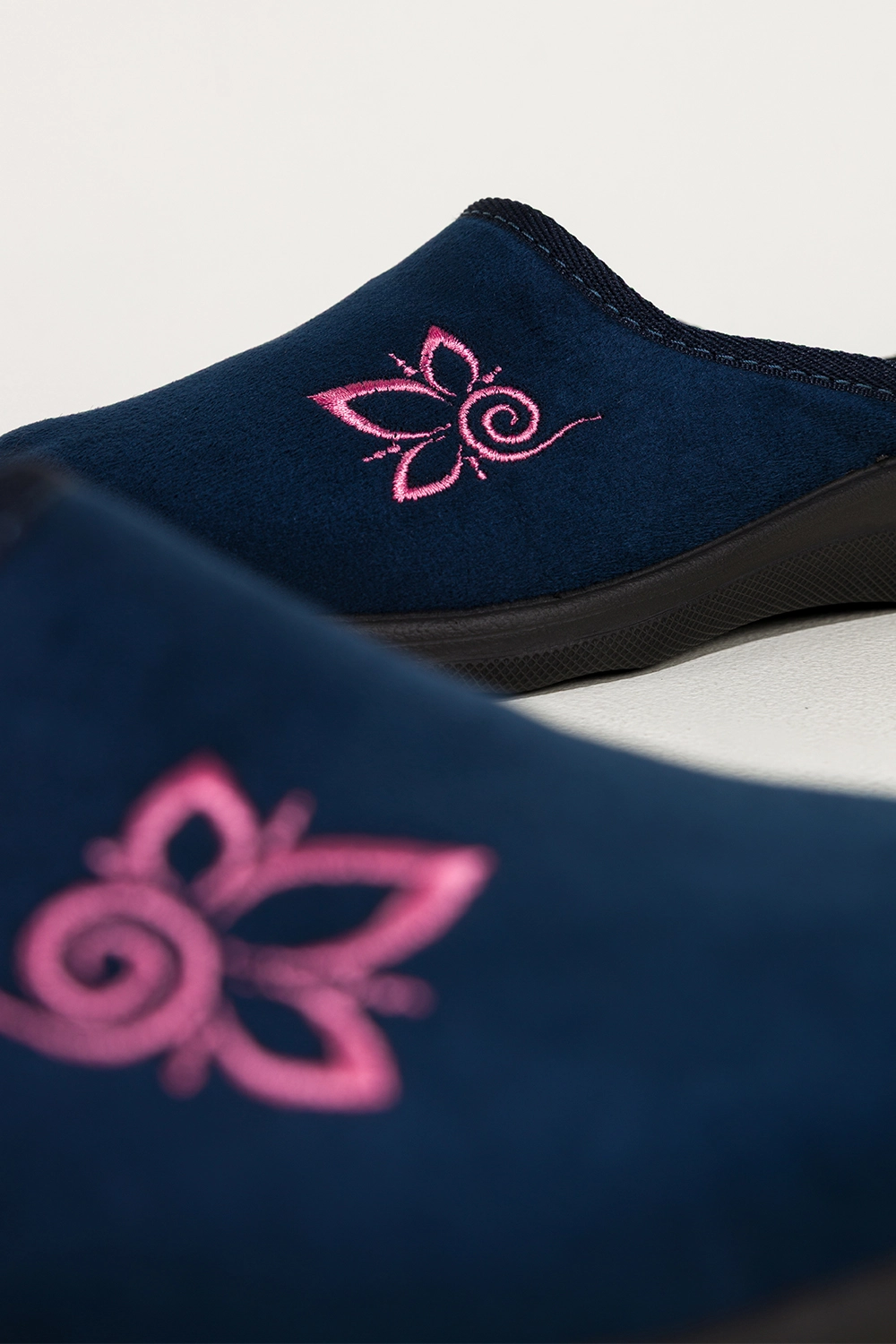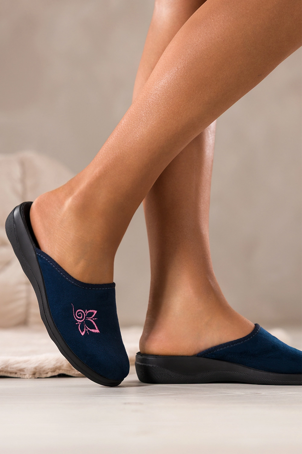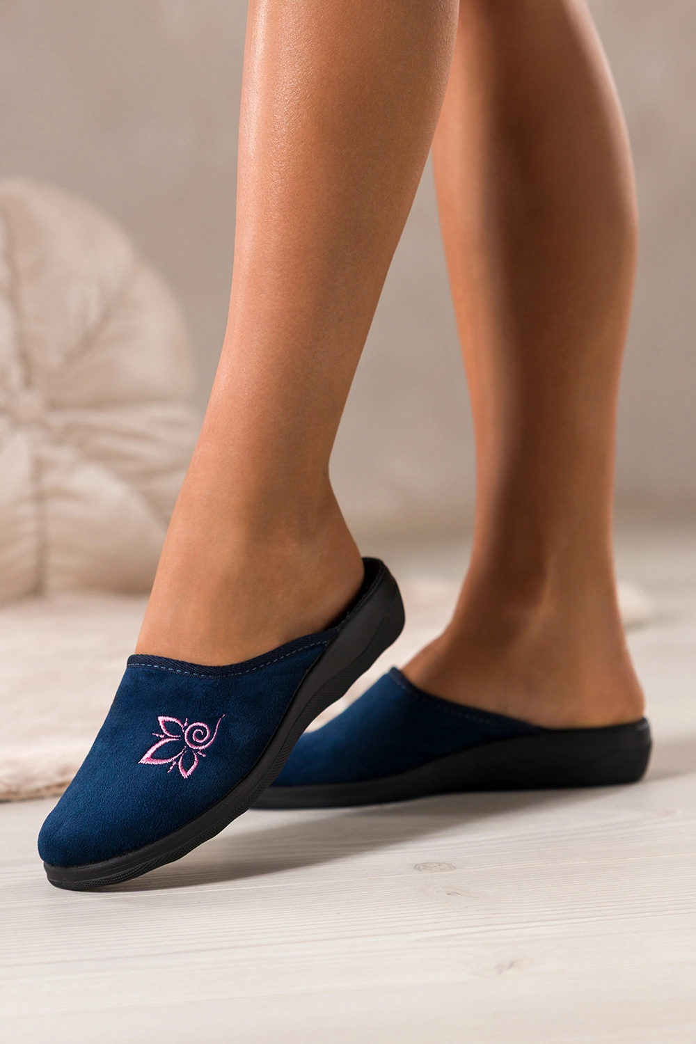 Kapcie wyróżnia ozdobny haftowany kwiat na cholewce, który nadaje im kobiecego uroku i delikatności. Wsuwana konstrukcja pozwala na szybkie zakładanie, co czyni je praktycznym wyborem na co dzień. Zaokrąglony nosek zapewnia swobodę ruchu palców, a uniwersalny granatowy kolor doskonale komponuje się z różnymi stylami odzieży domowej, od klasycznych szlafroków po nowoczesne zestawy homewear.