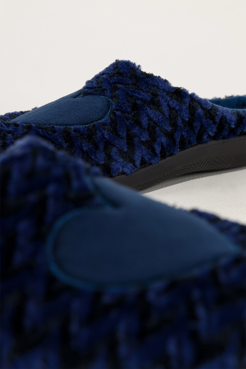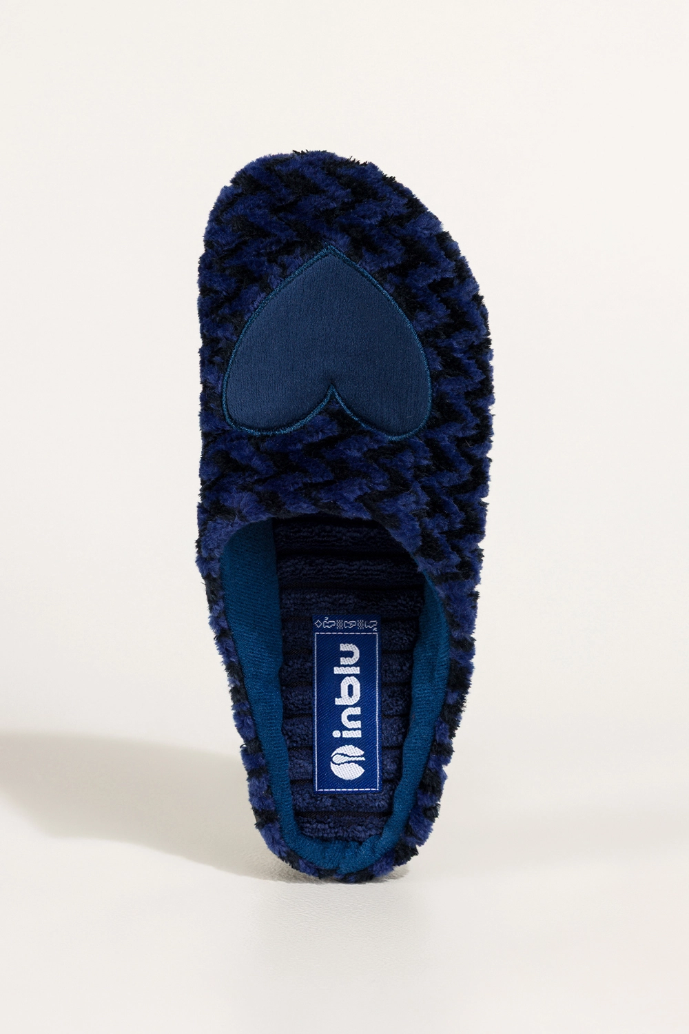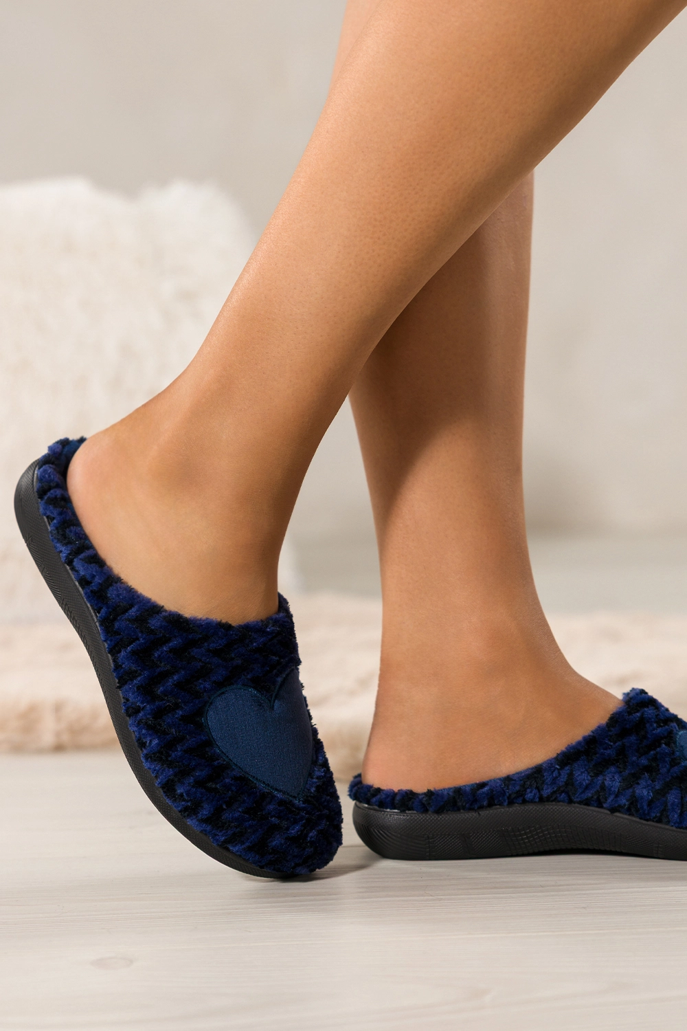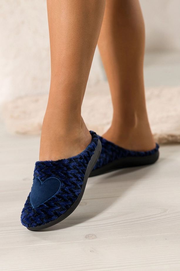 Ten model świetnie sprawdzi się zarówno podczas relaksu w domowym zaciszu, jak i w stylowych, codziennych domowych stylizacjach. Subtelny granatowy kolor z dekoracyjnym motywem serca pozwala łatwo dopasować je do każdego stroju, tworząc spójny i estetyczny look. Wsuwana konstrukcja gwarantuje wygodę zakładania i zdejmowania.
