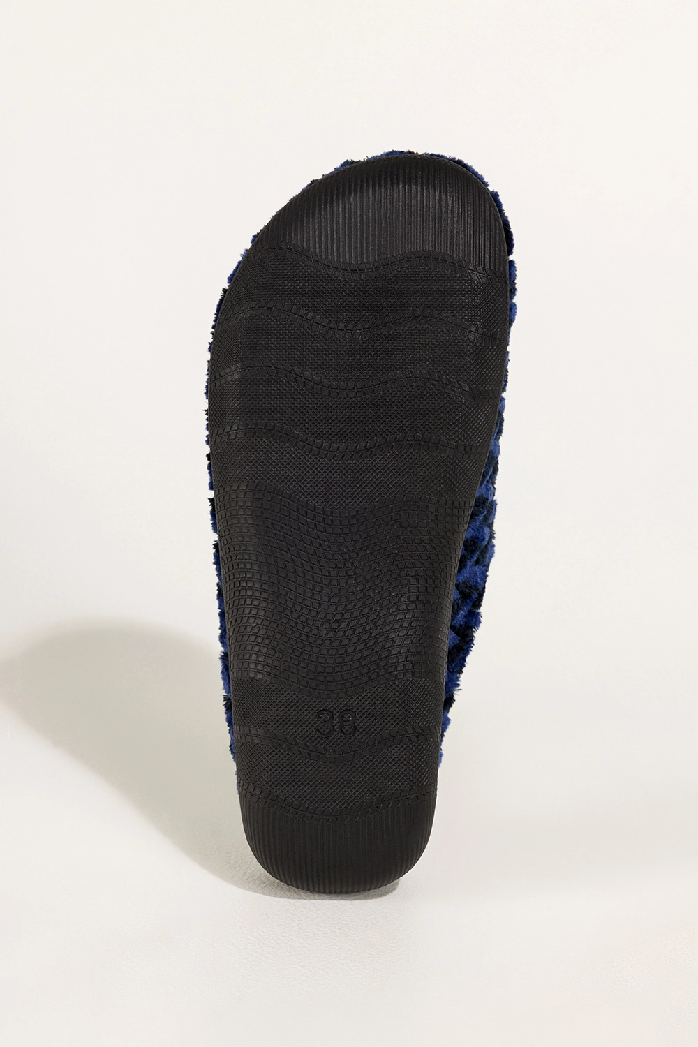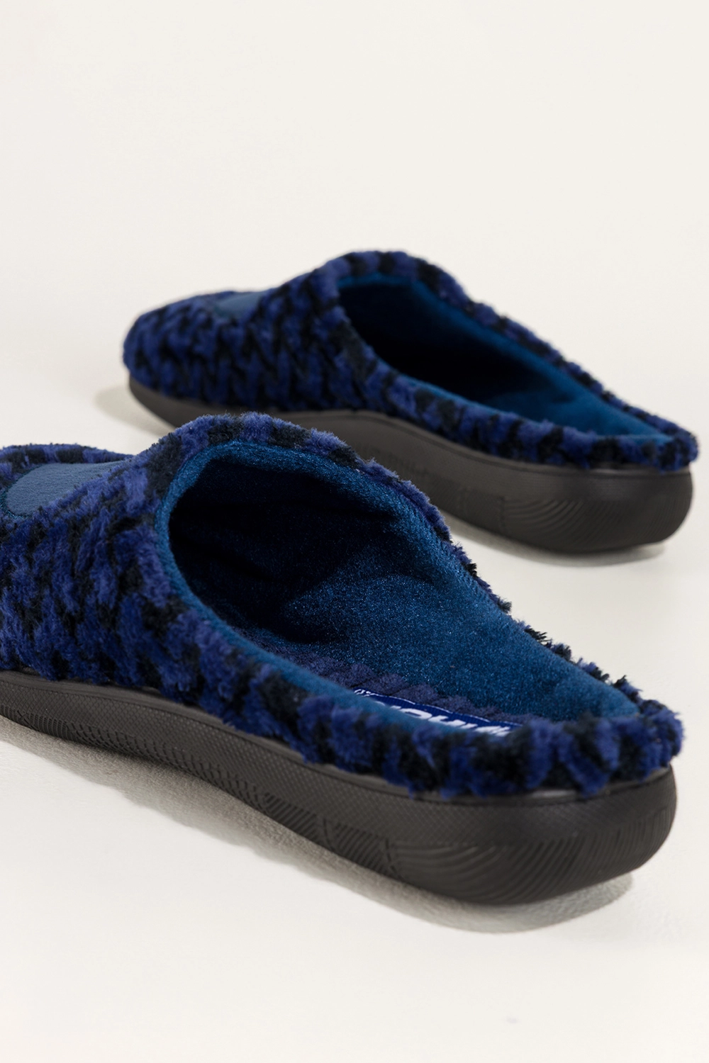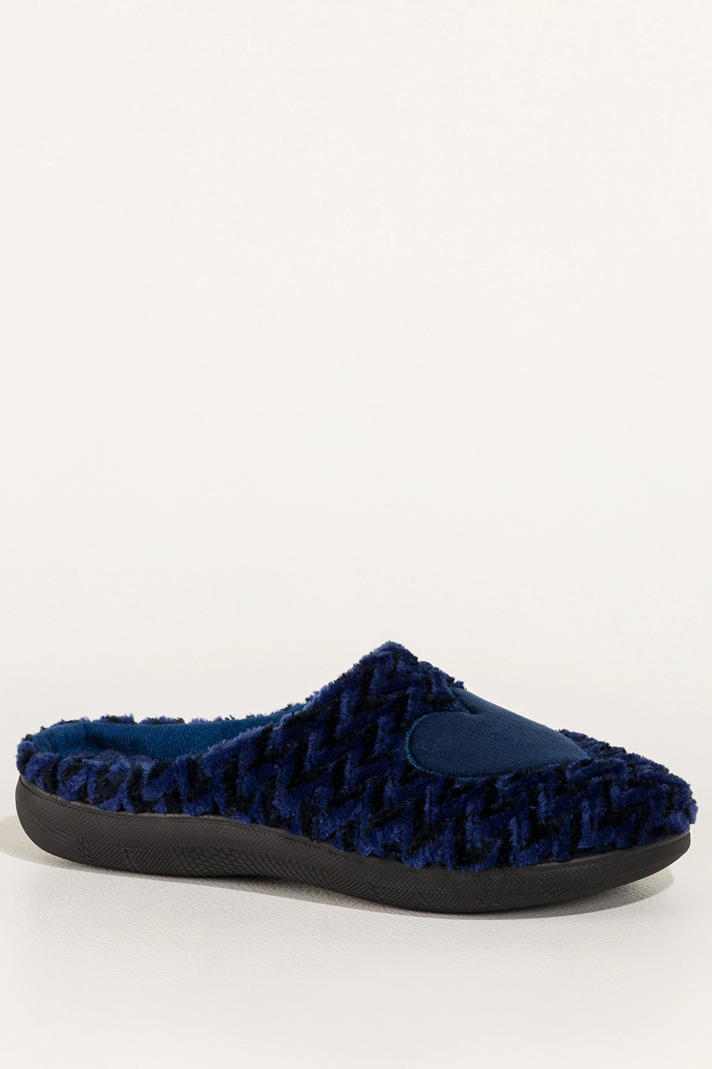 Ten model świetnie sprawdzi się zarówno podczas relaksu w domowym zaciszu, jak i w stylowych, codziennych domowych stylizacjach. Subtelny granatowy kolor z dekoracyjnym motywem serca pozwala łatwo dopasować je do każdego stroju, tworząc spójny i estetyczny look. Wsuwana konstrukcja gwarantuje wygodę zakładania i zdejmowania.