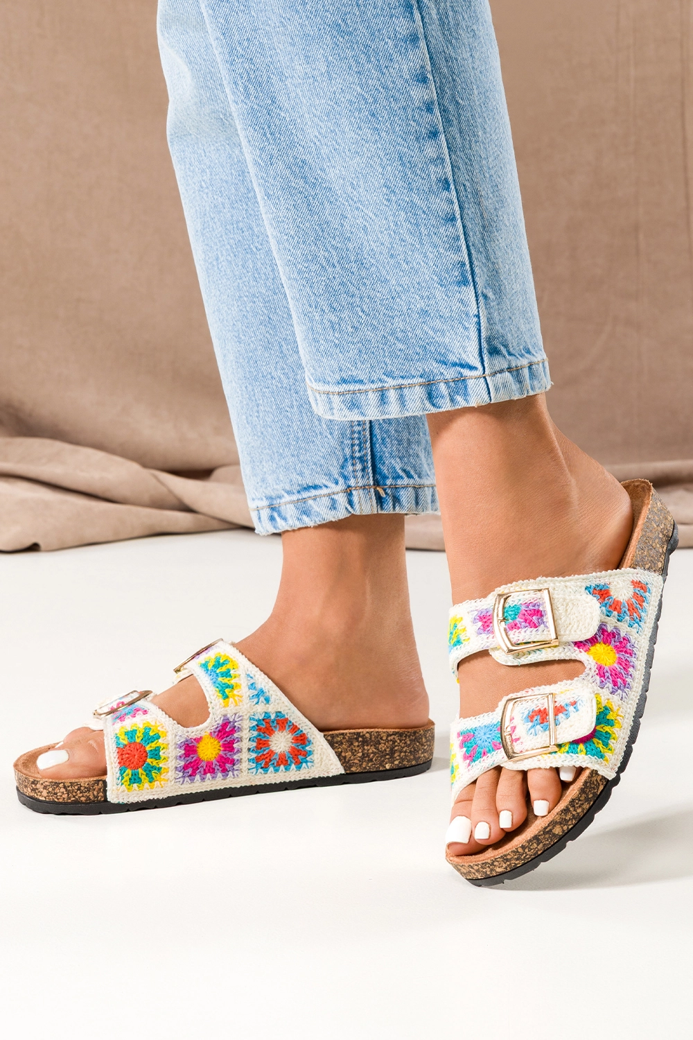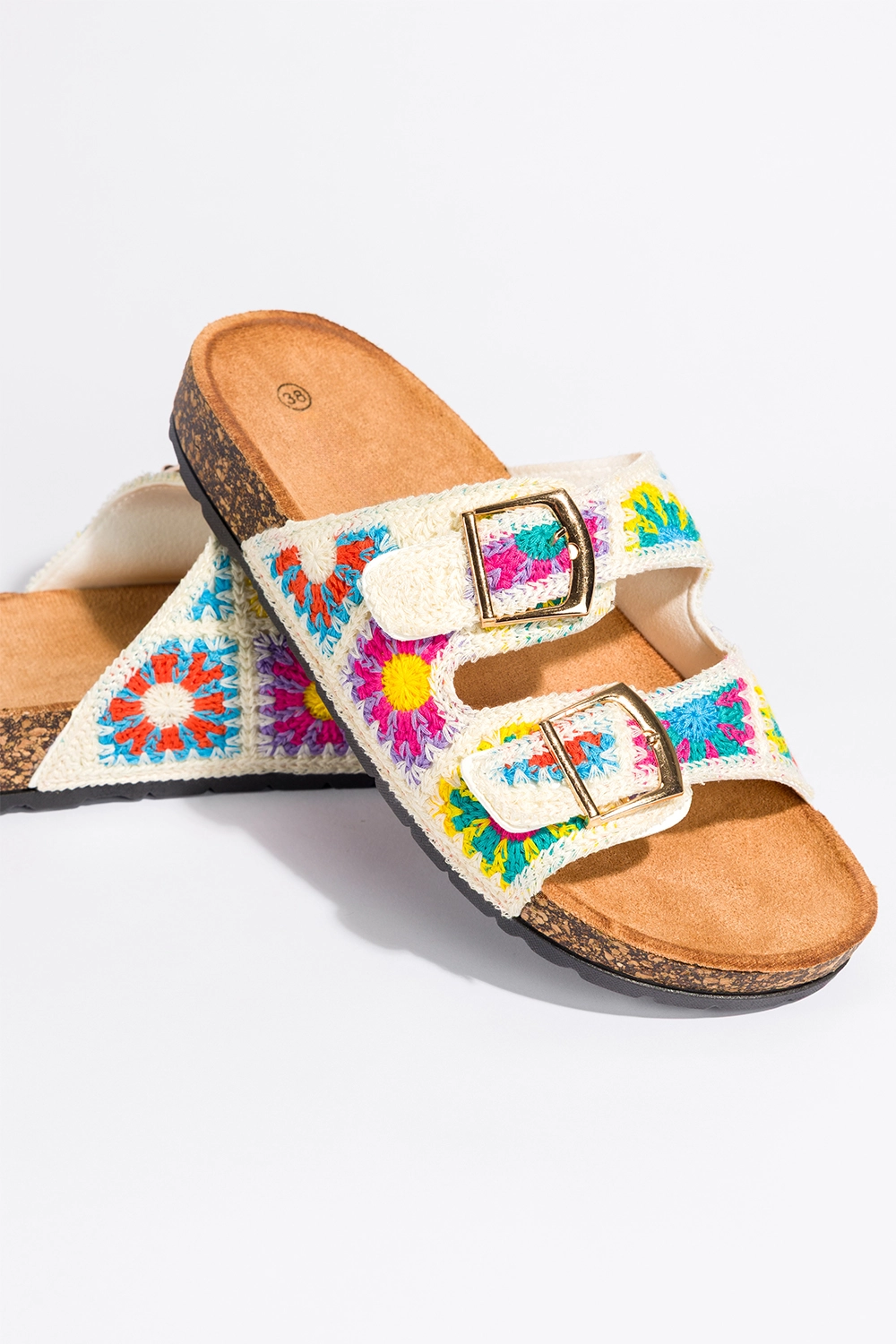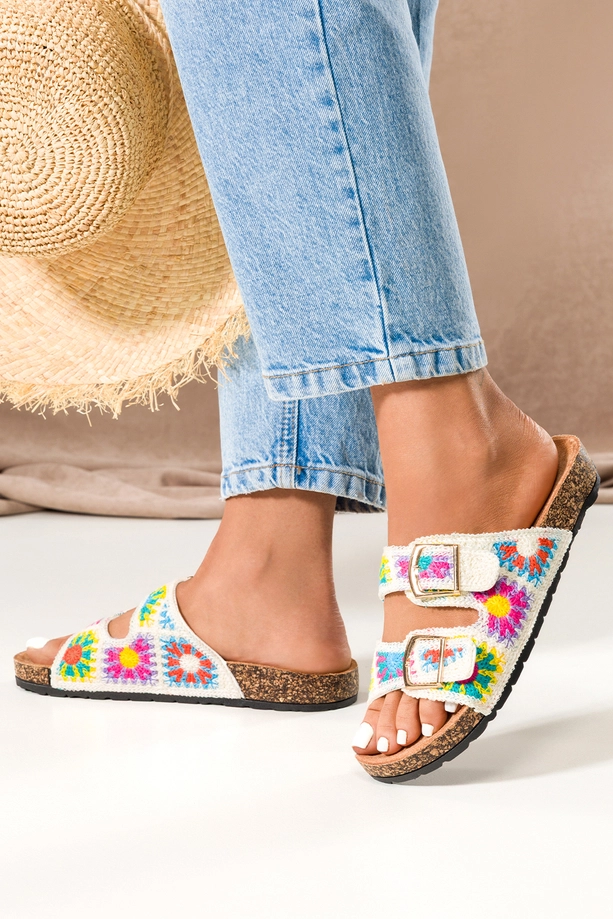 Kremowe klapki damskie haftowane kolorowe kwiaty paski ze złotymi klamrami profilowana korkowa podeszwa Carla 2431-2