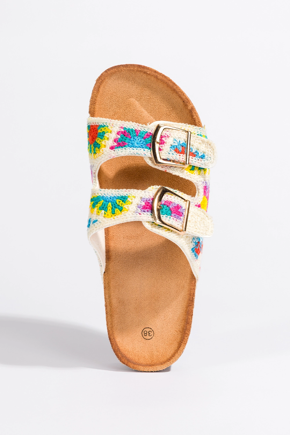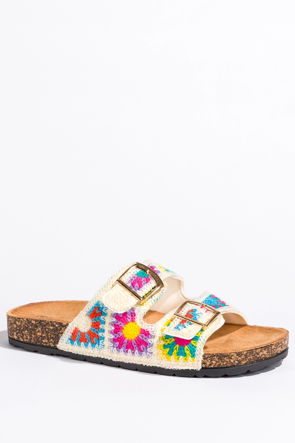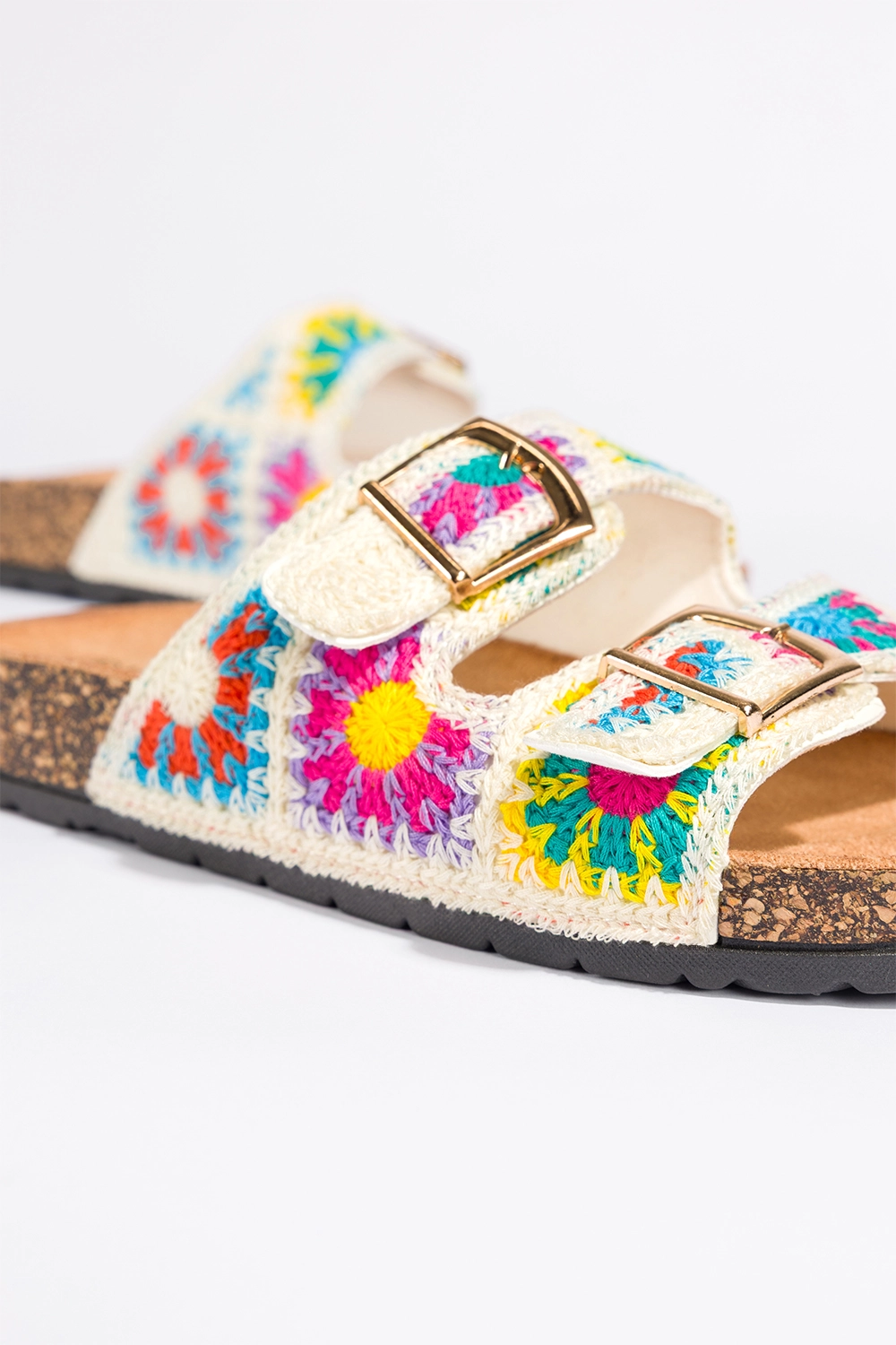Kremowe klapki damskie haftowane kolorowe kwiaty paski ze złotymi klamrami profilowana korkowa podeszwa Carla 2431-2