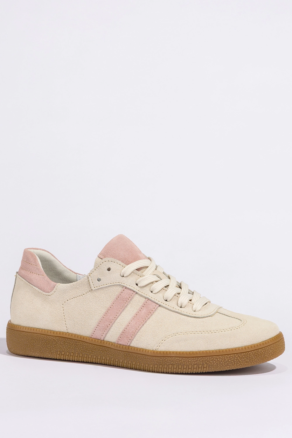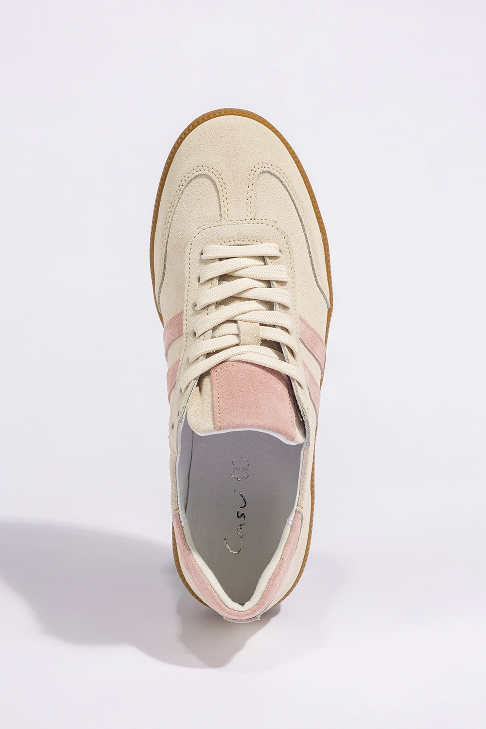 Kremowe sneakersy skórzane damskie buty sportowe z różowymi wstawkami sznurowane PRODUKT POLSKI Casu N1068 to absolutny must-have dla każdej kobiety, która ceni sobie połączenie elegancji, wygody i ponadczasowego stylu. Te stylowe buty wykonane zostały z najwyższej jakości naturalnej skóry zamszowej, która nie tylko zachwyca swoją miękkością i estetyką, ale także zapewnia wyjątkowy komfort użytkowania przez cały dzień. Delikatna, kremowa kolorystyka z subtelnymi różowymi wstawkami sprawia, że sneakersy są niezwykle kobiece i lekkie wizualnie, co idealnie wpisuje się w aktualne trendy. Model to doskonały wybór zarówno na co dzień, jak i na bardziej casualowe okazje – pasuje zarówno do jeansów, jak i do zwiewnych sukienek.