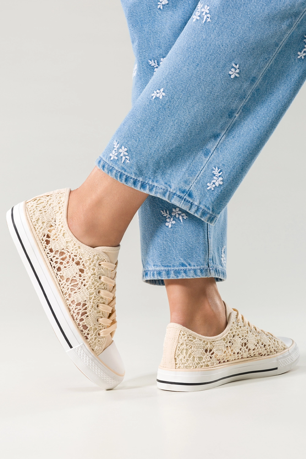 Stylizacyjna uniwersalność i modny wygląd czynią z kremowych trampek idealny wybór dla każdej kobiety, która pragnie wyglądać stylowo bez rezygnacji z wygody. Dzięki eleganckiej koronce i neutralnej barwie, obuwie to można z łatwością dopasować zarówno do zwiewnych sukienek, jak i klasycznych jeansów czy krótkich szortów. Model EV-97 to świetna propozycja na letnie festiwale, spacery po parku, niezobowiązujące spotkania czy nawet bardziej formalne okazje, gdzie delikatny styl butów podkreśli kobiecość stylizacji. Granatowe sznurówki dodają charakteru i przełamują delikatność cholewki, czyniąc trampki jeszcze bardziej wyrazistymi. To produkt, który pasuje niemal do wszystkiego – od romantycznych, pastelowych zestawów, po nowoczesne, miejskie outfity.