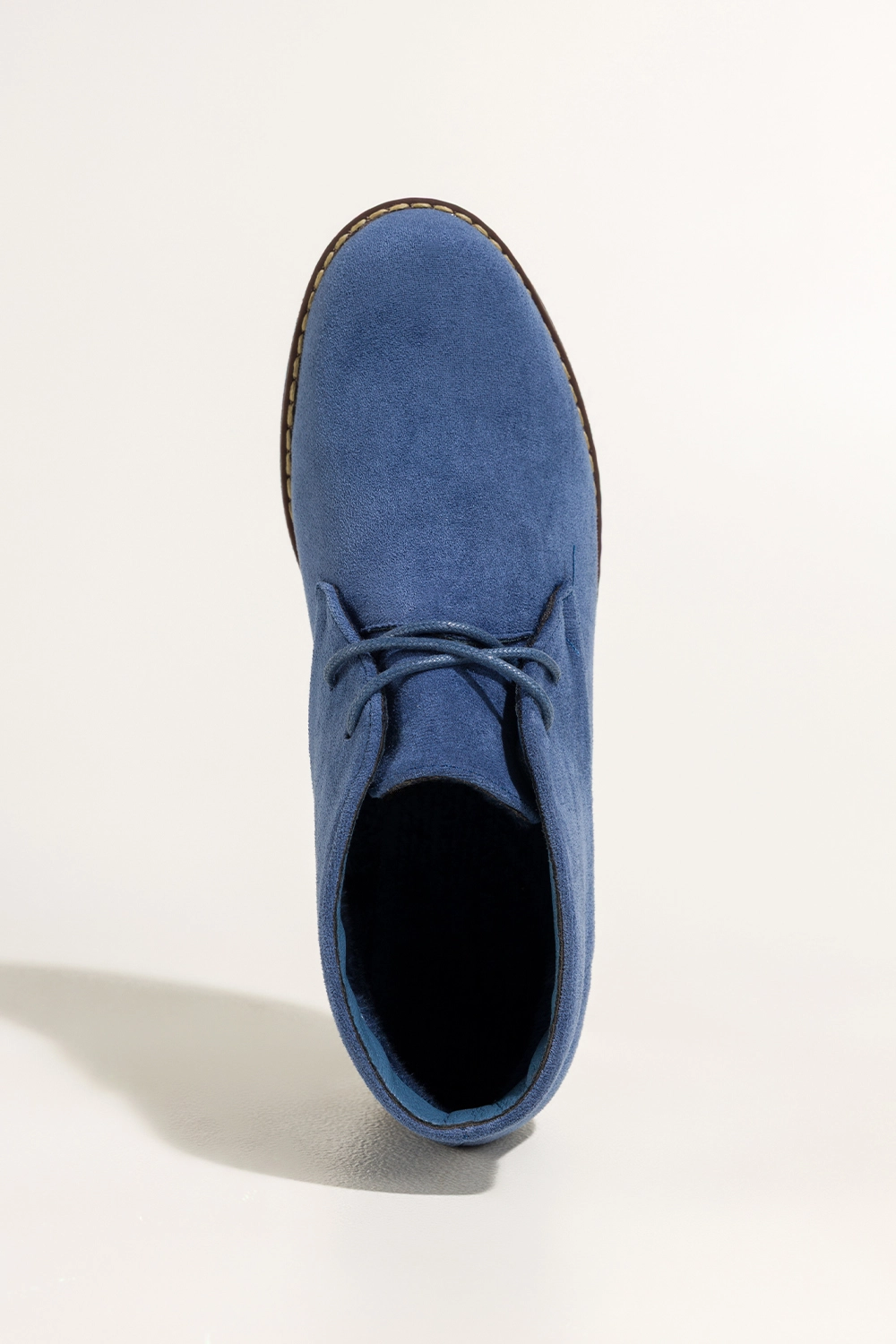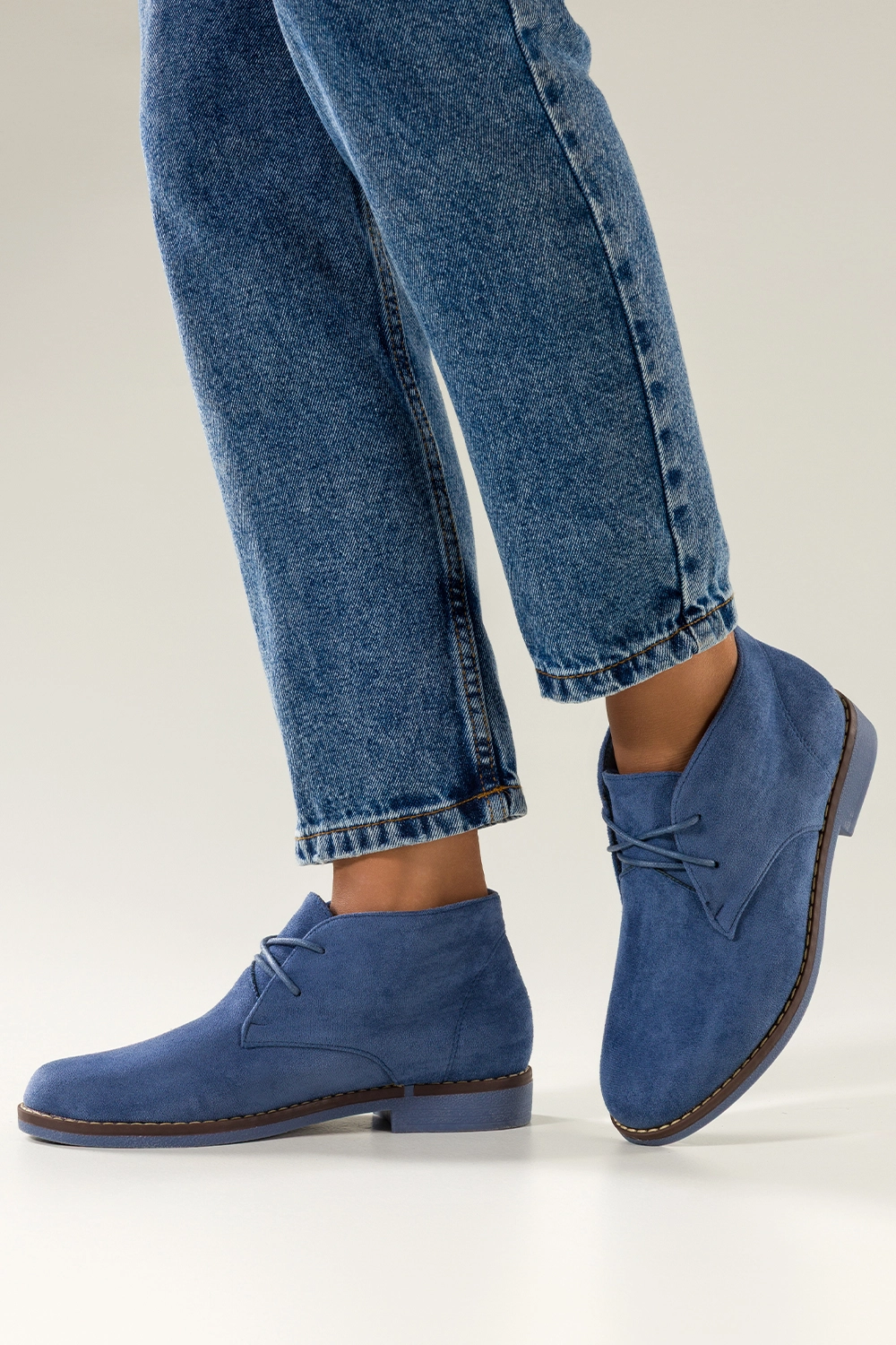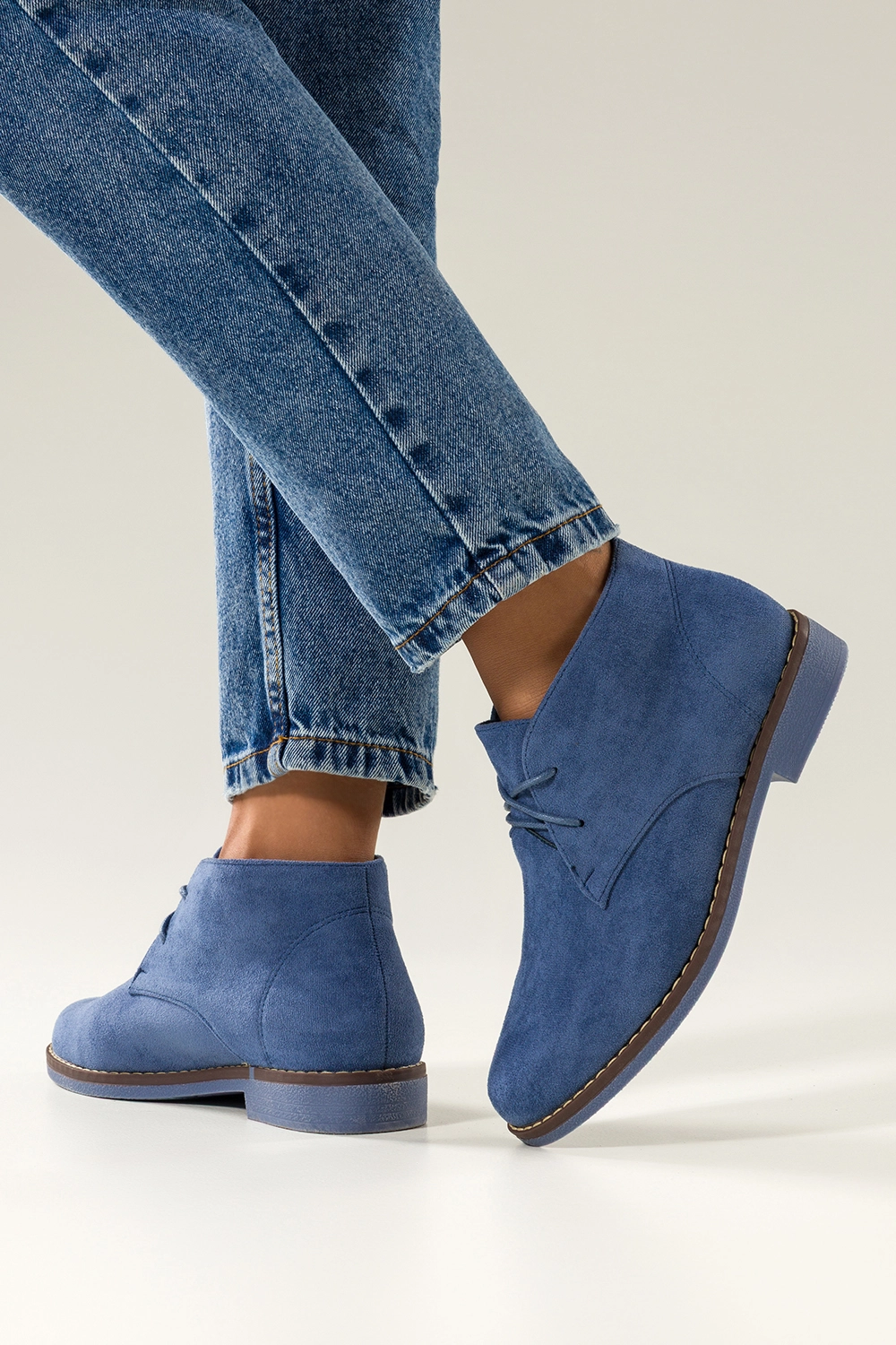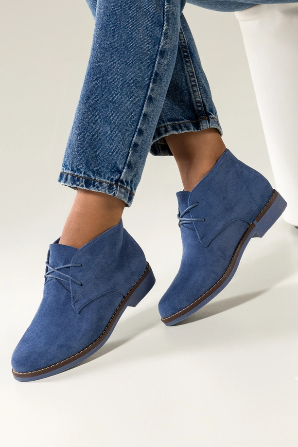 Niebieskie botki damskie na płaskiej podeszwie z przeszyciami sznurowane Casu model 8997-4, wyjątkowy styl na chłodniejsze dni. Wykonane z wysokogatunkowego zamszu ekologicznego, zachwycają miękkością w dotyku i solidnym wykonaniem. Wnętrze botków zostało starannie ocieplone przyjemnym kocem obuwniczym, dzięki czemu stopy pozostają ciepłe nawet w mroźne poranki. To idealny wybór dla kobiet, które cenią komfort bez kompromisów w kwestii stylu.