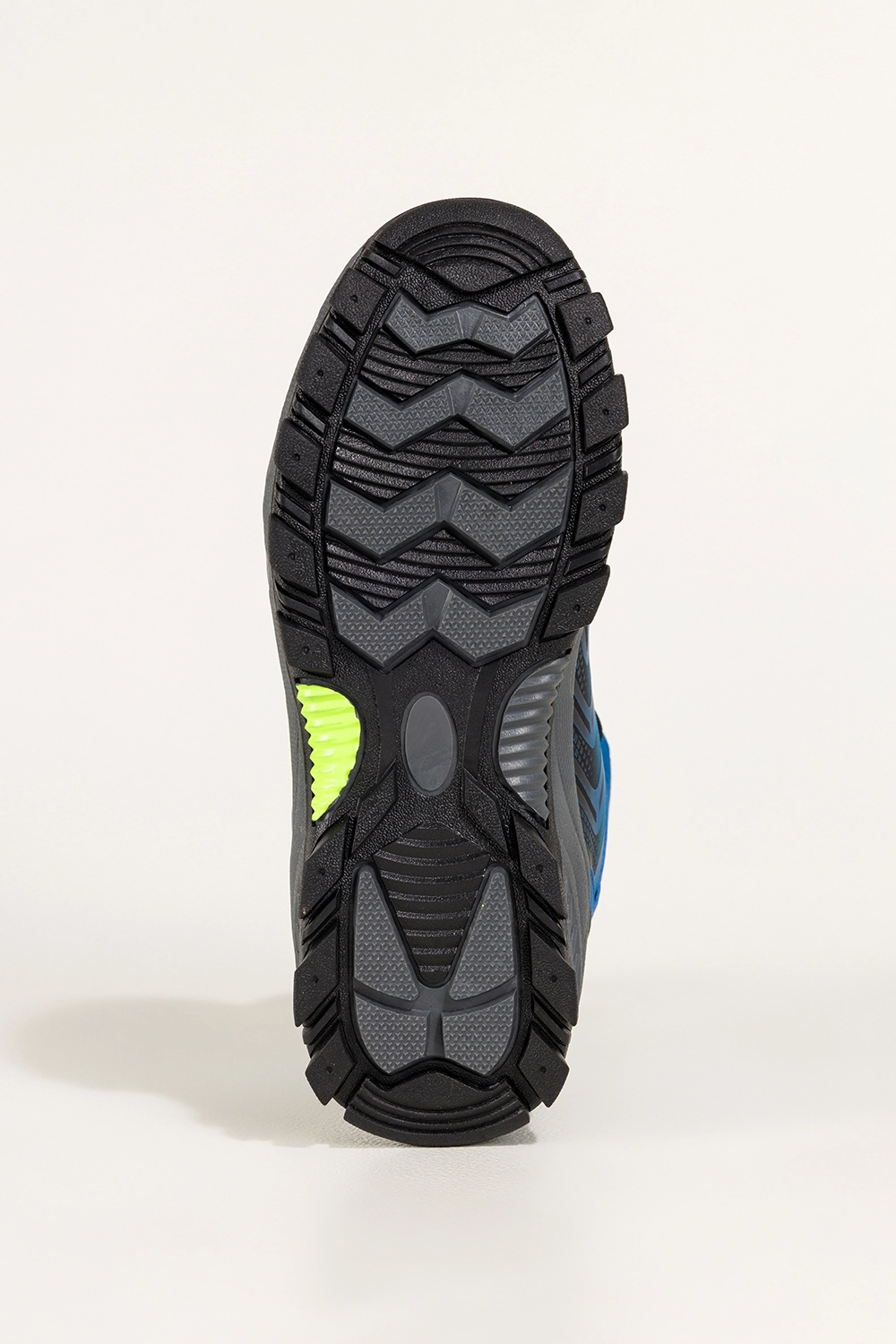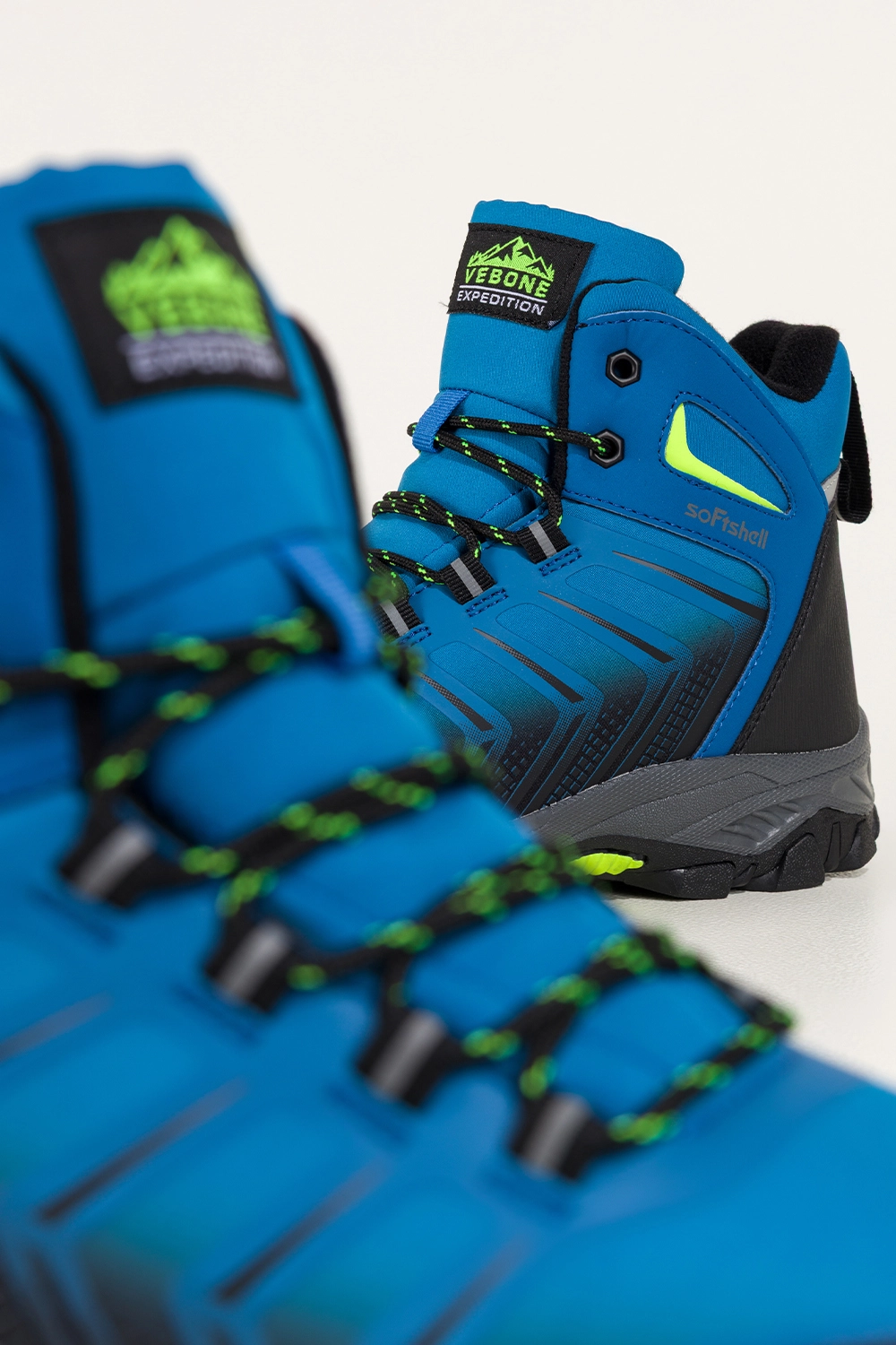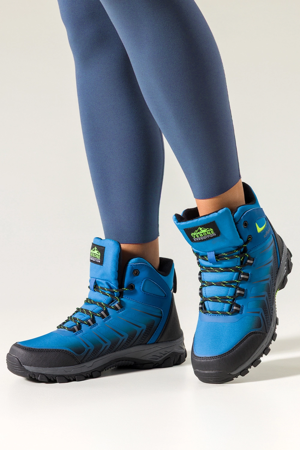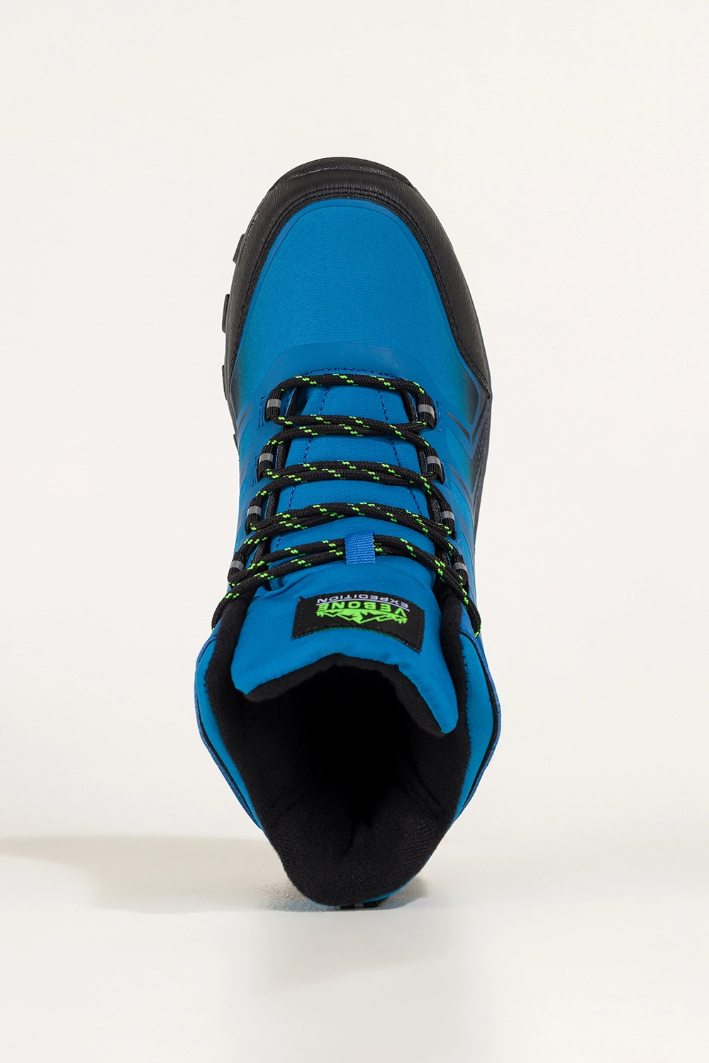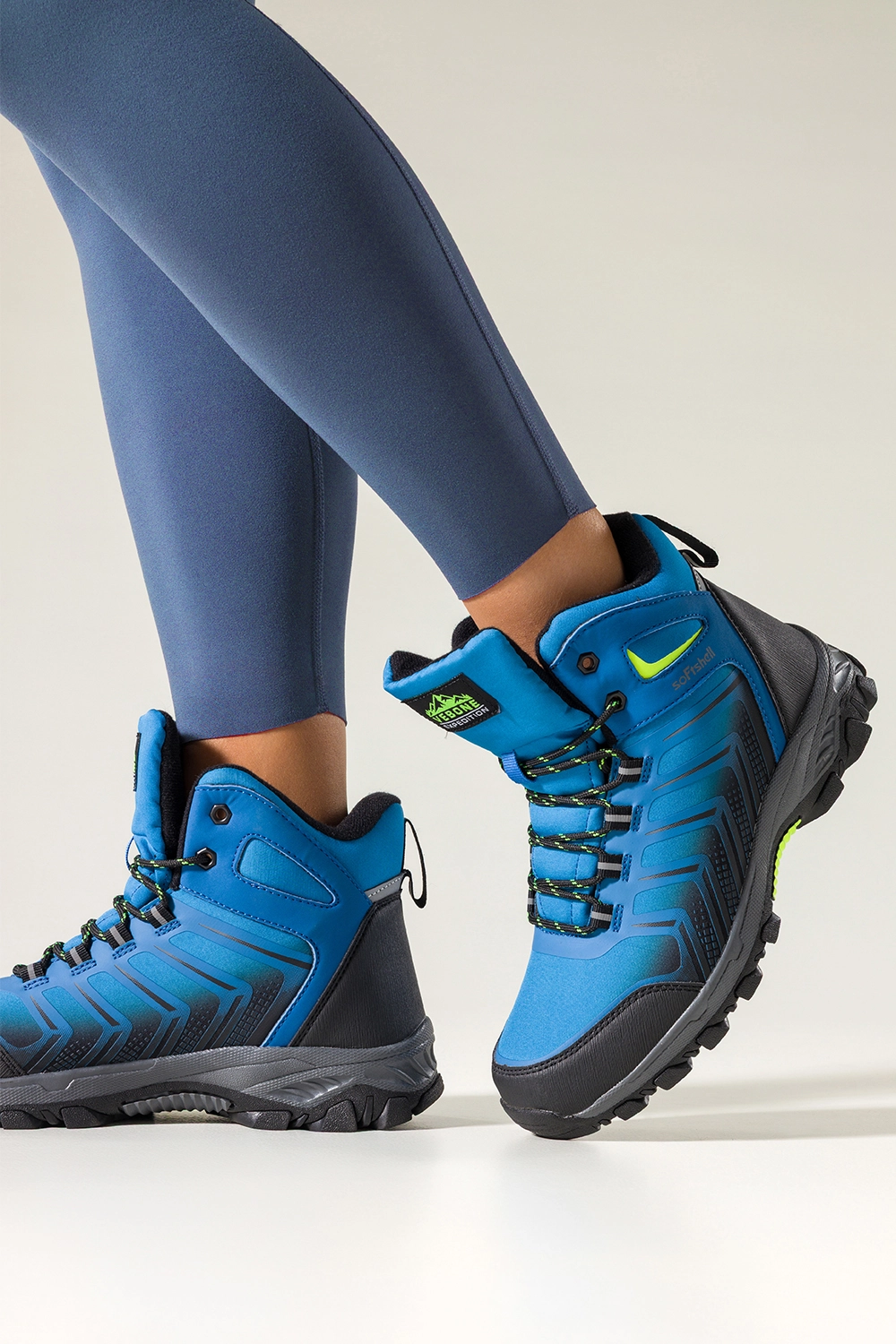 Czarne wstawki na cholewce w subtelny sposób kontrastują z intensywnym odcieniem niebieskiego, tworząc efektowny design, który wyróżnia się na tle klasycznych modeli trekkingowych. Buty posiadają sznurowanie umożliwiające indywidualne dopasowanie do stopy, a zaokrąglony nosek podkreśla ich uniwersalny charakter. Wysoka cholewka stabilizuje kostkę i zwiększa bezpieczeństwo w trudnym terenie. To idealne obuwie zarówno do aktywnego wypoczynku, jak i casualowych, outdoorowych stylizacji.