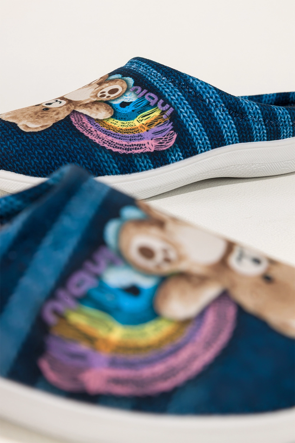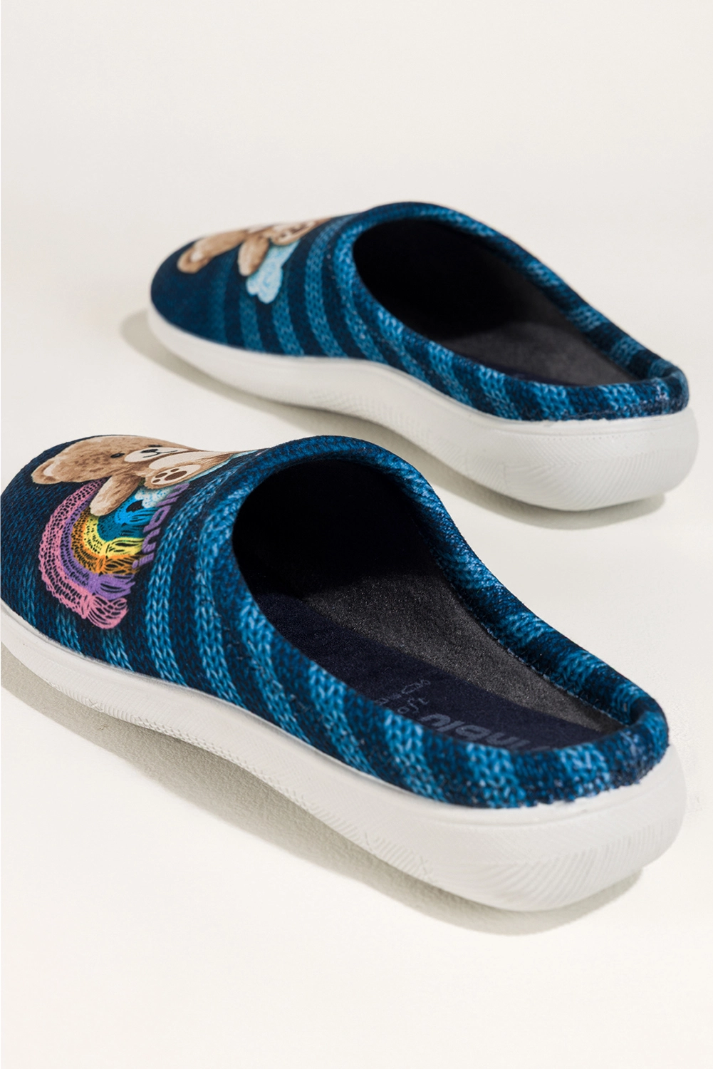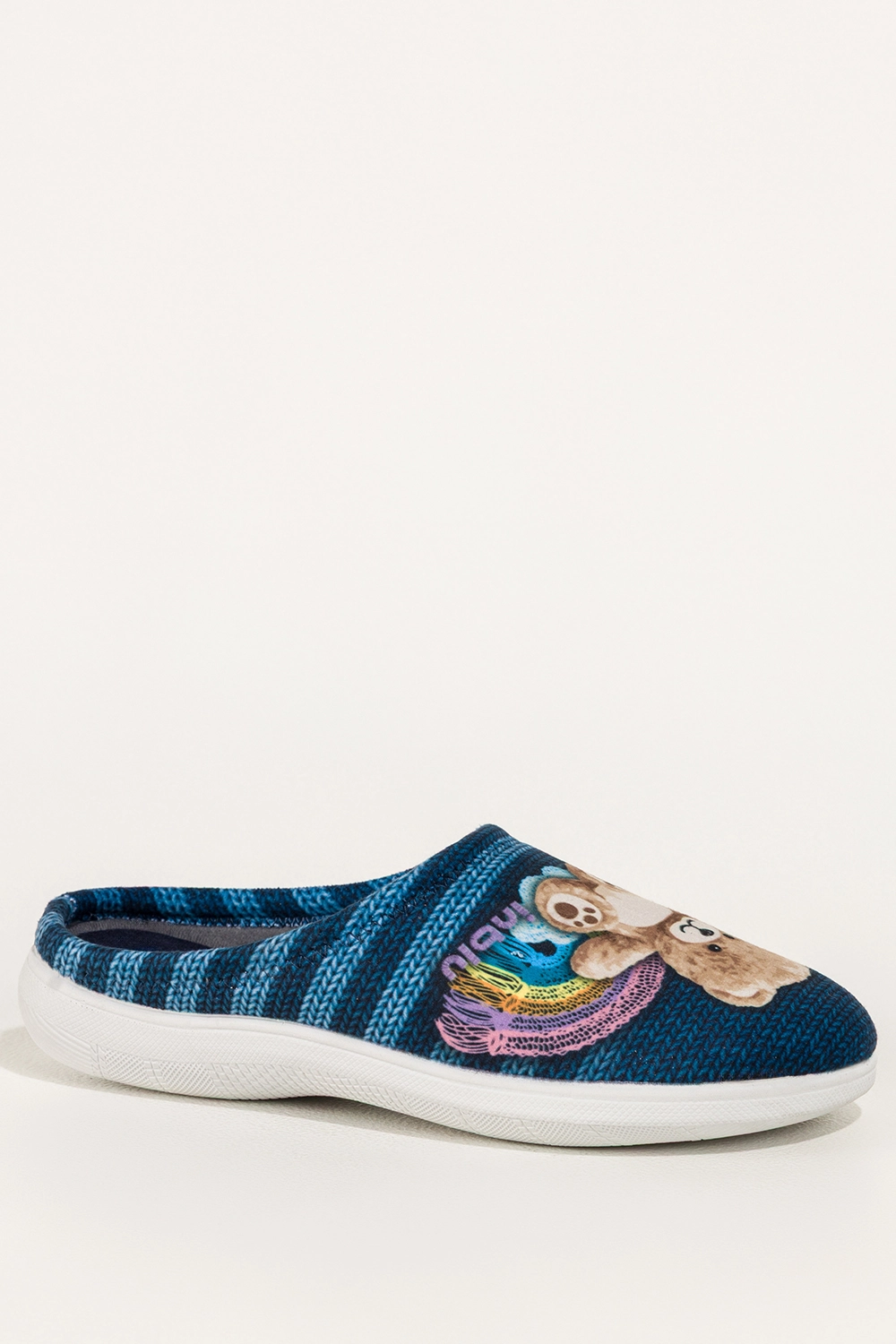 Cholewka w modny, pasiasty wzór z uroczą naszywką misia dodaje obuwiu niepowtarzalnego charakteru. Subtelny klin w podeszwie poprawia postawę i dodaje lekkości krokowi, sprawiając, że kapcie prezentują się elegancko nawet w domowych stylizacjach.