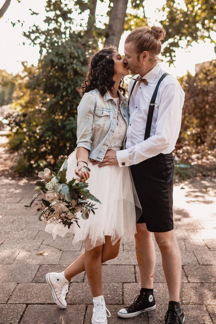 Na koniec mamy dla ciebie nieco ekstrawaganckie zestawienie. Niektóre kobiety wręcz nie wyobrażają sobie życia bez klasycznych białych trampek. Kochają je do tego stopnia, że wybierają je nawet w najważniejszym dla nich dniu ...a mianowicie, w dniu ślubu! Coraz popularniejsze staje się połączenie wygody z elegancją i stylem glamour, dlatego widok panny młodej w sportowym obuwiu, zamiast szpilek nie jest już niczym dziwnym Wyobraź sobie jak cudownie jest móc przetańczyć całą noc bez bolących stóp w sukni ślubnej i najwygodniejszych białych trampkach. To przełamanie konwencji i wesoła zabawa ze stylem. Trampki, czy adidasy najlepiej prezentują się z krótszymi sukniami ślubnymi w nowoczesnym stylu.