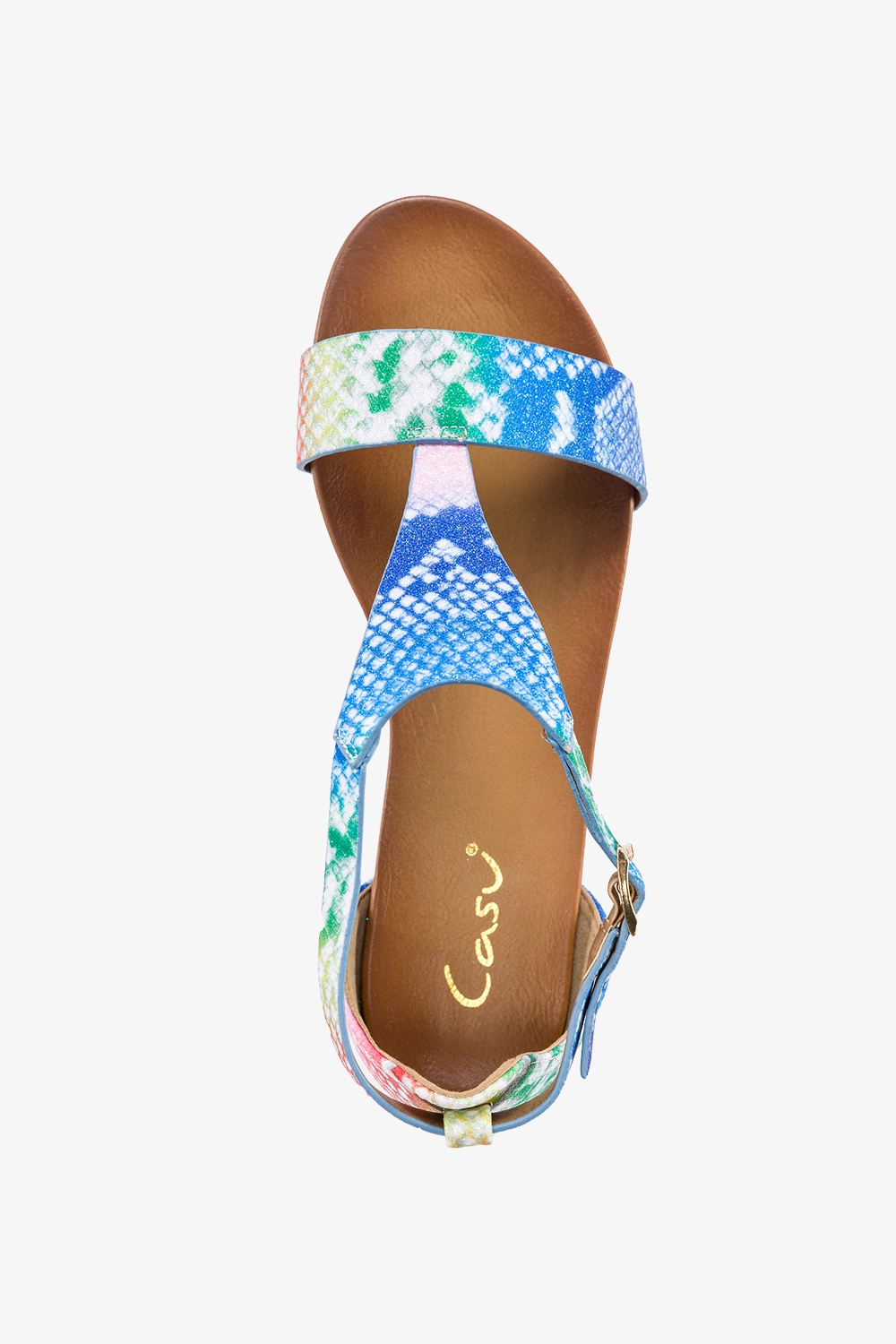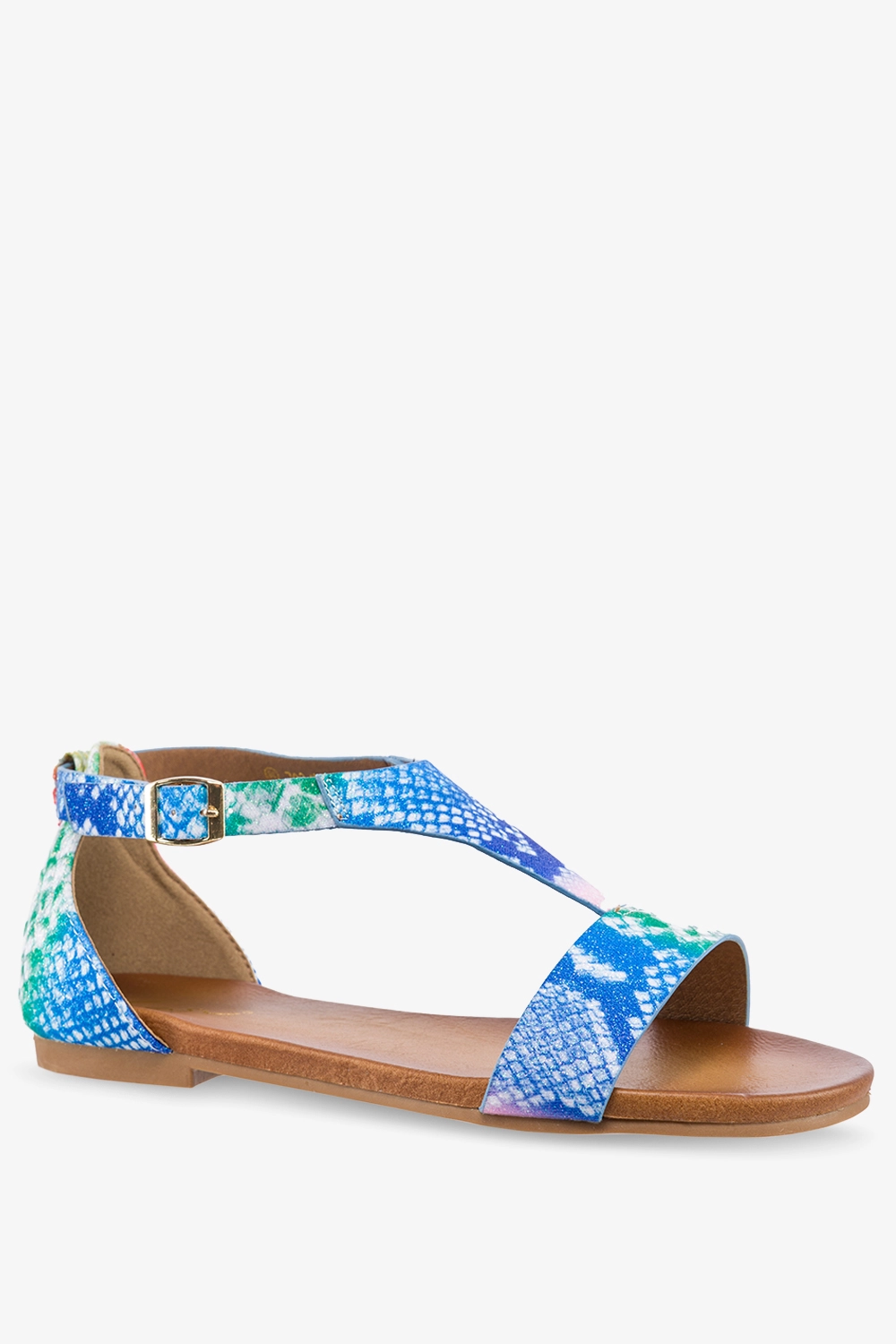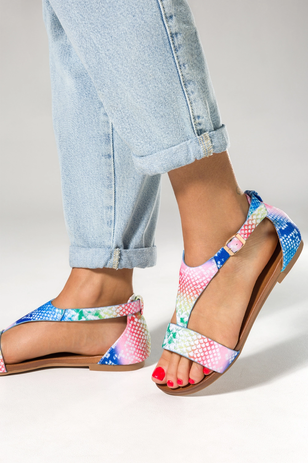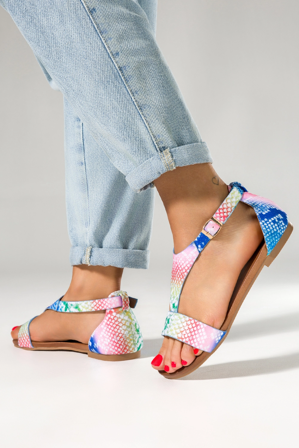Wielokolorowe sandały błyszczące damskie płaskie z zakrytą piętą wzór wężowy Casu K20X4-COL