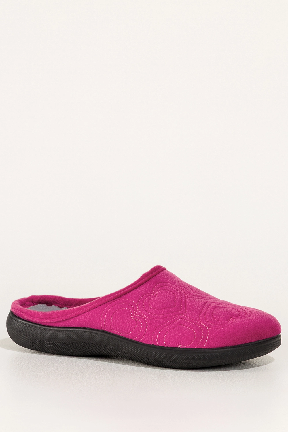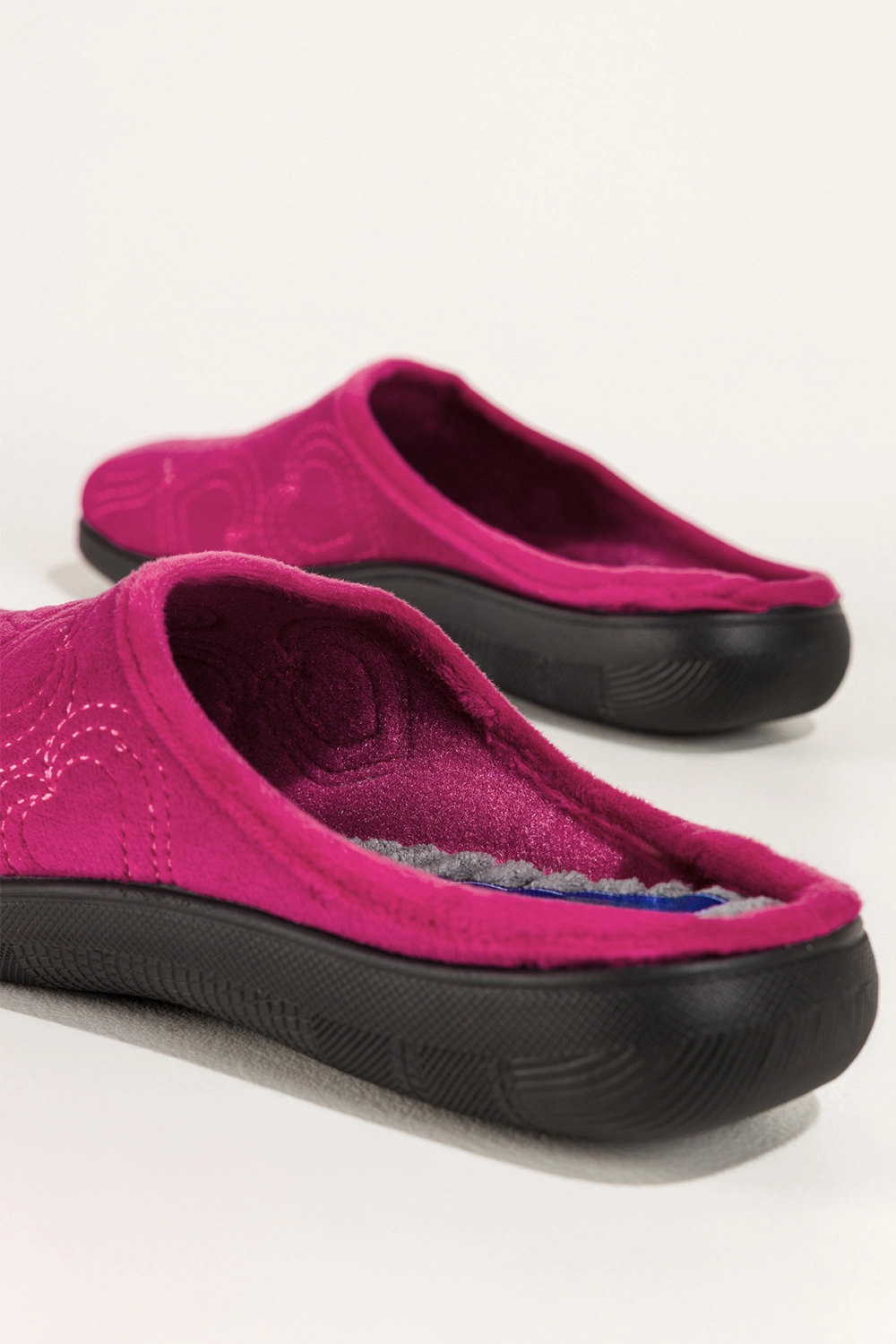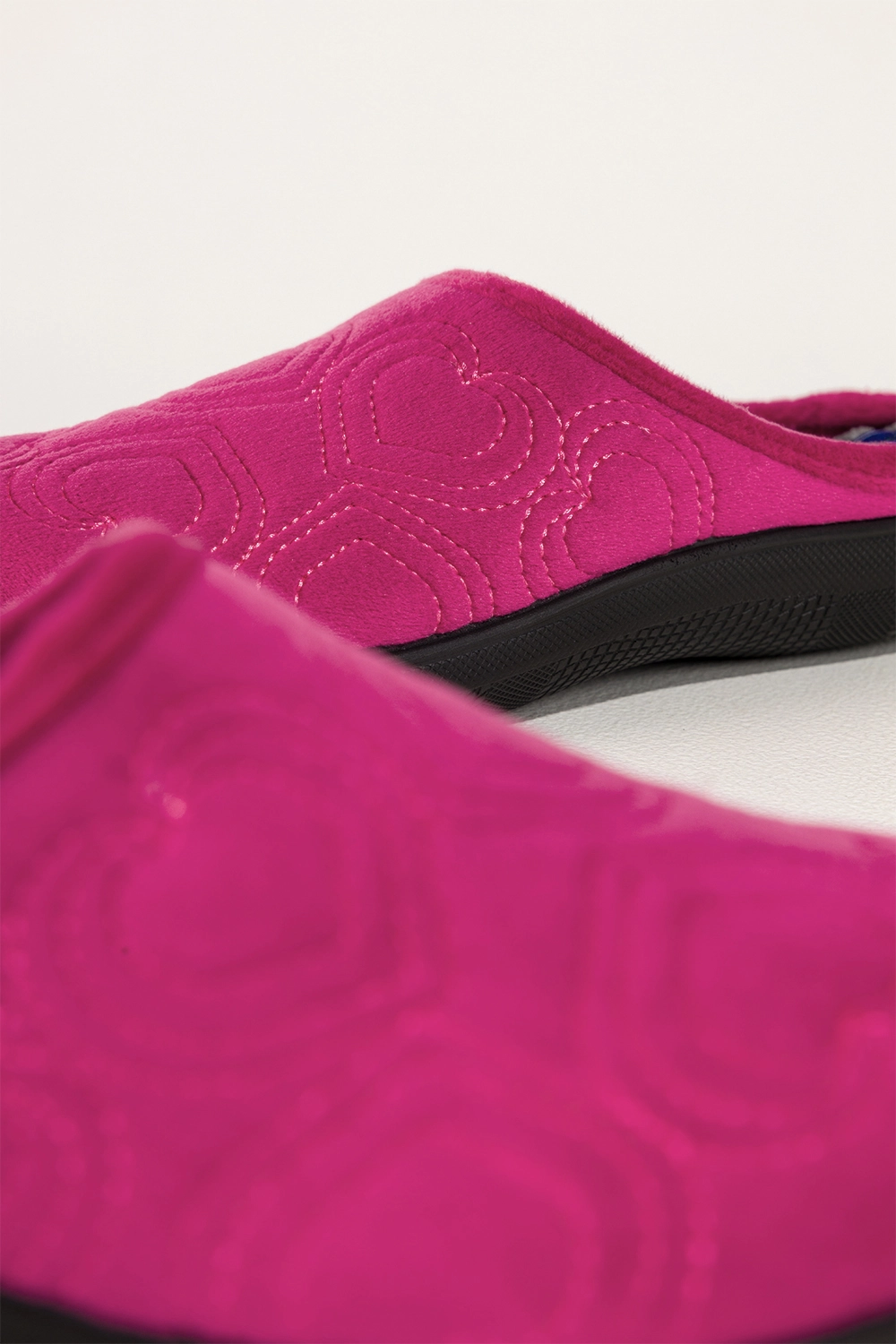 Haftowane serca na cholewce tworzą romantyczny, kobiecy akcent, który sprawia, że kapcie stają się nie tylko praktycznym elementem garderoby, ale również stylowym dodatkiem. Wsuwana konstrukcja umożliwia szybkie zakładanie, a płaska podeszwa zapewnia stabilność podczas chodzenia po domu.