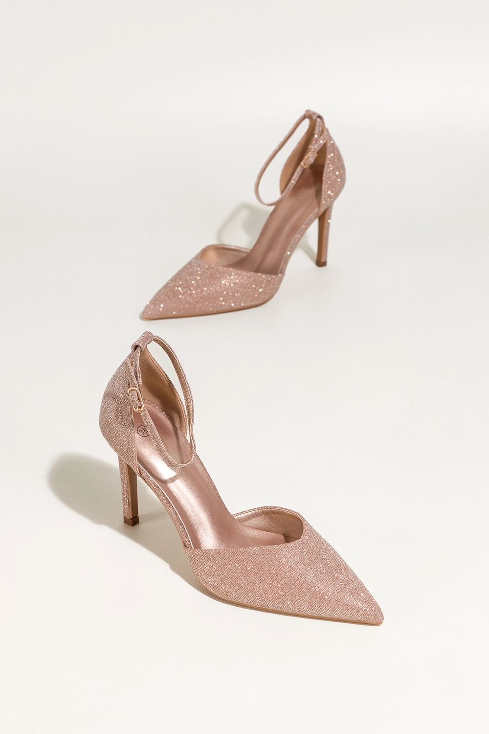Szampańskie czółenka damskie szpilki brokatowe z zakrytą piętą pasek wokół kostki Carla TT-870K pierwsze spojrzenie przyciąga migotliwa cholewka w odcieniu szampańskiego złota, która tworzy niezwykle świetlisty efekt. Smukła sylwetka, szpiczasty nosek oraz szpilkowy obcas dodają elegancji, a zakryta pięta i subtelny pasek zapinany na złotą klamerkę podkreślają szykowny charakter modelu.