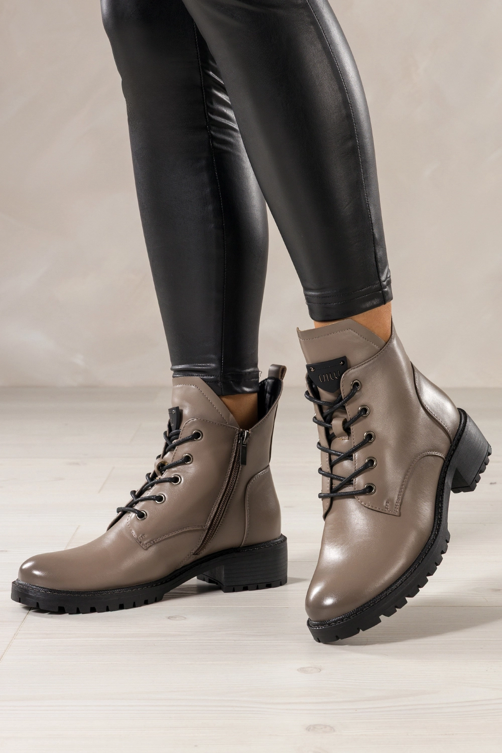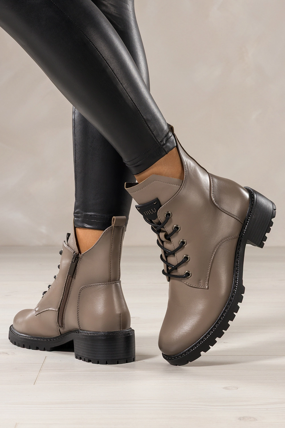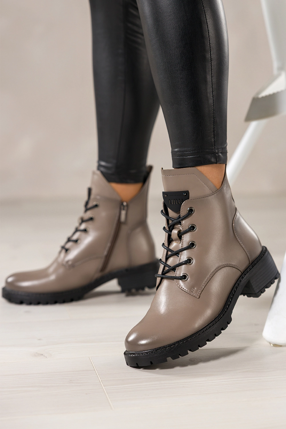 Nowoczesny styl z charakterystycznymi detalami Te szare botki wyróżnia nowoczesna sylwetka z wyciętą cholewką, która nadaje im lekkości i wizualnej finezji. Wycięcia w górnej części cholewki nie tylko pełnią funkcję dekoracyjną, ale także dodają lekkości i stylu. Wzrok przyciąga czarna ozdoba umieszczona na języku – subtelny, ale wyrazisty detal, który nadaje całości modowego pazura. Model zapinany jest na boczny zamek błyskawiczny, co znacząco ułatwia zakładanie, a dodatkowe sznurówki pozwalają na indywidualne dopasowanie do stopy. Zaokrąglony nosek nadaje sylwetce miękkości, a szeroki niski obcas zapewnia stabilność i komfort nawet podczas długiego użytkowania. To obuwie, które świetnie komponuje się z jeansami, sukienkami i płaszczami, podkreślając styl właścicielki w każdej sytuacji.