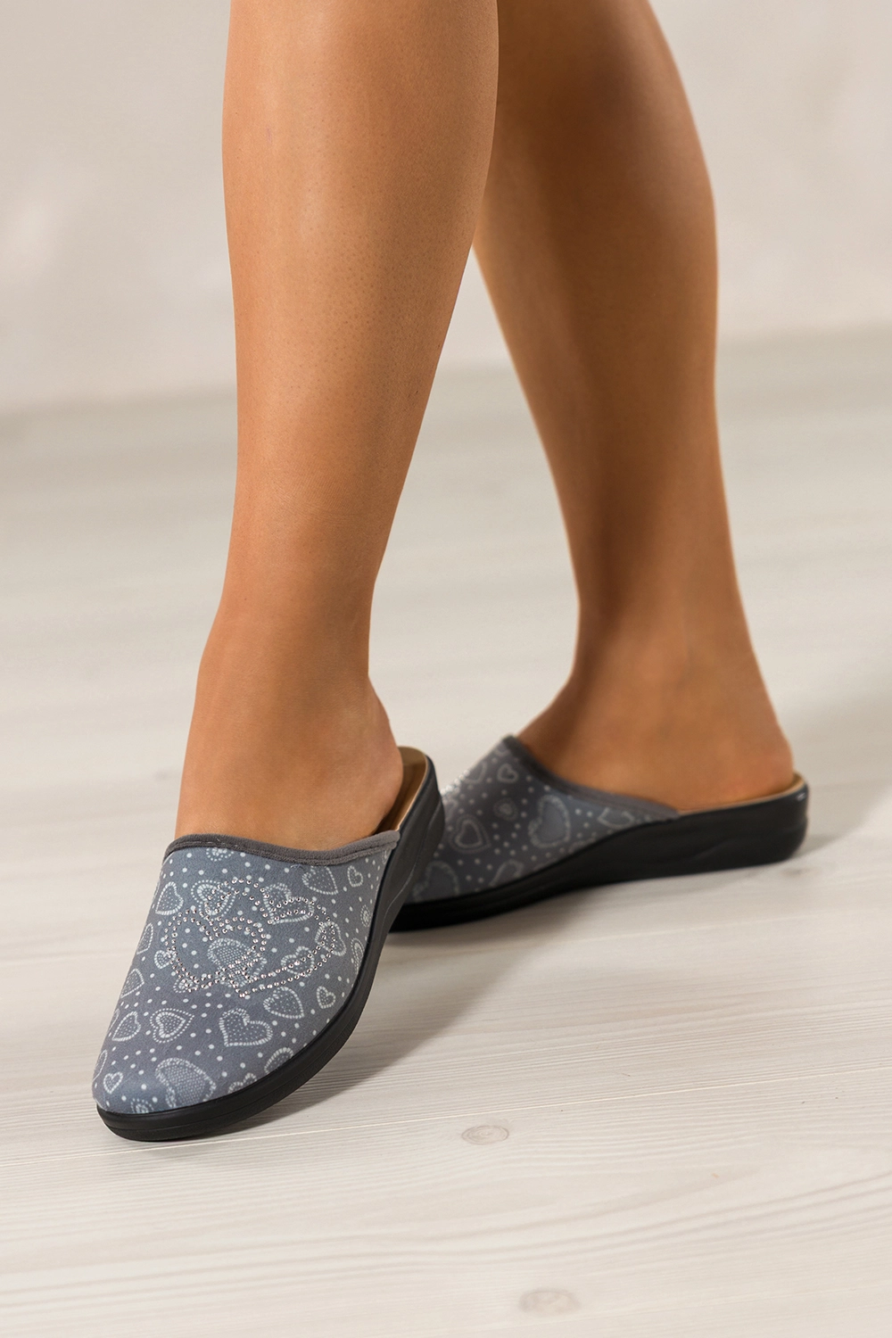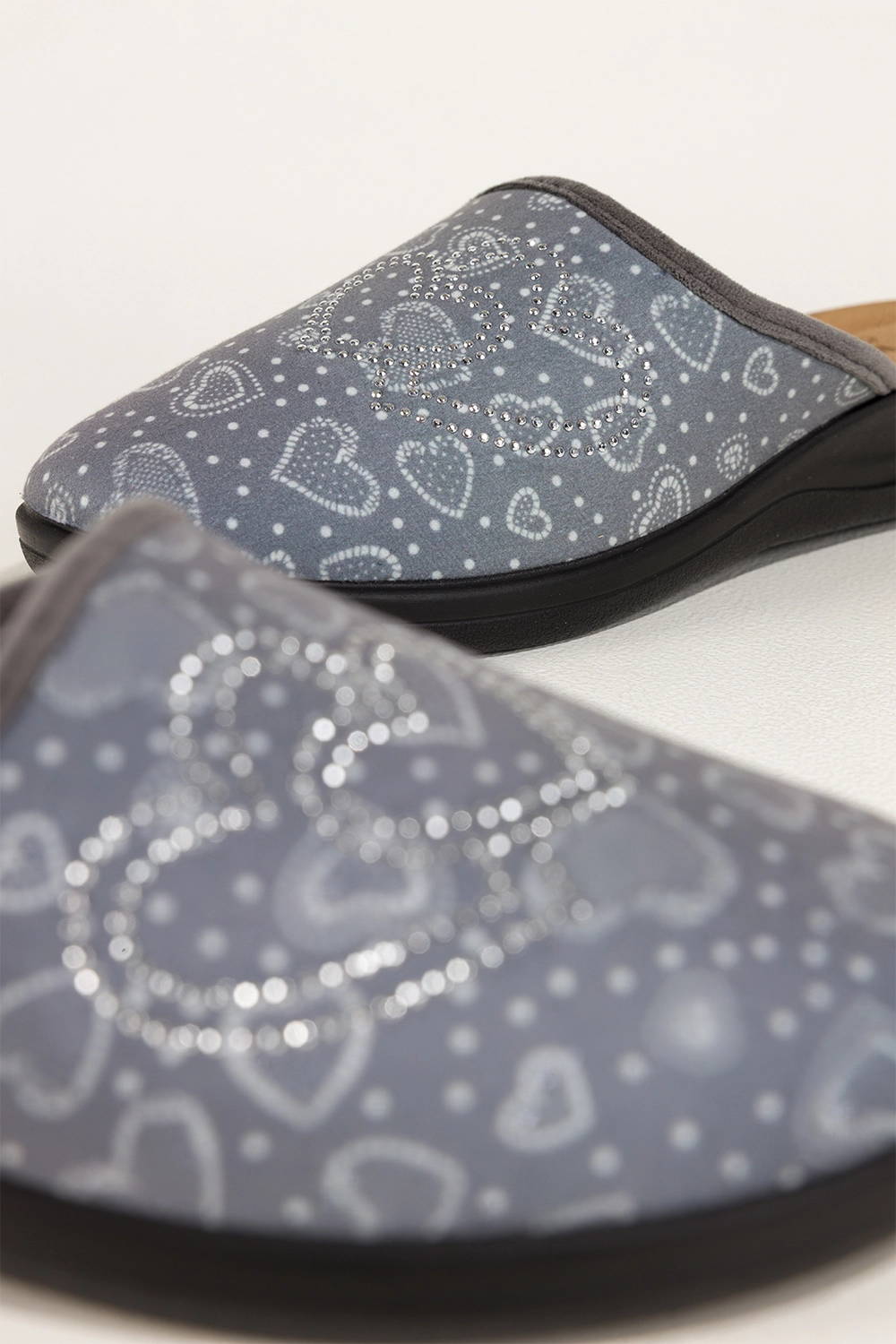 Zaokrąglony nosek, wsuwany fason oraz dekoracyjne serca z błyszczącymi cyrkoniami nadają obuwiu subtelnego uroku. Delikatny połysk zdobień sprawia, że kapcie prezentują się niezwykle kobieco, łącząc w sobie funkcjonalność z elegancją.