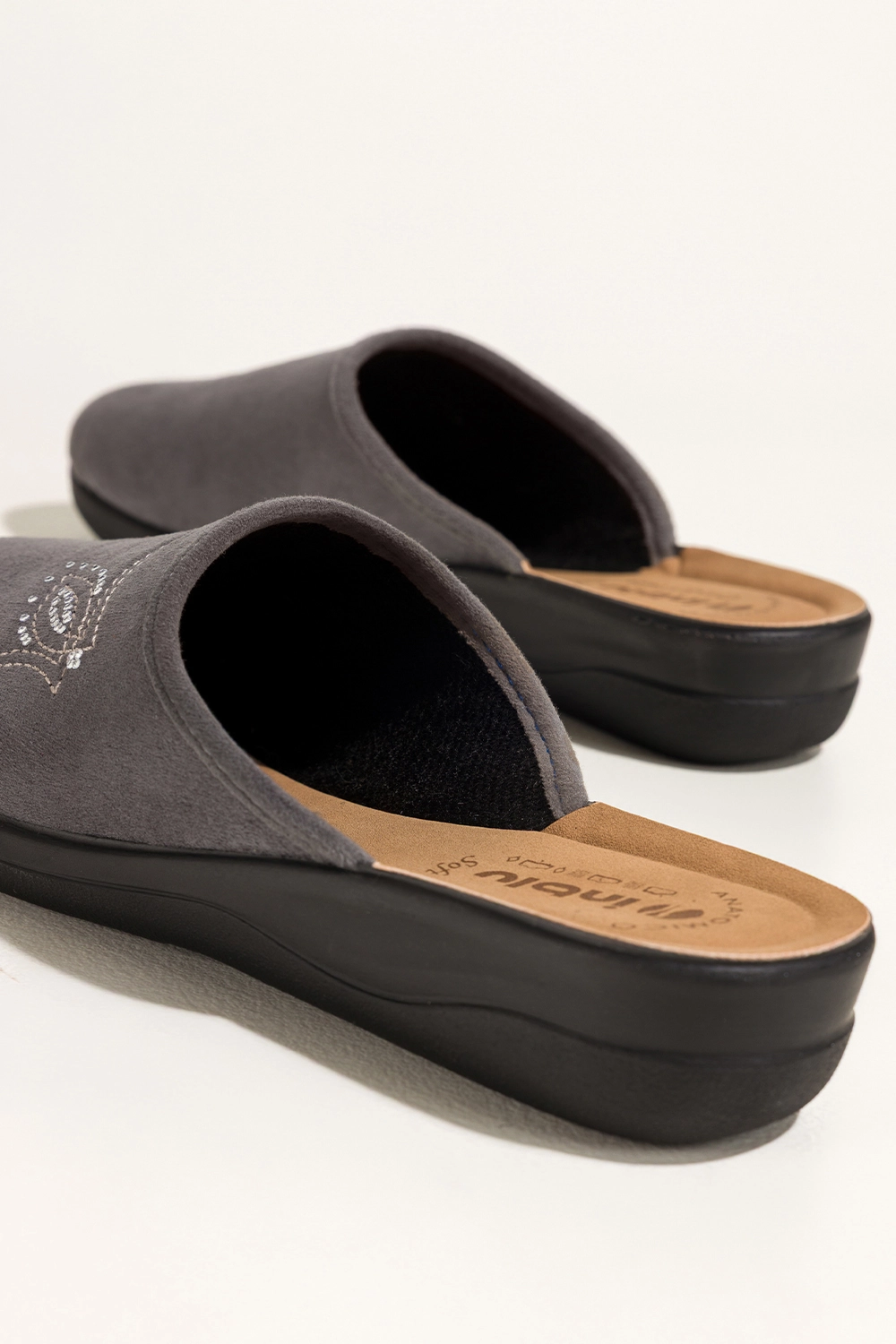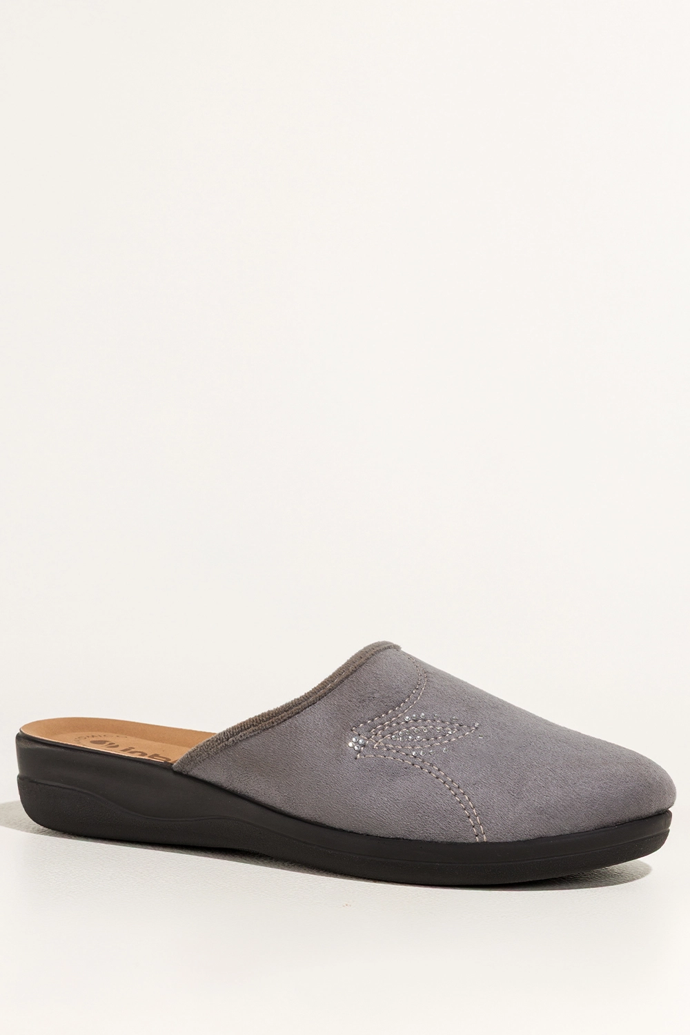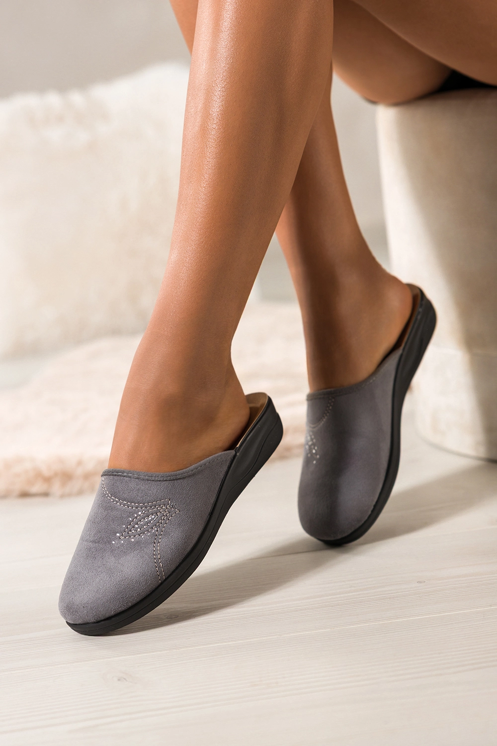 Cholewka kapci zdobiona jest finezyjnym haftem i błyszczącymi cyrkoniami, które dodają im elegancji i niepowtarzalnego charakteru. Ich uniwersalny szary kolor sprawia, że świetnie pasują do każdej domowej stylizacji, od miękkiego szlafroka po ulubione legginsy. Zaokrąglony nosek zapewnia wygodę ruchu, a wsuwany fason pozwala na szybkie i bezproblemowe zakładanie. To więcej niż kapcie, to codzienny luksus, który możesz mieć zawsze przy sobie.