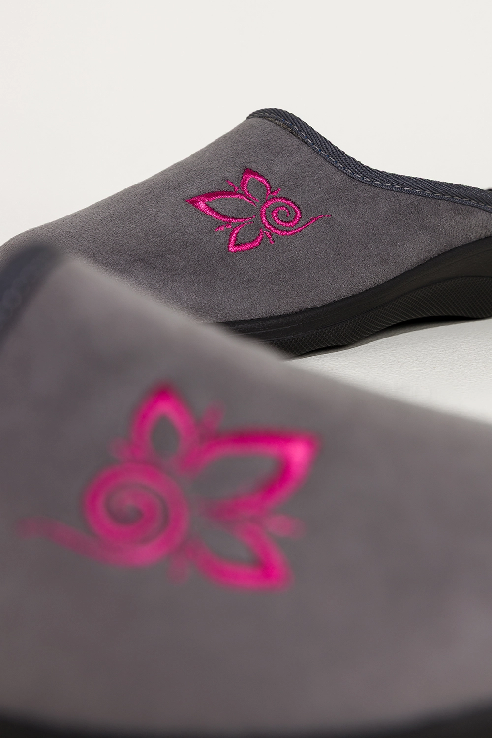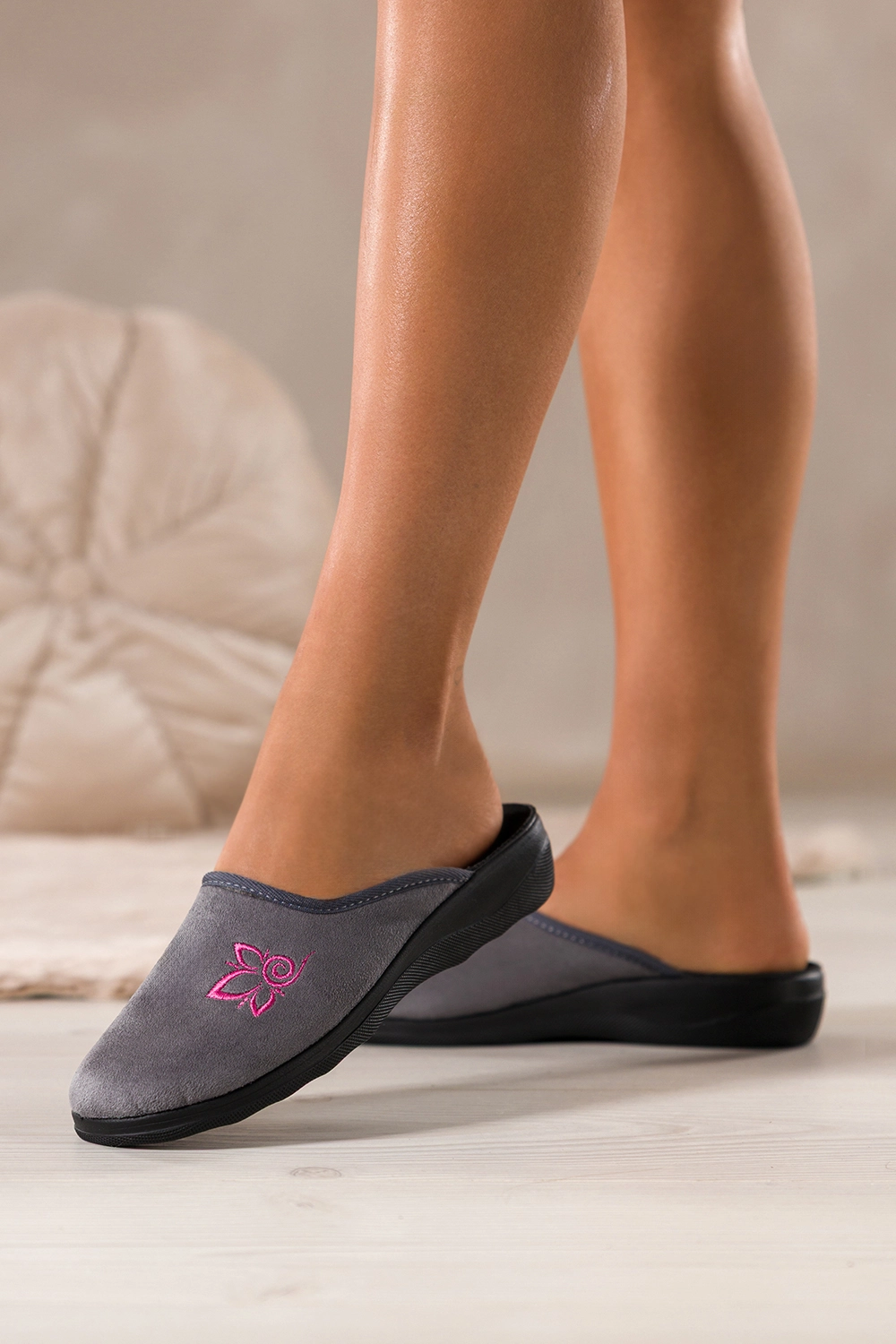 Szary odcień jest ponadczasowy i uniwersalny, a ozdobny haftowany kwiat na cholewce dodaje obuwiu subtelnego uroku. Zaokrąglony nosek oraz delikatna linia cholewki podkreślają zgrabność stopy, dzięki czemu kapcie prezentują się niezwykle estetycznie. Można je z łatwością dopasować do różnorodnych stylizacji domowych, od wygodnych dresów po eleganckie szlafroki.