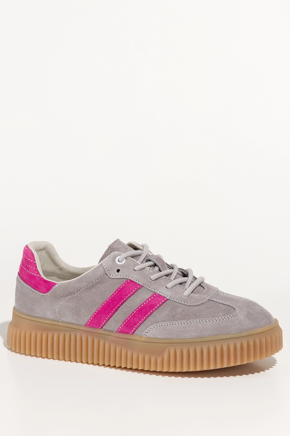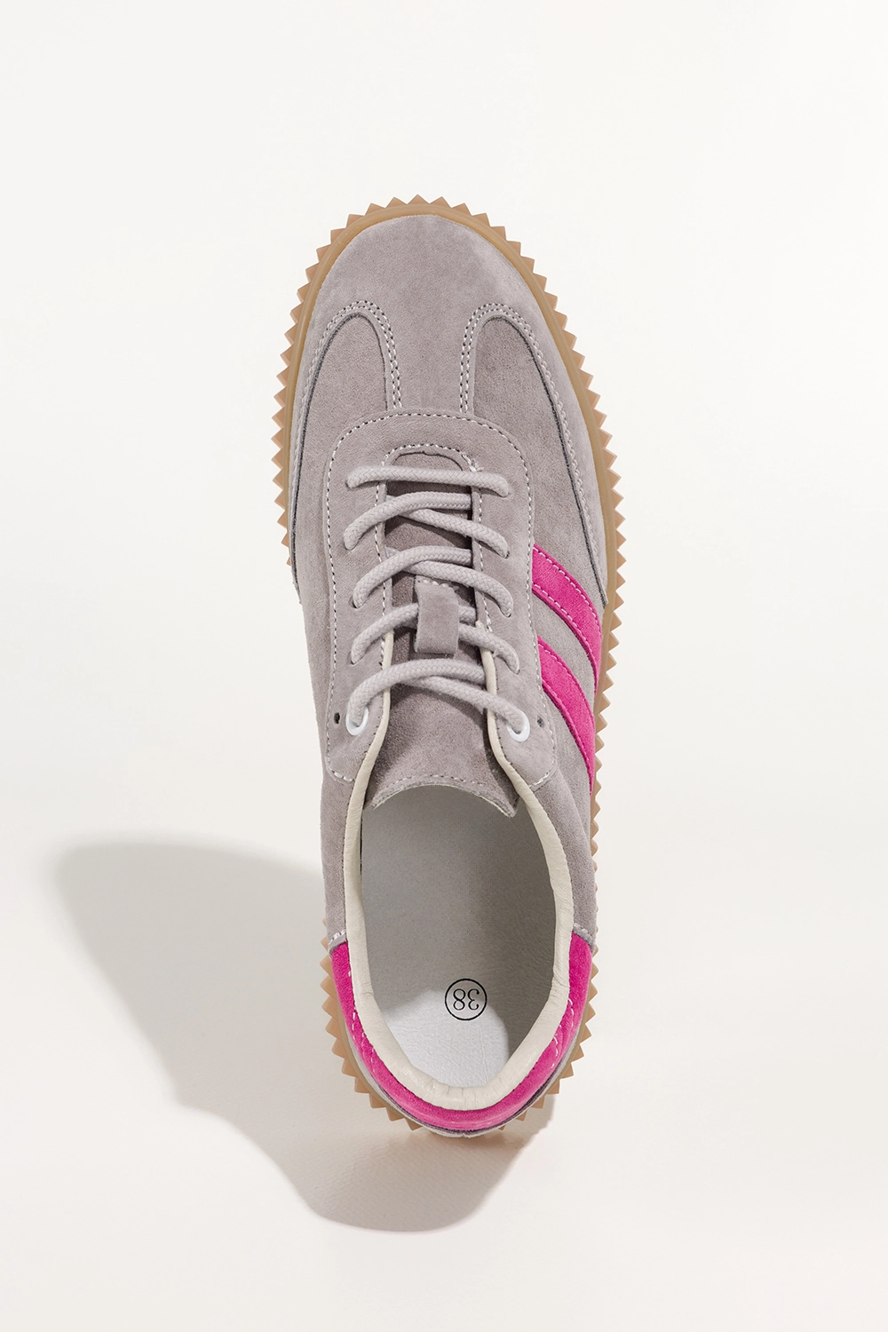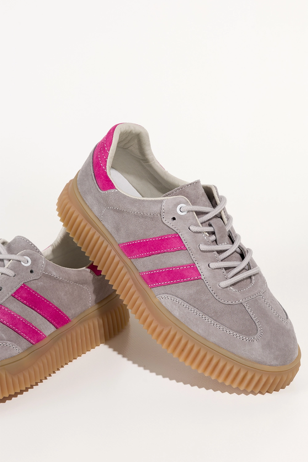 Szare sneakersy skórzane damskie buty sportowe na beżowej platformie fuksjowe wstawki sznurowane Carla model TW-CU-800 to wyjątkowe połączenie komfortu, jakości i stylu. Zaprojektowane z myślą o kobietach, które chcą wyglądać modnie, ale nie rezygnują z wygody. Wykonane z najwyższej jakości skóry zamszowej, prezentują się niezwykle elegancko, a jednocześnie nowocześnie. Beżowa platforma z delikatnym żłobieniem nie tylko dodaje kilku centymetrów wzrostu, ale też zapewnia stabilność i dobrą przyczepność. Fuksjowe wstawki na cholewce nadają im odważnego charakteru i sprawiają, że model wyróżnia się na tle innych sneakersów dostępnych na rynku. Dzięki starannie dobranej kolorystyce i detali, te buty sportowe stają się świetnym uzupełnieniem miejskich stylizacji, niezależnie od pory roku.