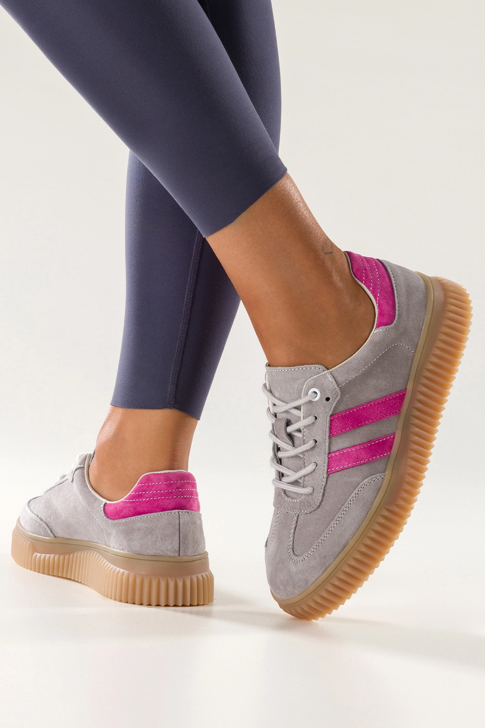 Wysoka jakość wykonania i komfort użytkowania to elementy, które stanowią o klasie tego modelu. Sneakersy posiadają wyjmowaną, miękką wkładkę wykonaną ze skóry naturalnej, która idealnie dopasowuje się do kształtu stopy i pozwala na zachowanie odpowiedniej higieny. To doskonały wybór dla kobiet, które cenią sobie indywidualne dopasowanie oraz możliwość stosowania wkładek ortopedycznych. Zaokrąglony nosek zapewnia komfort noszenia przez cały dzień – bez ucisku, bez otarć, bez kompromisów. Szare sznurówki pozwalają na dopasowanie cholewki do każdej stopy, a solidna konstrukcja gwarantuje trwałość nawet przy intensywnym użytkowaniu. Beżowa platforma, poza funkcją estetyczną, działa amortyzująco i wspiera naturalne ułożenie stopy podczas chodzenia. To buty dla kobiet aktywnych, które nie chcą rezygnować z elegancji.