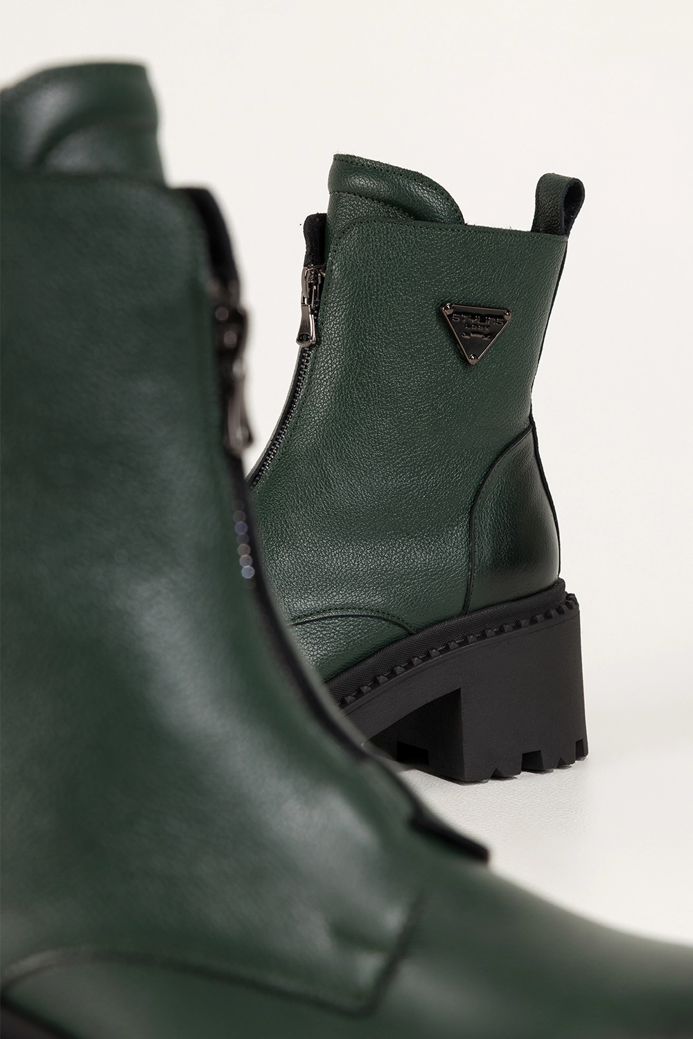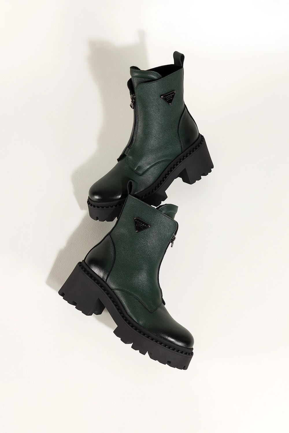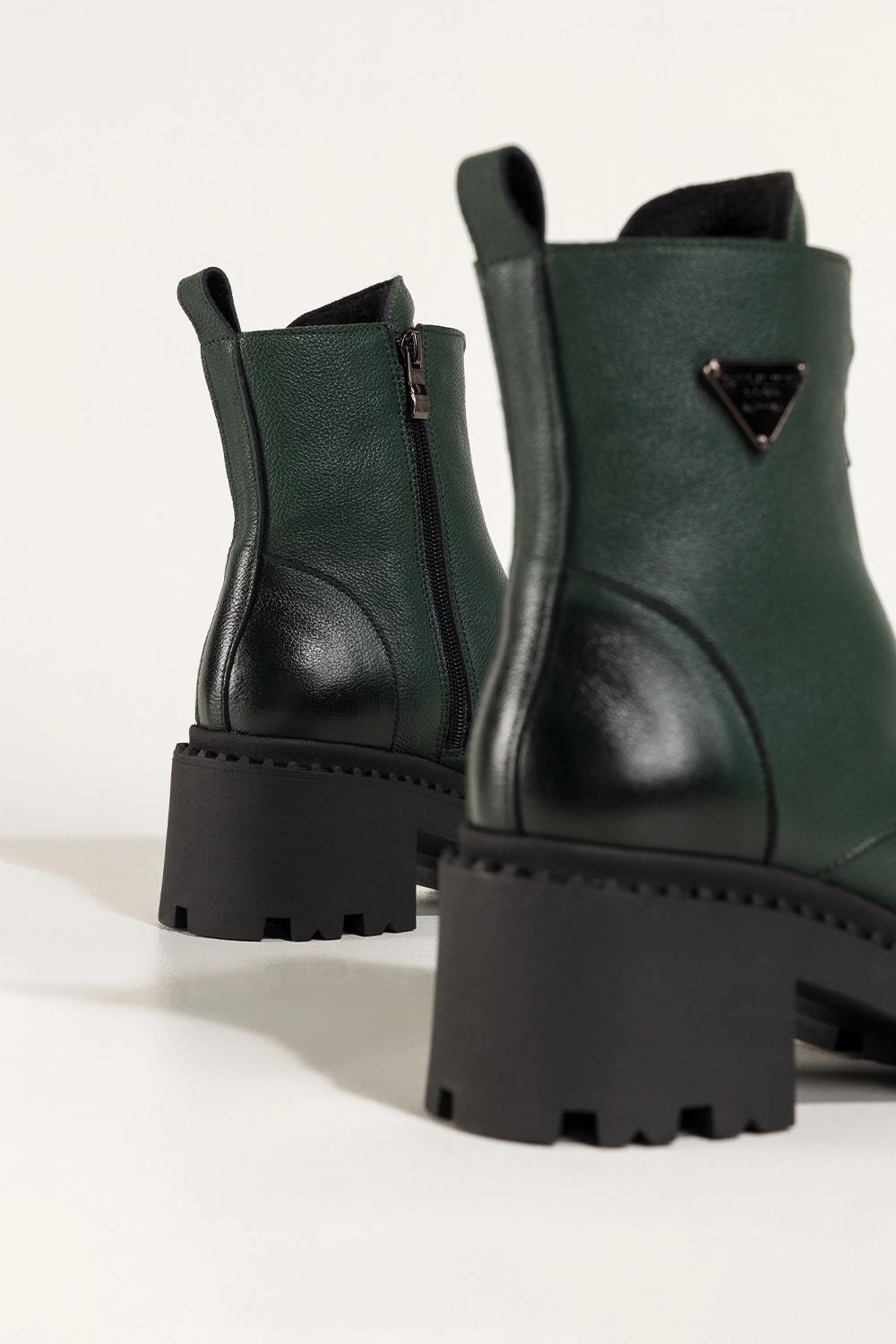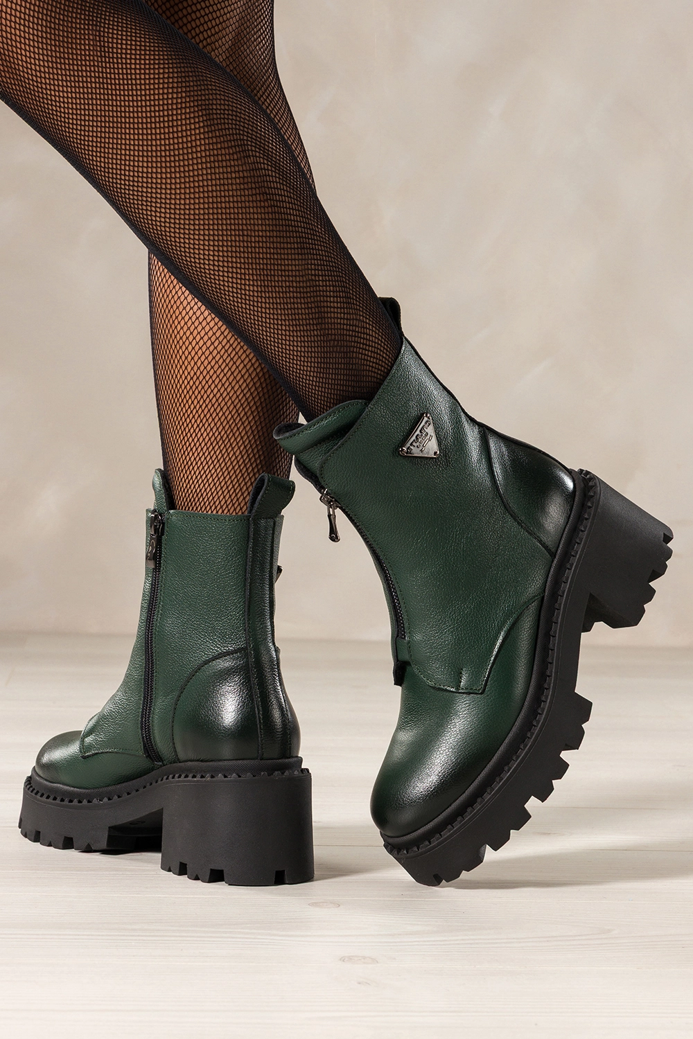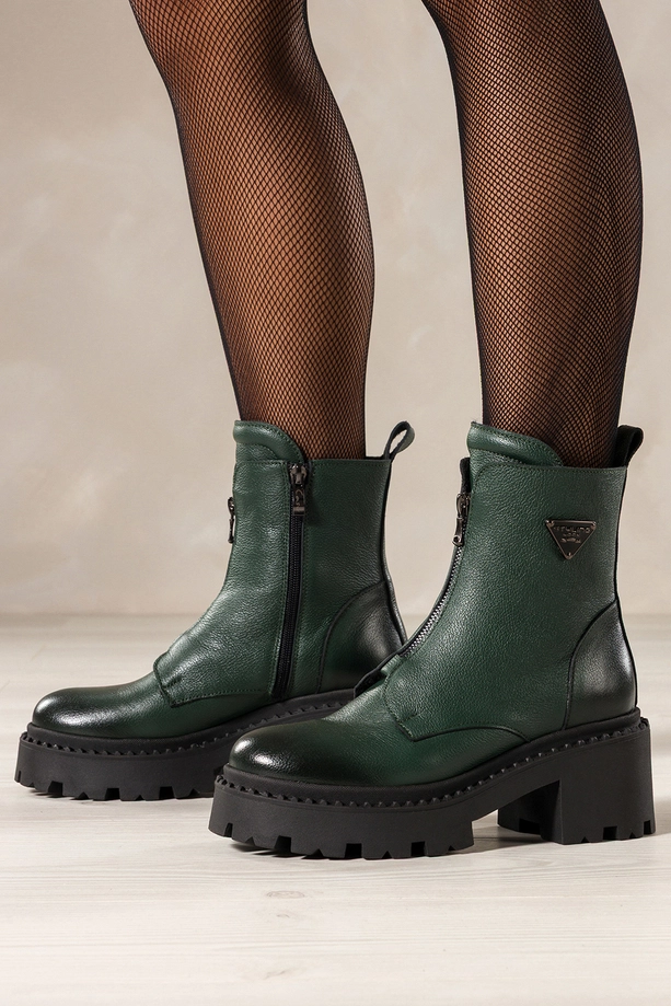 Zielone botki skórzane damskie bieżnikowany obcas i platforma czarna ozdoba zamek na przodzie PRODUKT POLSKI Casu model 39508. Wykonane z wysokogatunkowej skóry naturalnej, zapewniają trwałość, oraz wyjątkowy komfort użytkowania. Miękka, przyjemna w dotyku wkładka oraz ocieplenie kocem obuwniczym sprawiają, że to idealne buty na chłodniejsze dni. Zaokrąglony nosek oraz solidna konstrukcja gwarantują wygodę nawet przy wielogodzinnym noszeniu.