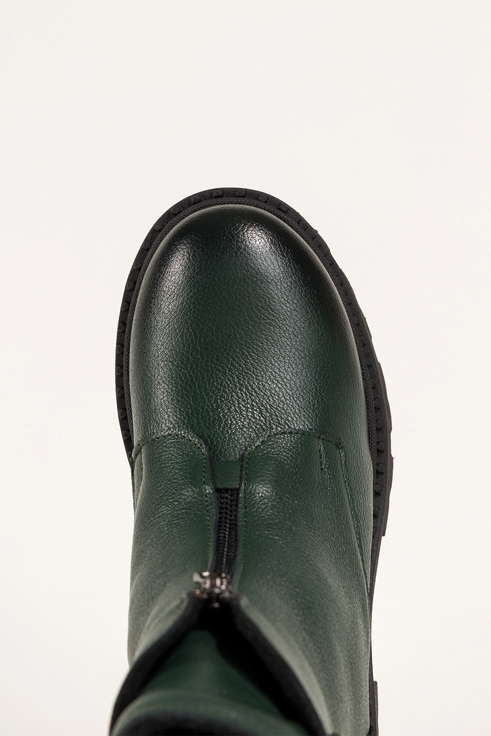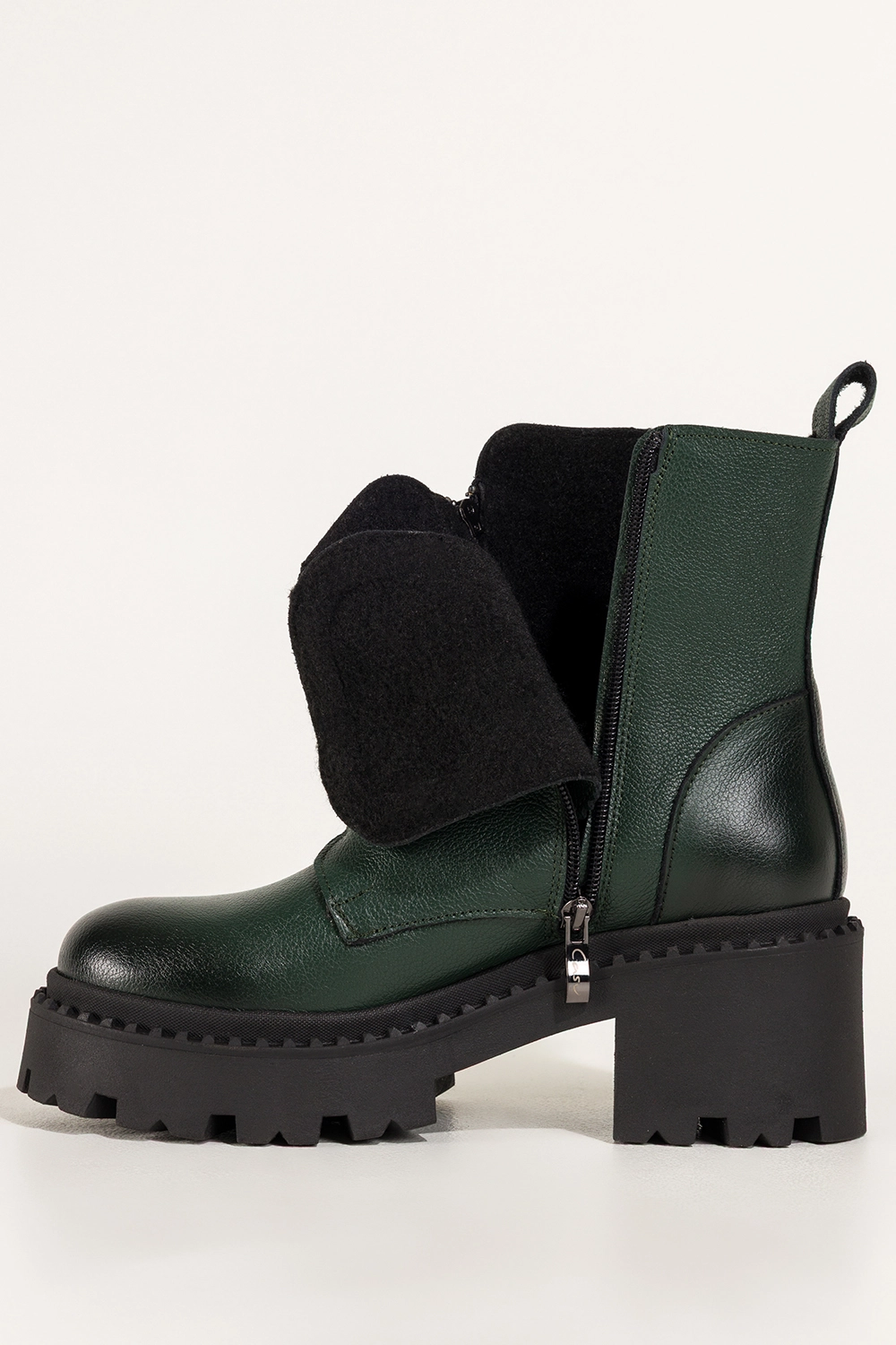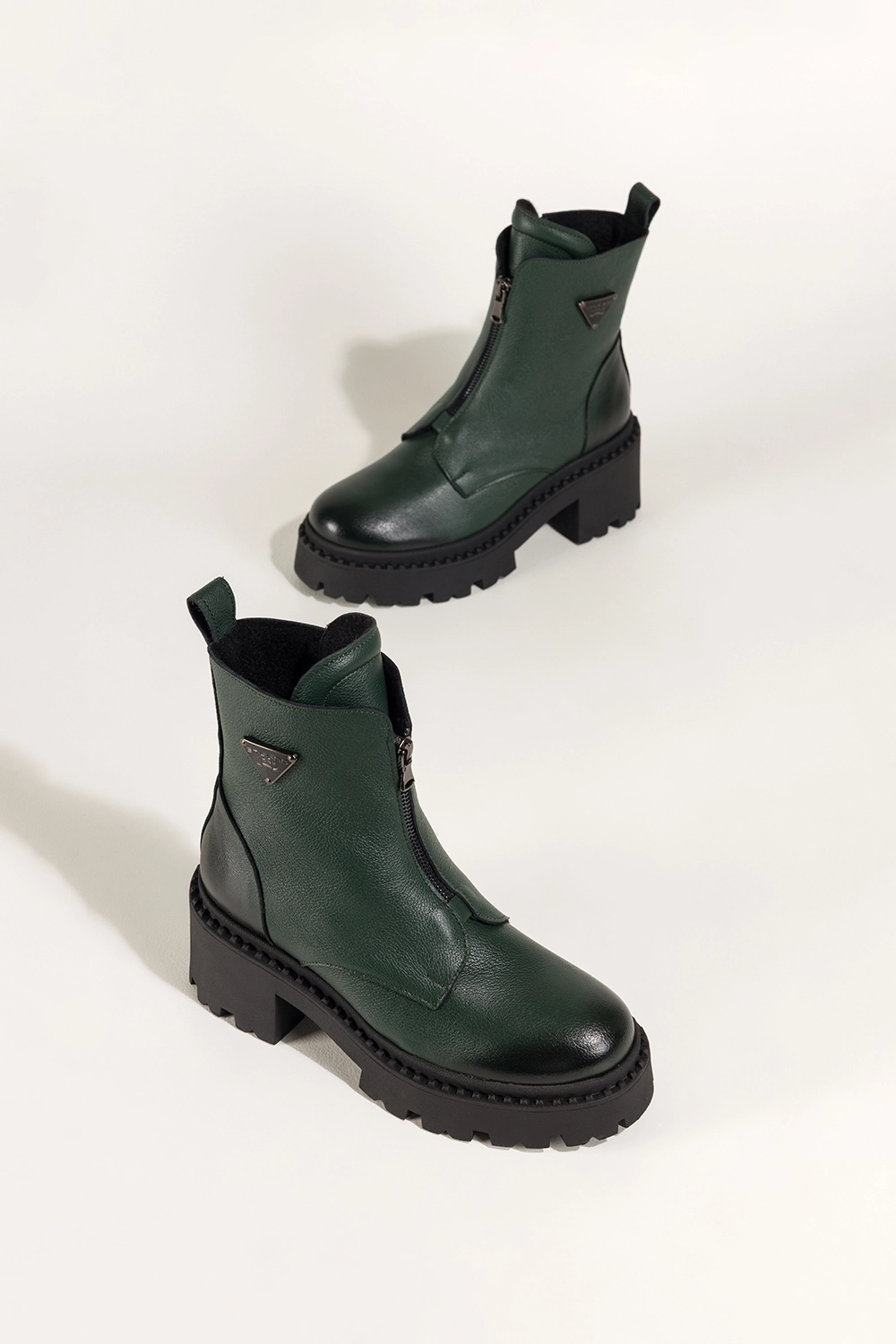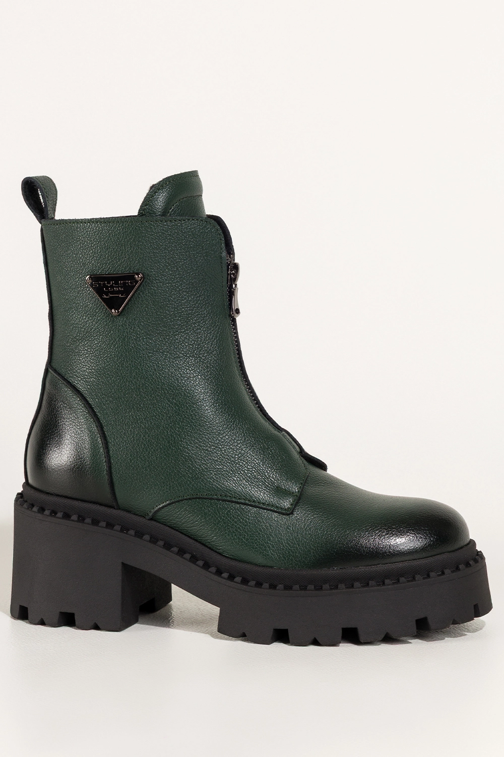 Zielone botki skórzane damskie bieżnikowany obcas i platforma czarna ozdoba zamek na przodzie PRODUKT POLSKI Casu model 39508. Wykonane z wysokogatunkowej skóry naturalnej, zapewniają trwałość, oraz wyjątkowy komfort użytkowania. Miękka, przyjemna w dotyku wkładka oraz ocieplenie kocem obuwniczym sprawiają, że to idealne buty na chłodniejsze dni. Zaokrąglony nosek oraz solidna konstrukcja gwarantują wygodę nawet przy wielogodzinnym noszeniu.