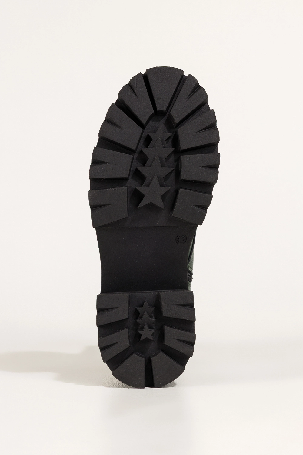 Zielone botki skórzane damskie bieżnikowany obcas i platforma czarna ozdoba zamek na przodzie PRODUKT POLSKI Casu 39508