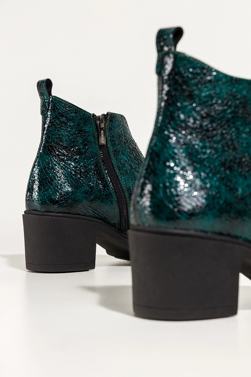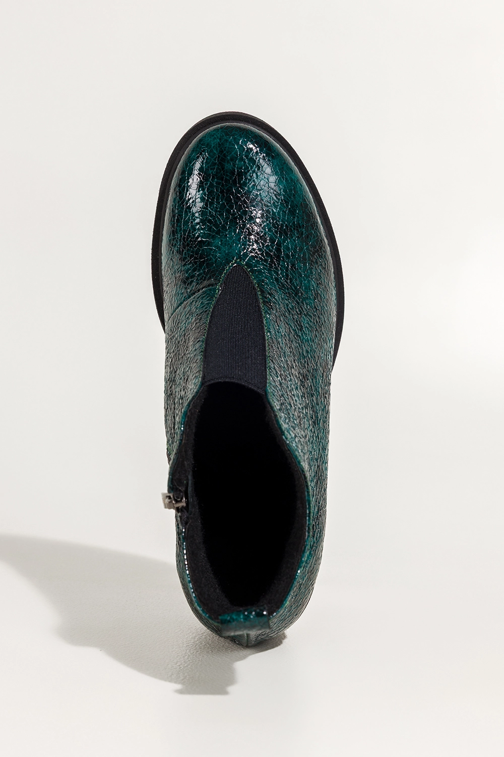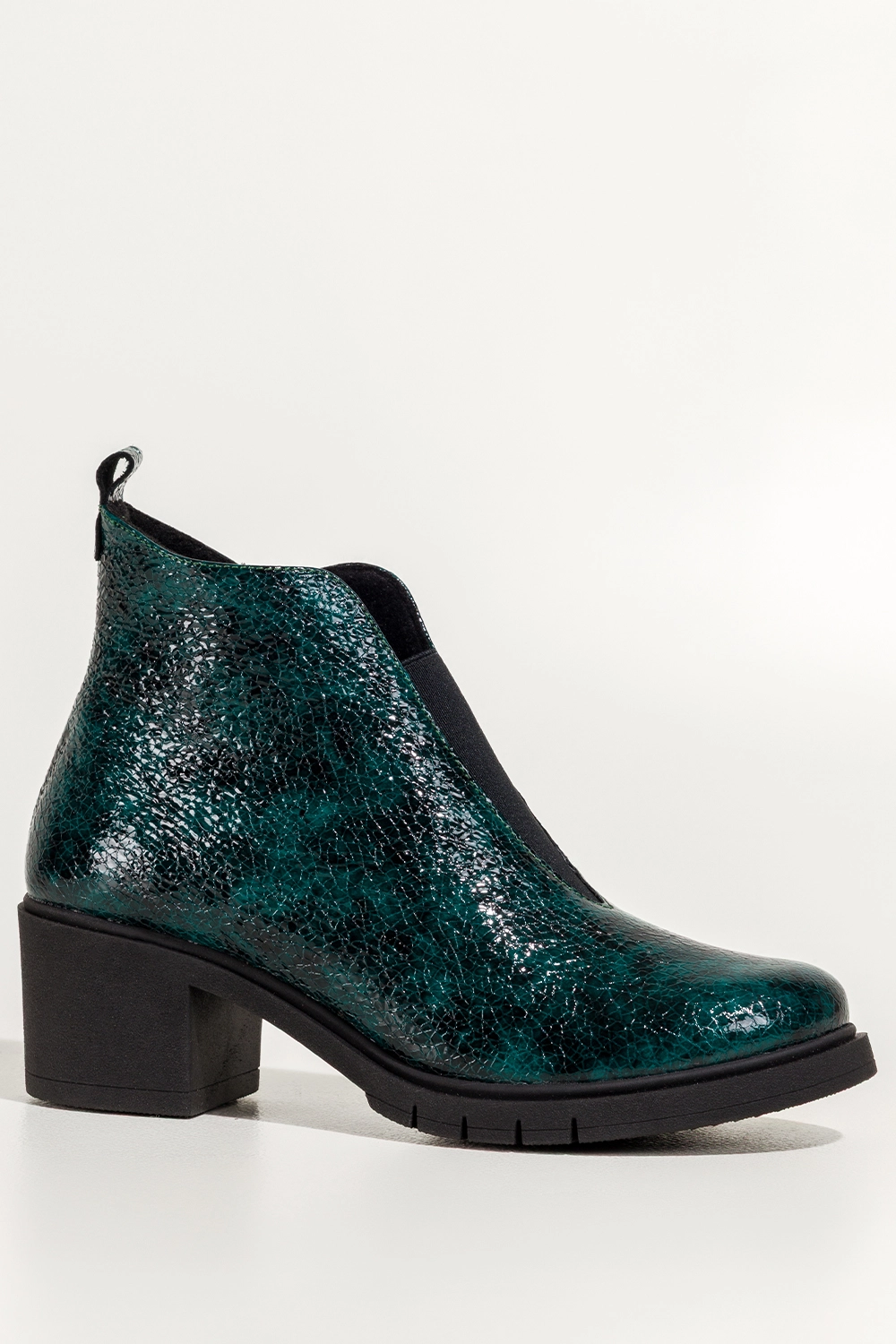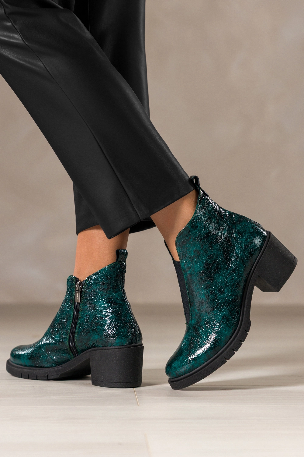 Zielone botki skórzane damskie lakierowane z wzorem wężowym obcas klocek szeroka elastyczna guma na przodzie PRODUKT POLSKI Casu model 376. Wykonane z wysokogatunkowej skóry lakierowanej, prezentują się niezwykle elegancko, a oryginalny wężowy wzór dodaje im wyrazistego charakteru. Botki są ocieplone miękkim kocem obuwniczym, co sprawia, że świetnie sprawdzą się w chłodniejsze dni.