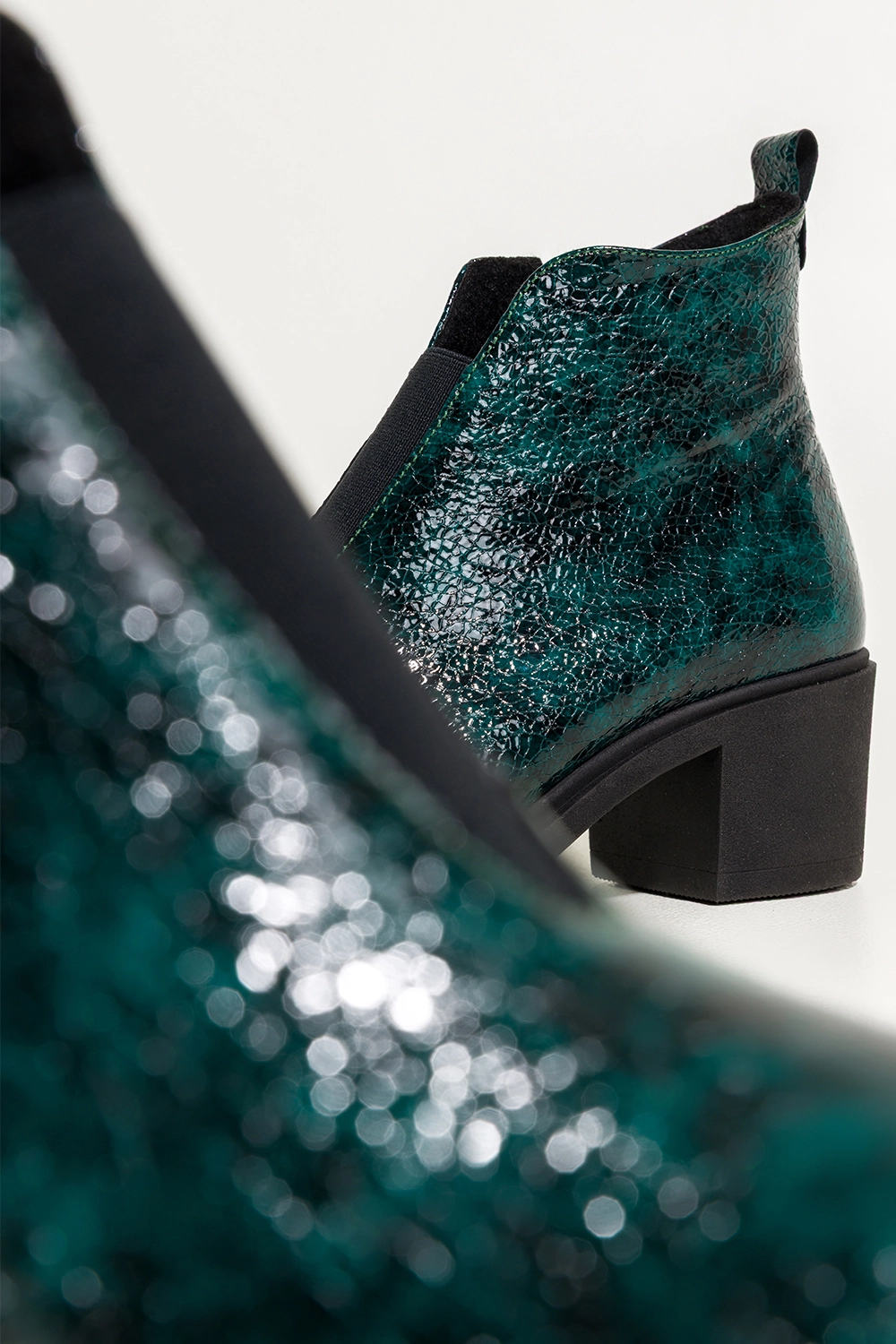 Lakierowana powierzchnia przepięknie odbija światło, tworząc niezwykle elegancki efekt wizualny. Stabilny obcas typu klocek oraz zaokrąglony nosek sprawiają, że botki są nie tylko modne, ale i wygodne w codziennym użytkowaniu. Dzięki uniwersalnej kolorystyce w odcieniu głębokiej zieleni świetnie komponują się z jeansami, sukienkami, a nawet biurowymi stylizacjami.