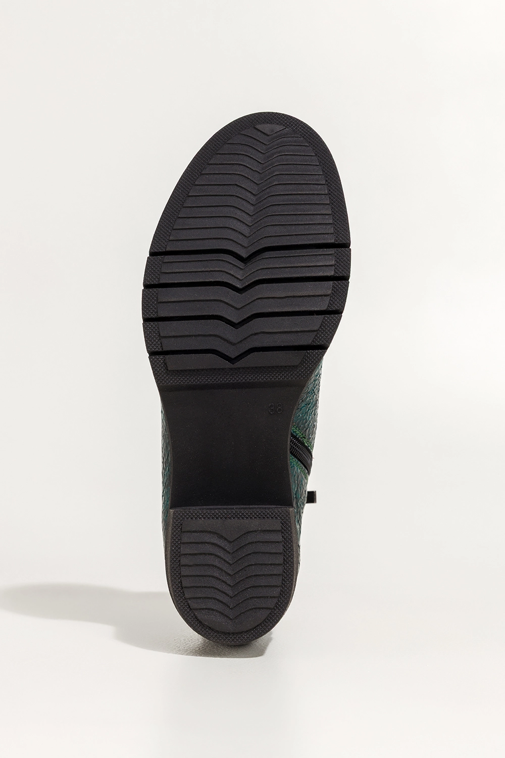Zielone botki skórzane damskie lakierowane z wzorem wężowym obcas klocek szeroka elastyczna guma na przodzie PRODUKT POLSKI Casu 376