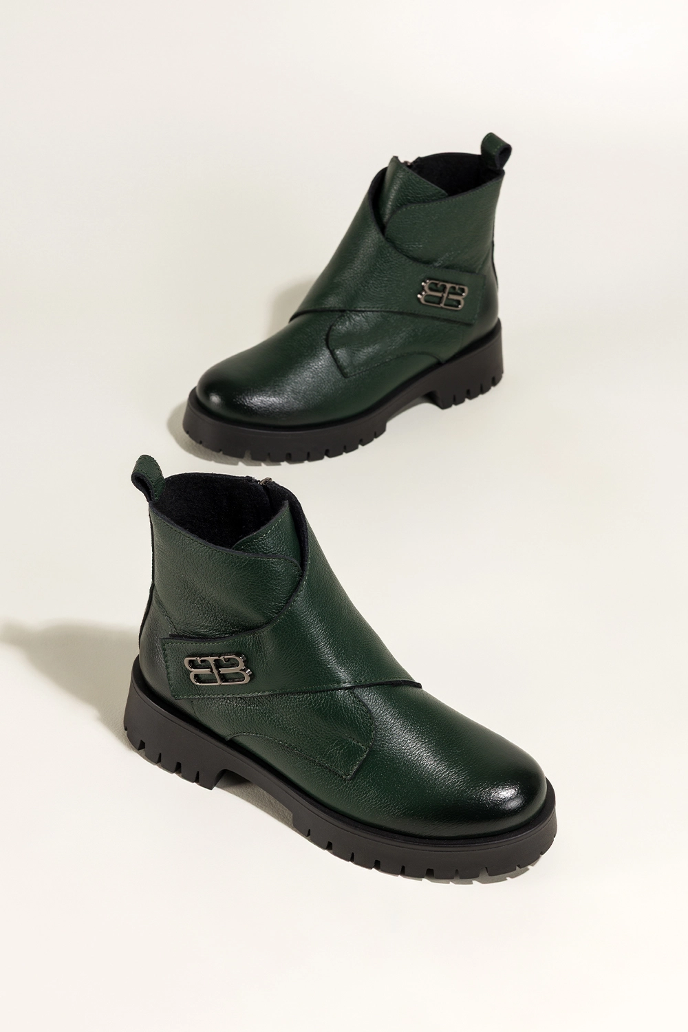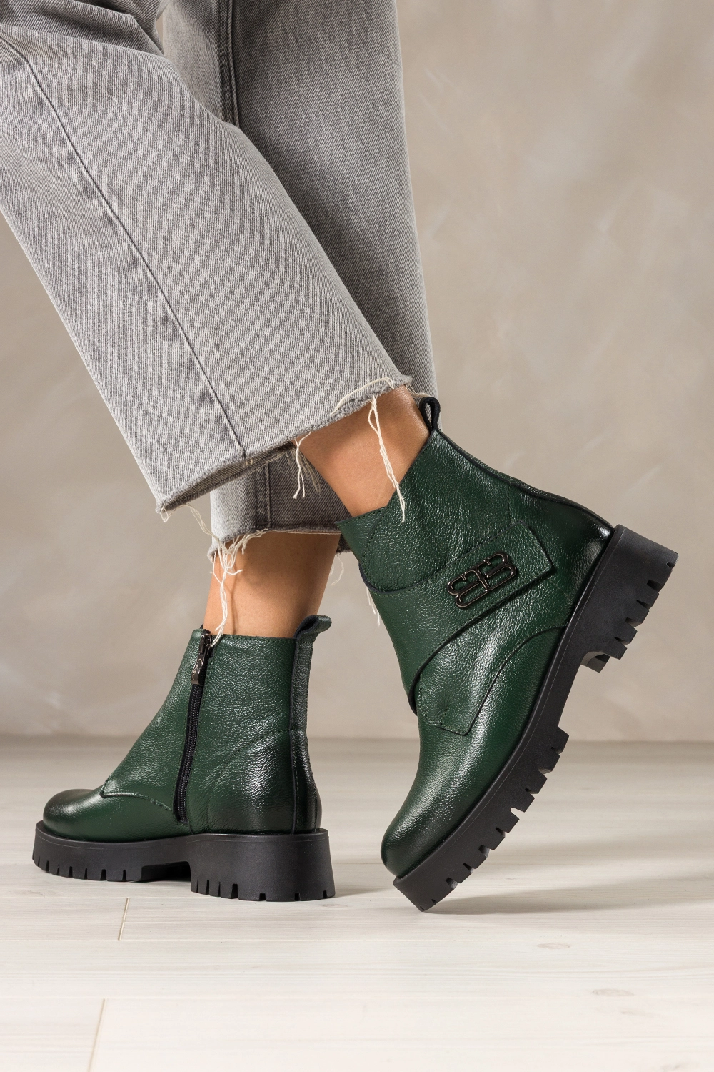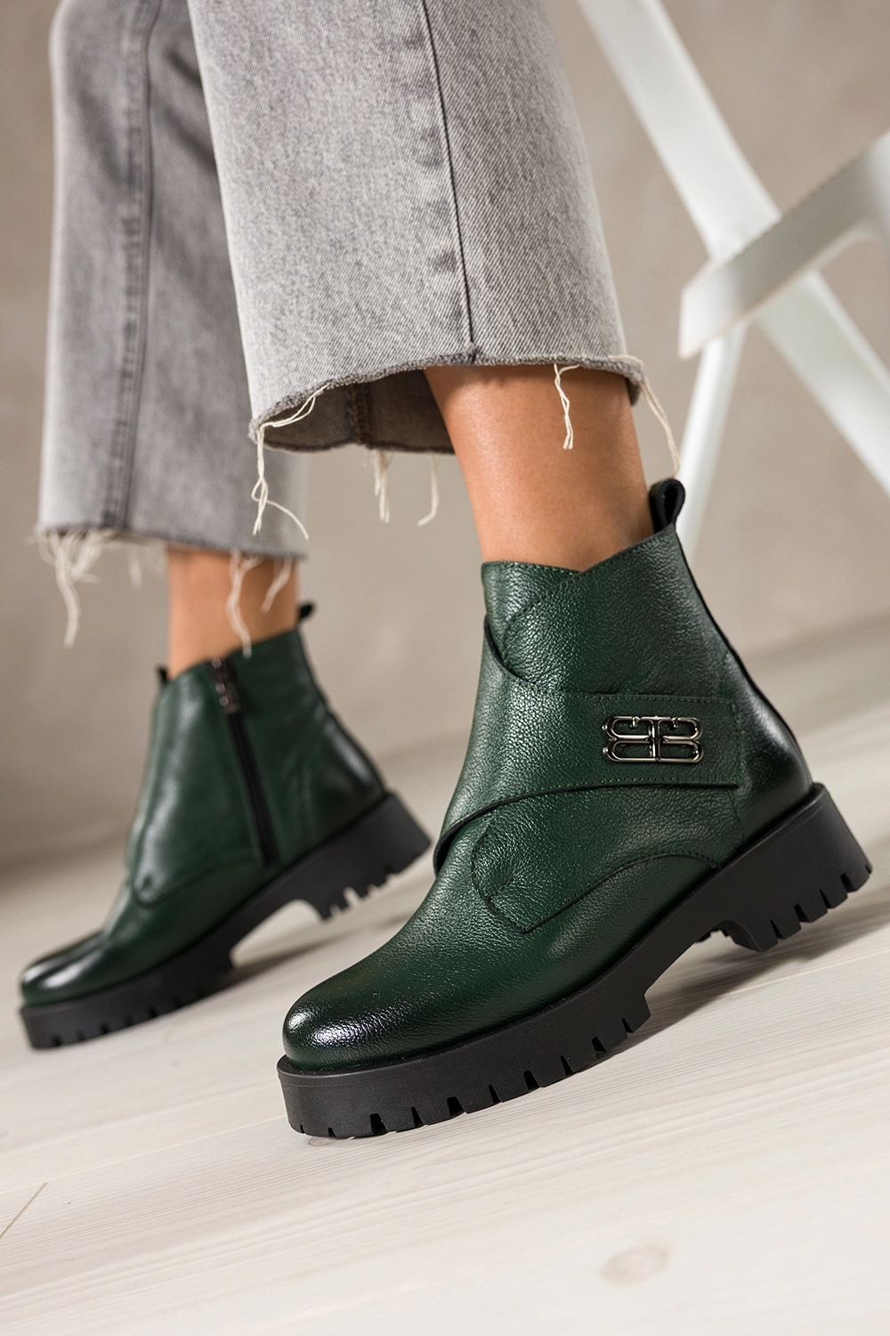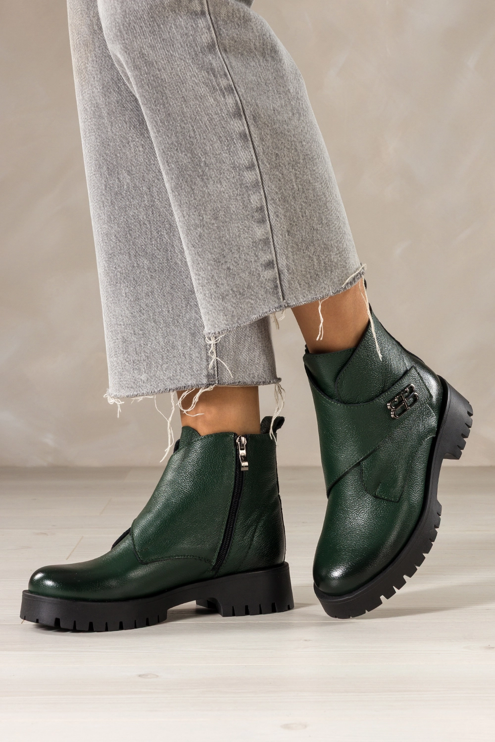 Zielone botki skórzane damskie na bieżnikowanej platformie szeroki pasek na rzep ze stalową ozdobą PRODUKT POLSKI Casu model 39465, to synonim trwałości i klasy. Wykonane z naturalnej skóry o szlachetnym wykończeniu, gwarantują niezrównaną wygodę i dopasowanie do stopy. Miękkie ocieplenie z koca obuwniczego zapewnia komfort termiczny nawet w chłodne dni, a solidny zamek boczny ułatwia szybkie zakładanie. To idealny wybór dla kobiet ceniących jakość premium i detale dopracowane w każdym calu.