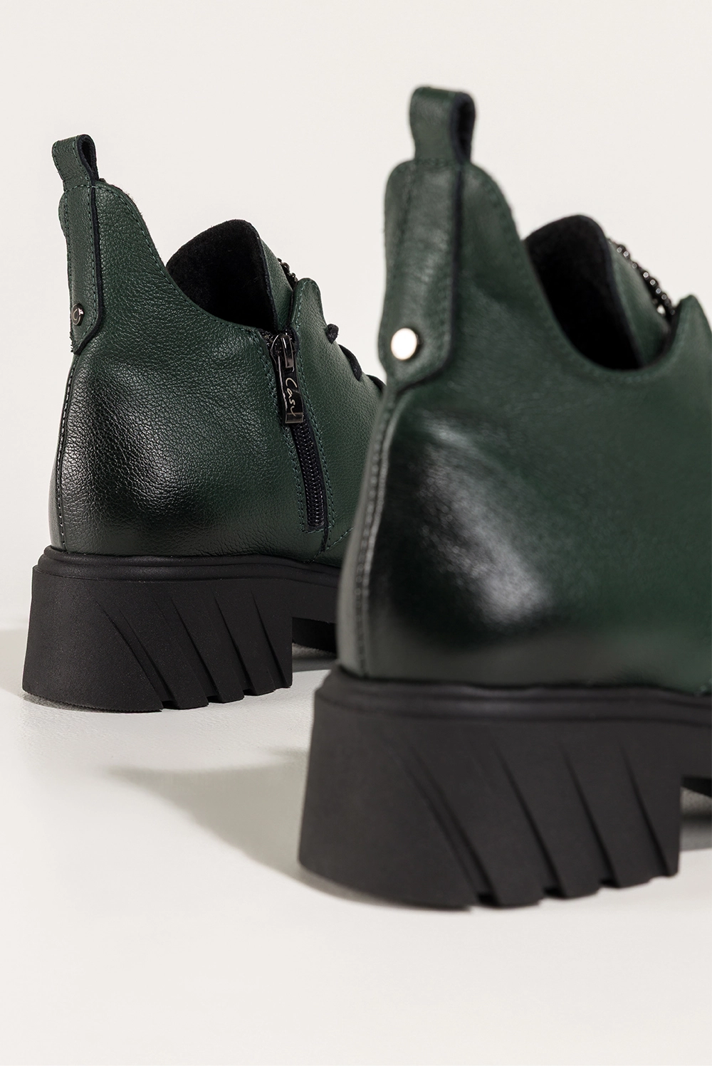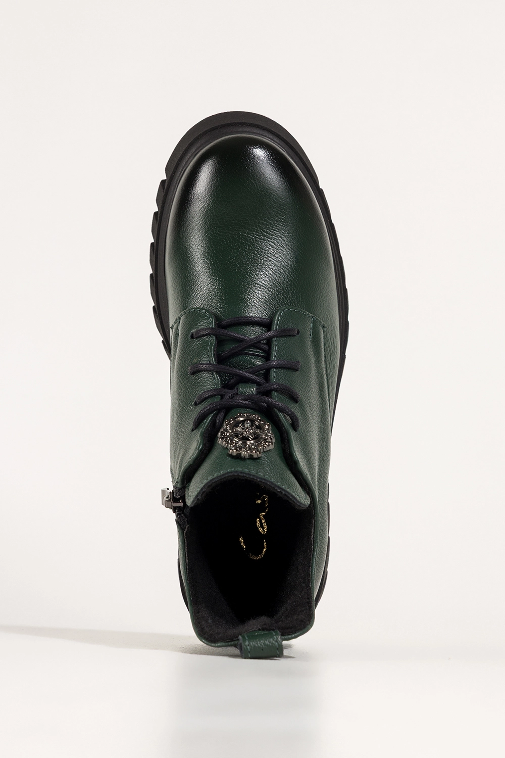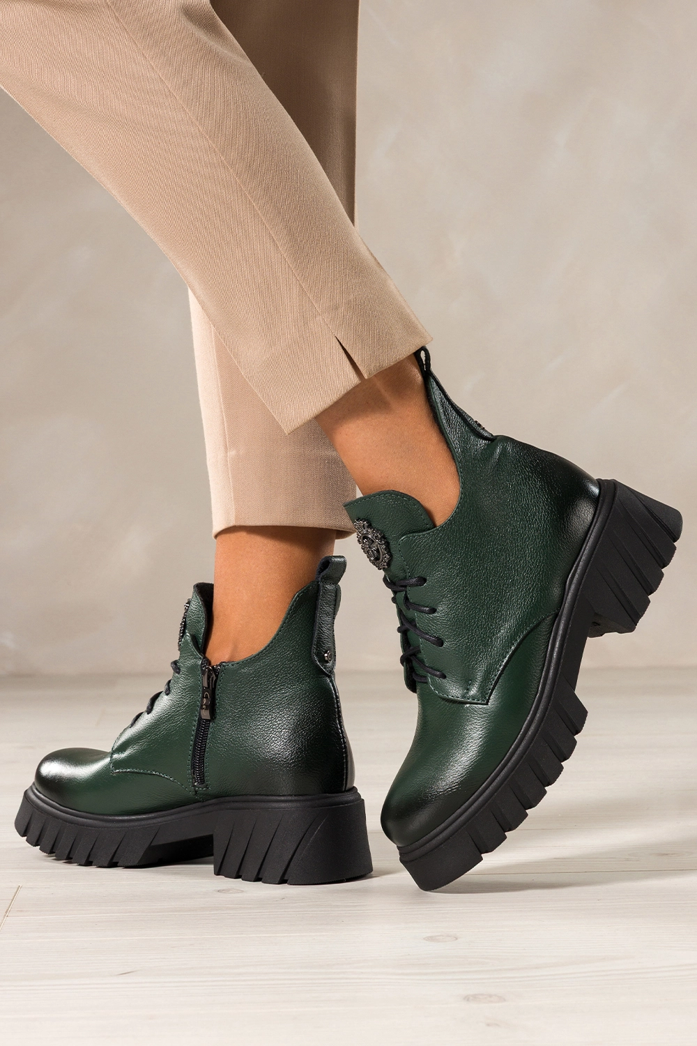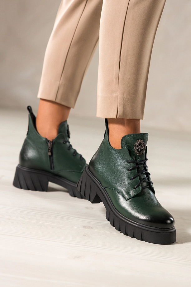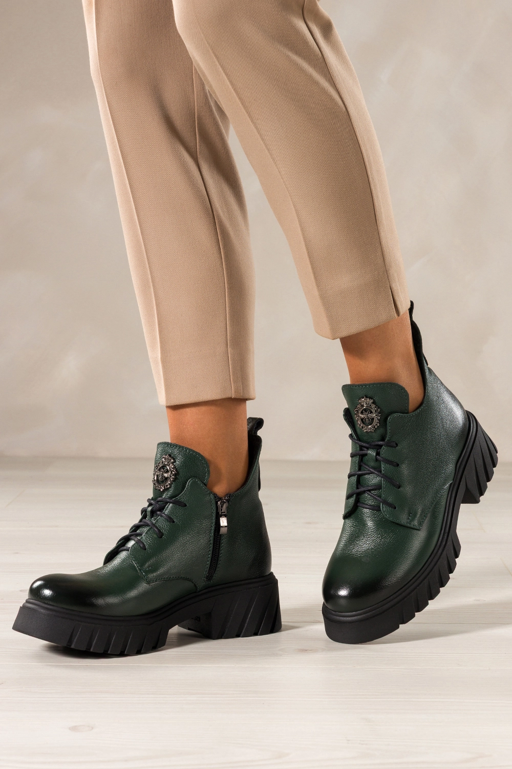 Zielone botki skórzane damskie na bieżnikowanej platformie wycięta cholewka stalowa ozdoba na języku sznurowane PRODUKT POLSKI Casu model 39458. Wysokogatunkowa skóra naturalna zapewnia trwałość i odporność na warunki pogodowe, a miękka wkładka z koca obuwniczego gwarantuje ciepło i komfort nawet podczas długich spacerów. To obuwie, stworzone z dbałością o każdy detal, który zachwyca jakością wykonania i solidnością.