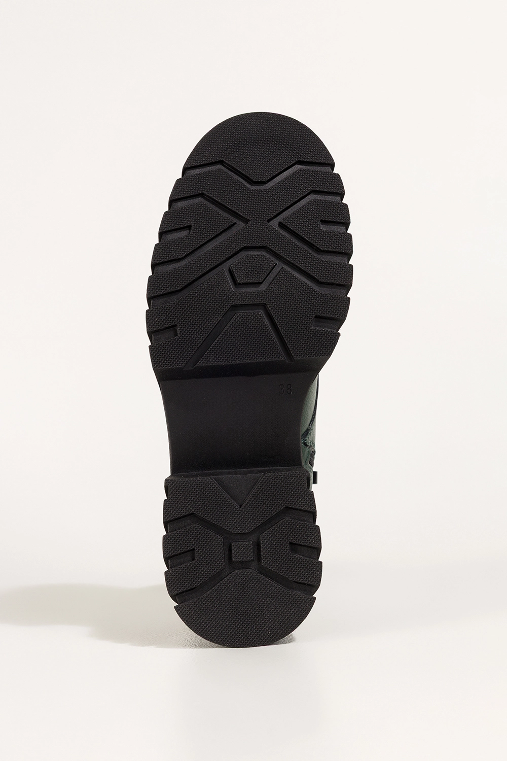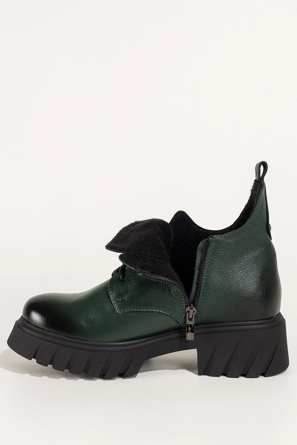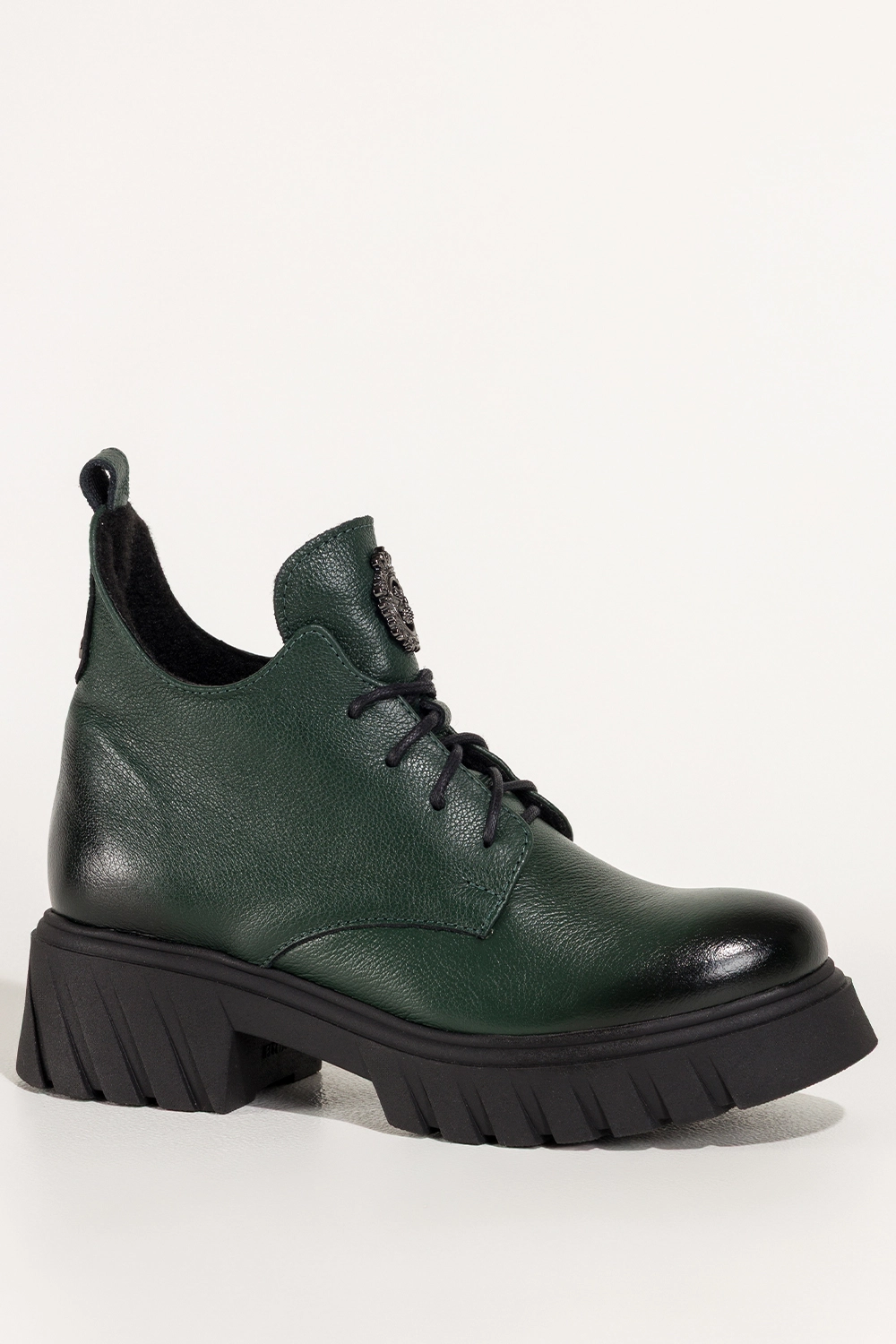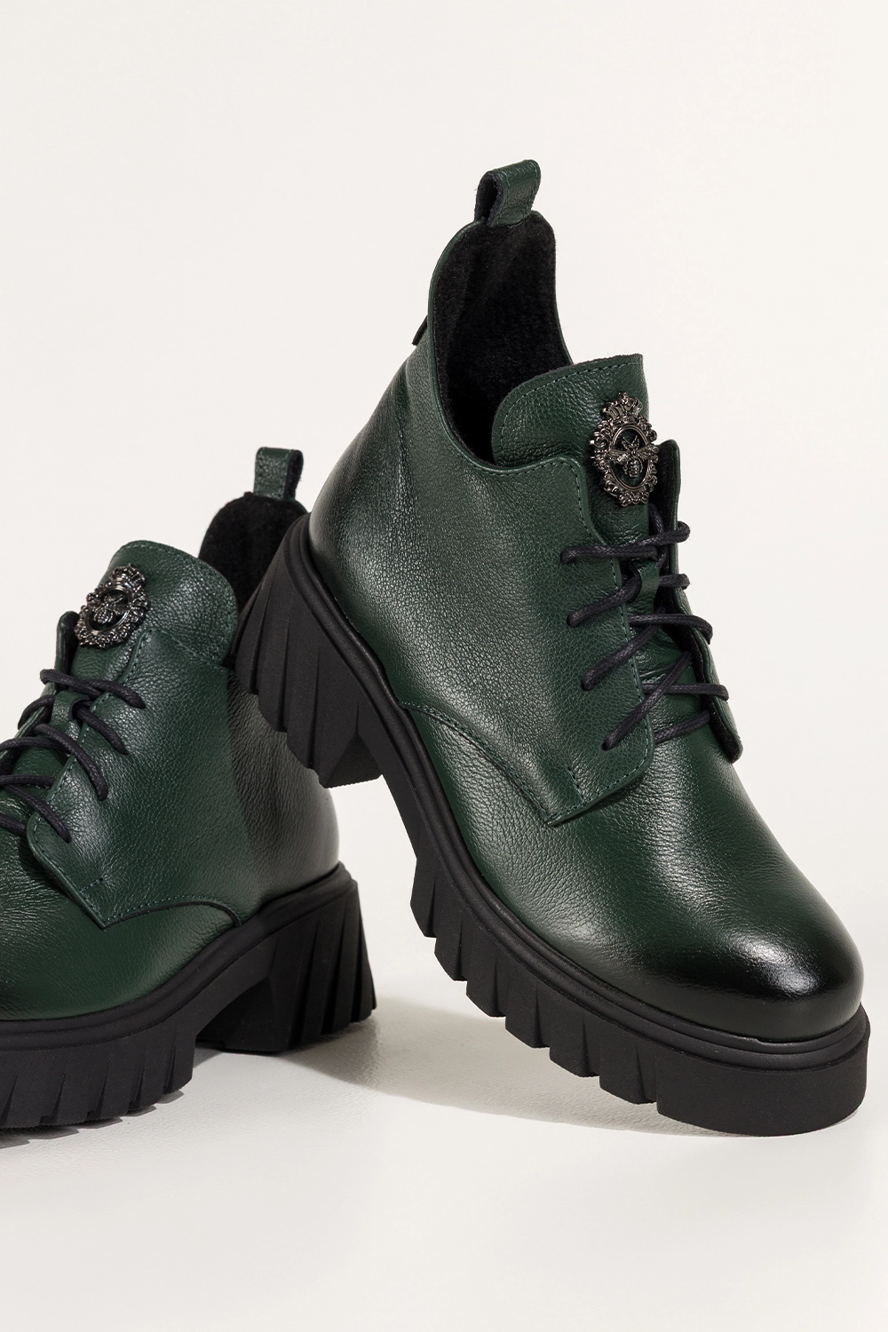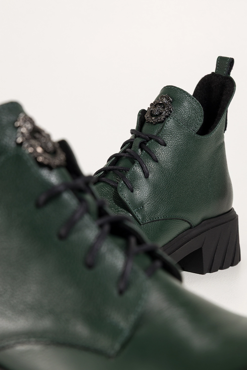 Zielone botki skórzane damskie na bieżnikowanej platformie wycięta cholewka stalowa ozdoba na języku sznurowane PRODUKT POLSKI Casu model 39458. Wysokogatunkowa skóra naturalna zapewnia trwałość i odporność na warunki pogodowe, a miękka wkładka z koca obuwniczego gwarantuje ciepło i komfort nawet podczas długich spacerów. To obuwie, stworzone z dbałością o każdy detal, który zachwyca jakością wykonania i solidnością.