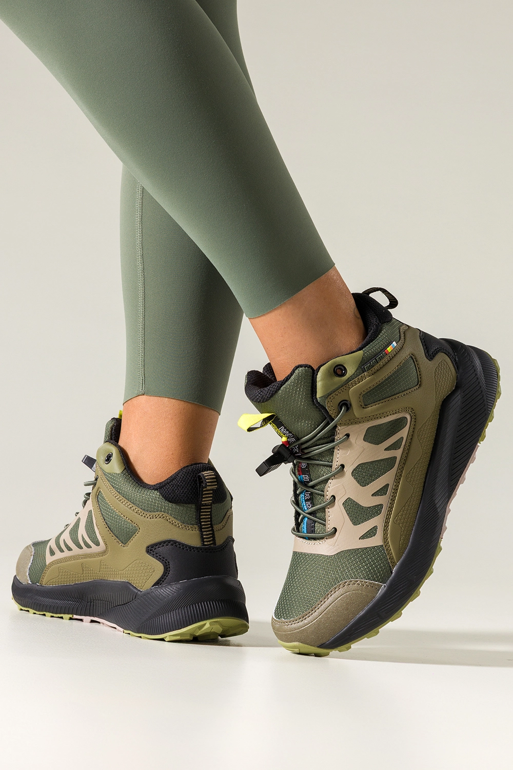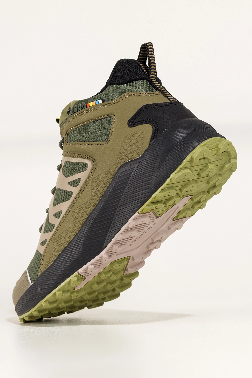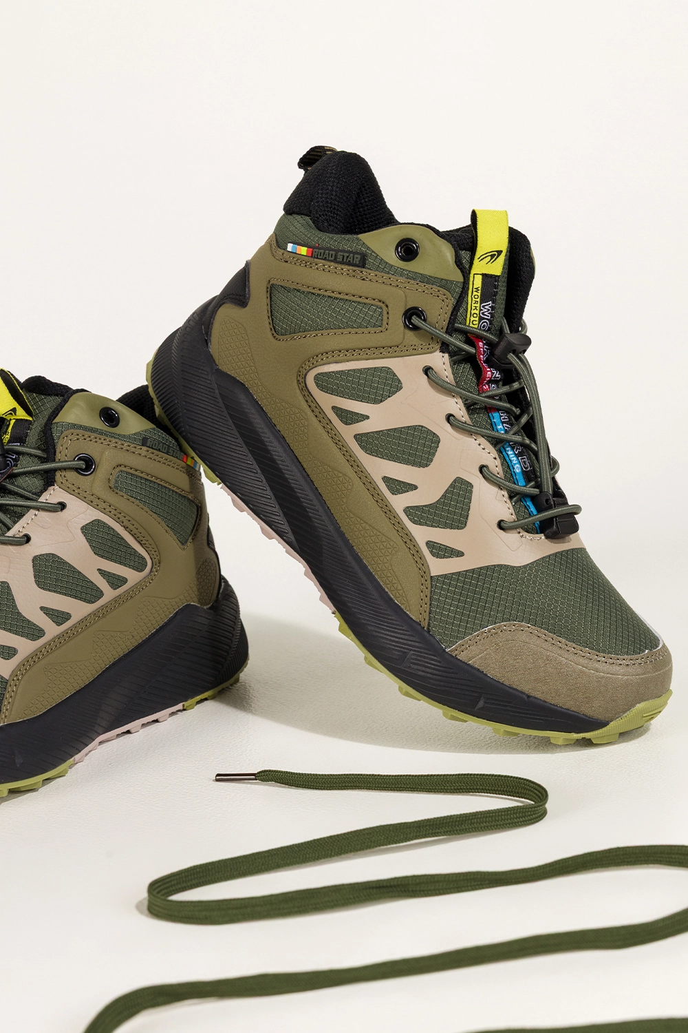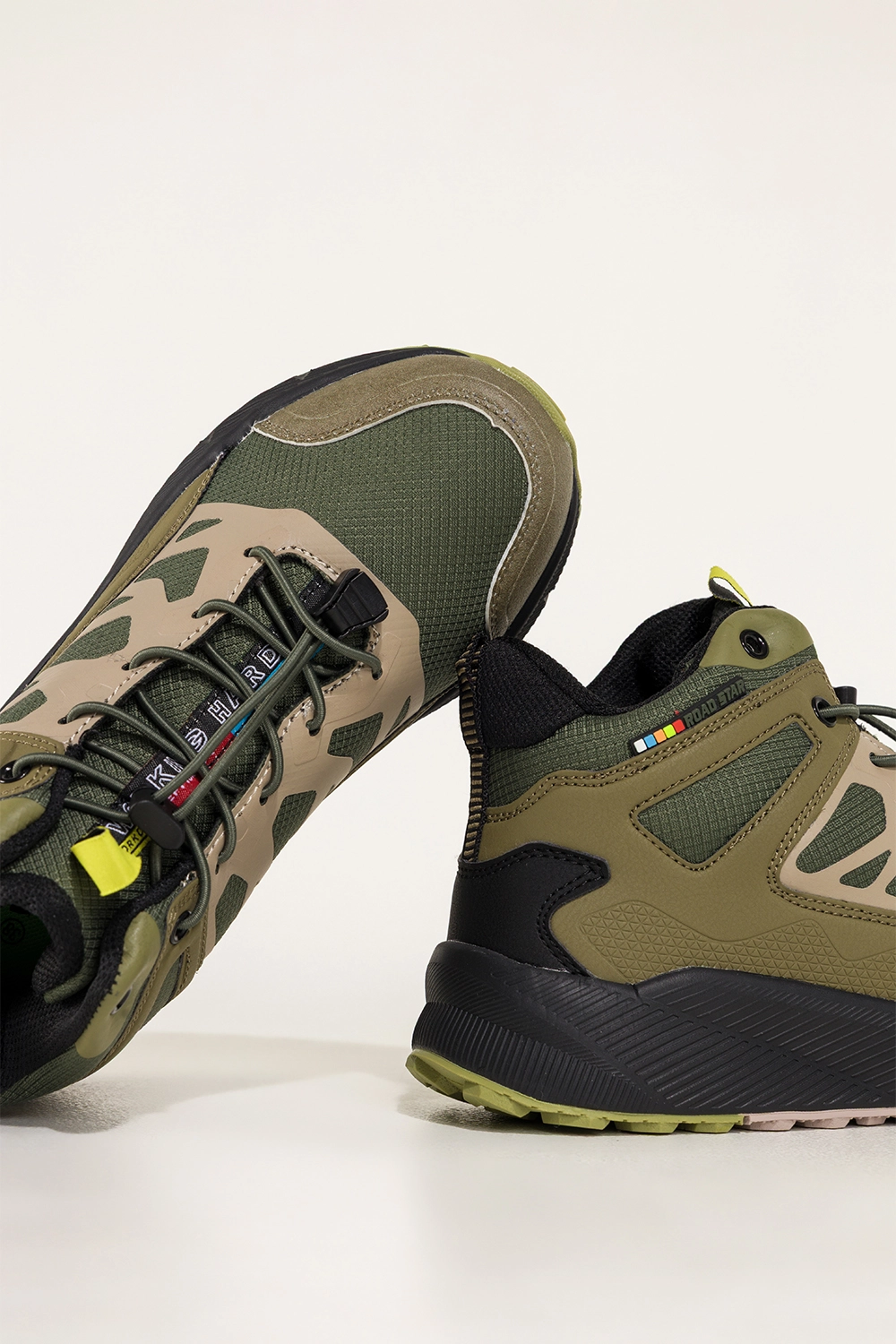 Ich nowoczesny design z beżowymi wstawkami i bieżnikowaną podeszwą nadaje im charakteru, a jednocześnie zwiększa przyczepność w wymagającym terenie. Wysoka cholewka chroni kostkę, a elastyczne, regulowane sznurówki oraz dodatkowy zielony komplet pozwalają na idealne dopasowanie do stopy.