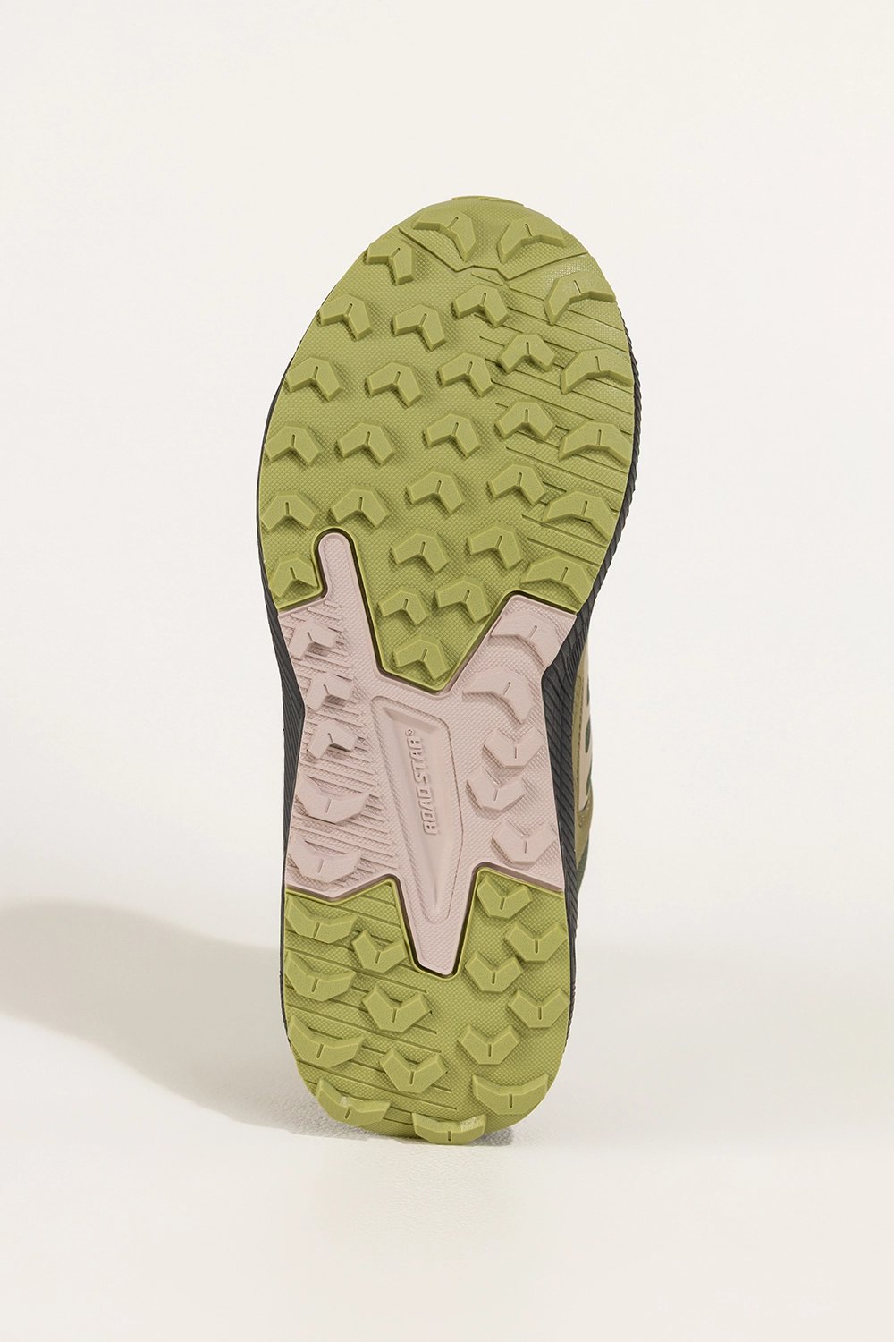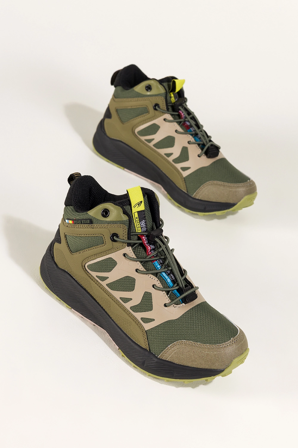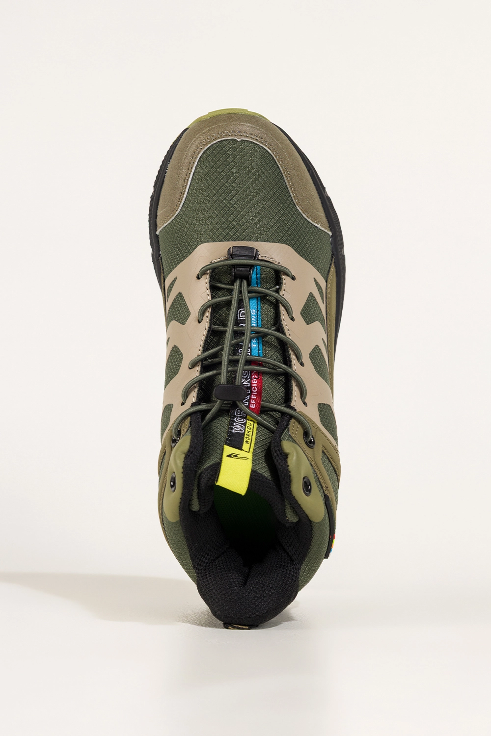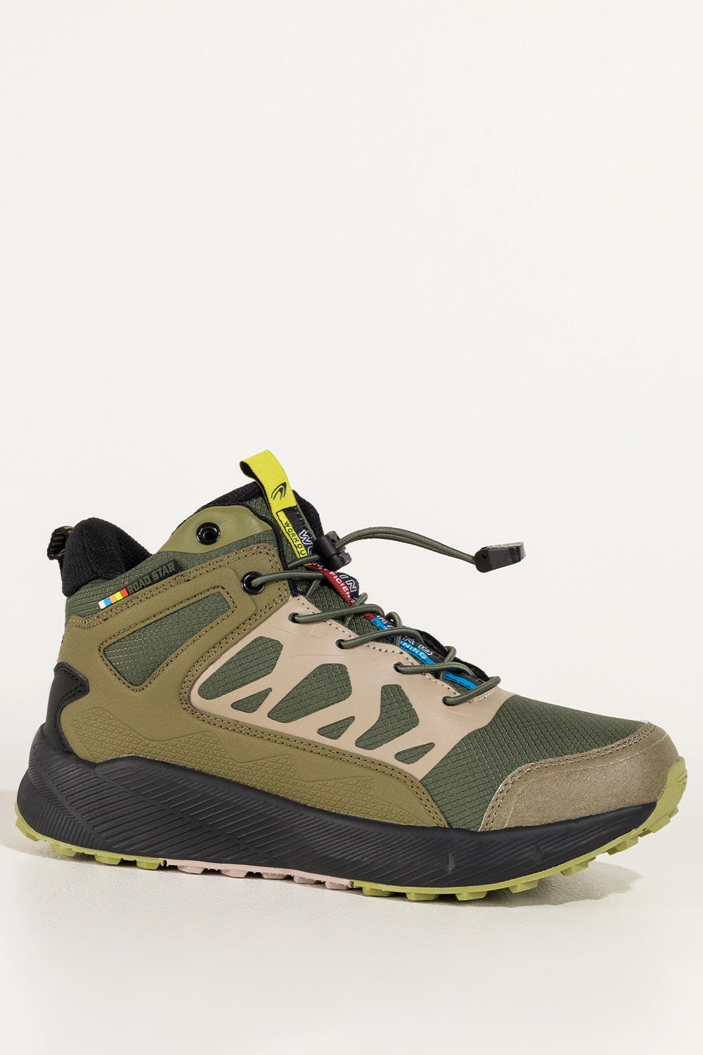 Ich nowoczesny design z beżowymi wstawkami i bieżnikowaną podeszwą nadaje im charakteru, a jednocześnie zwiększa przyczepność w wymagającym terenie. Wysoka cholewka chroni kostkę, a elastyczne, regulowane sznurówki oraz dodatkowy zielony komplet pozwalają na idealne dopasowanie do stopy.