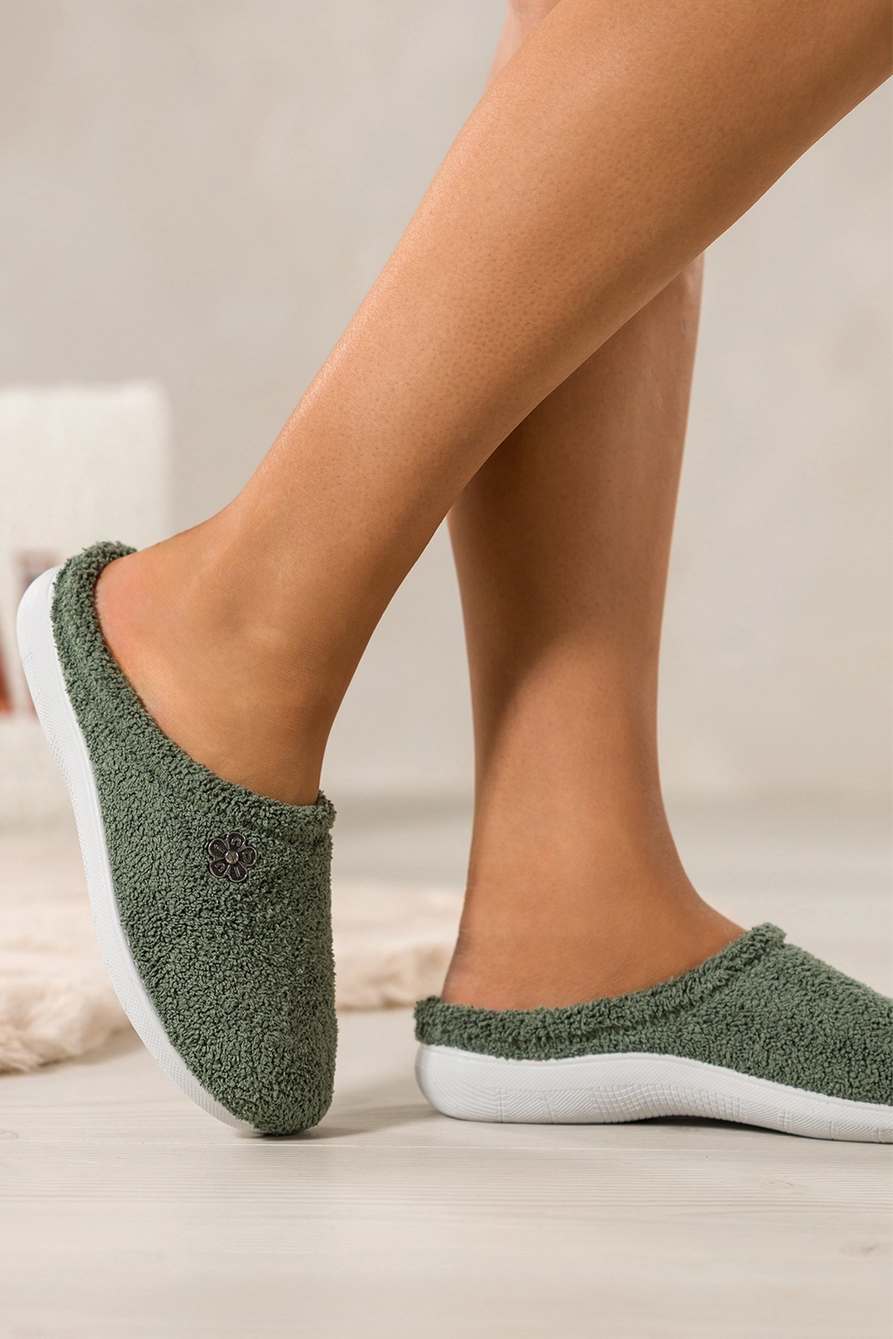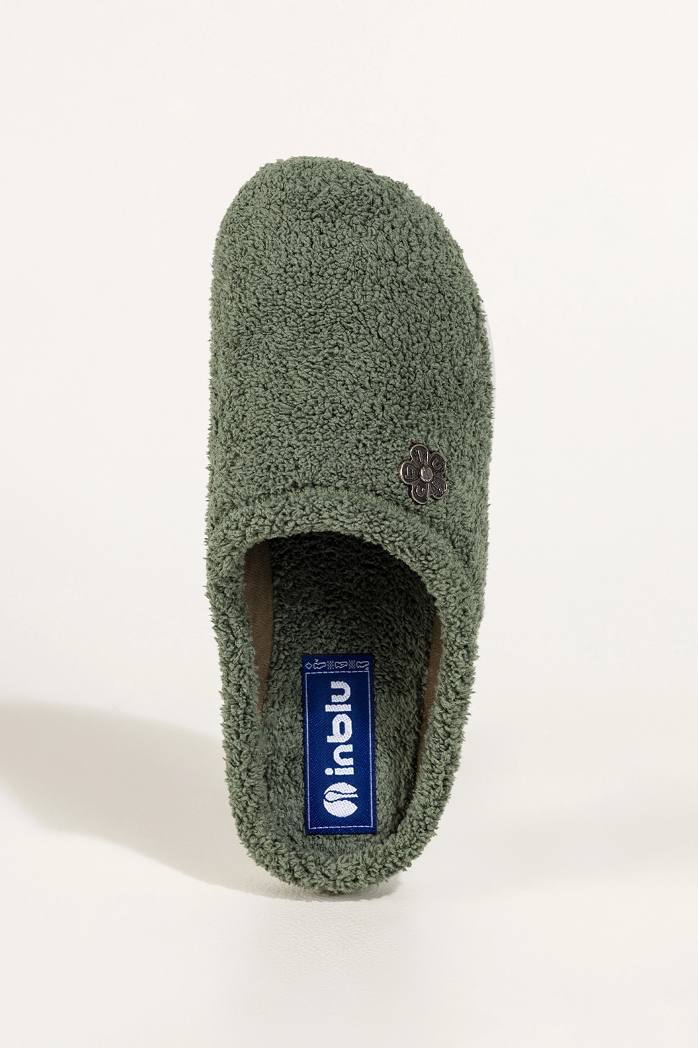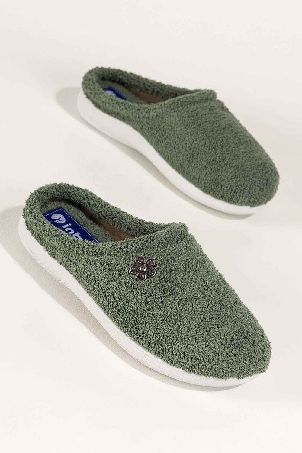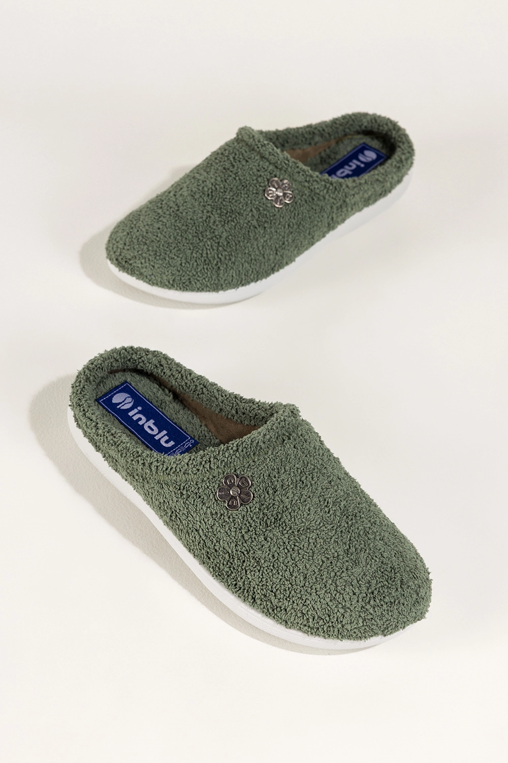 Zielone kapcie damskie Inblu obuwie domowe ozdobny stalowy kwiatek model VX689899, połączenie elegancji i komfortu na najwyższym poziomie. Wykonane z wysokogatunkowego, przyjemnego w dotyku materiału, gwarantują długotrwałą trwałość i niepowtarzalny wygląd. Miękka wkładka z materiału delikatnie otula stopę, zapewniając wygodę przy każdym kroku, a staranne wykończenie podkreśla ich luksusowy charakter.