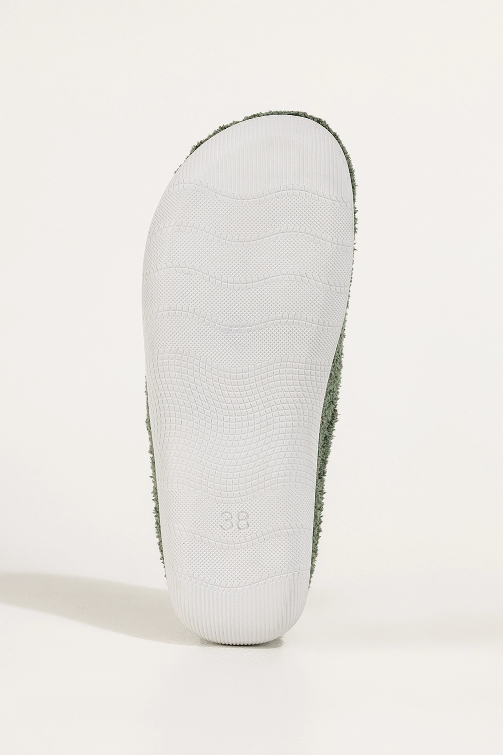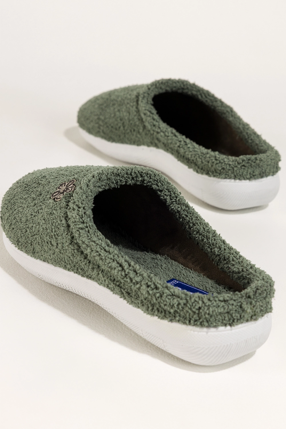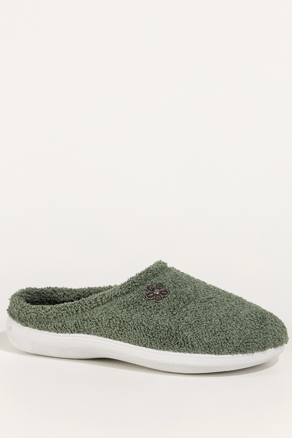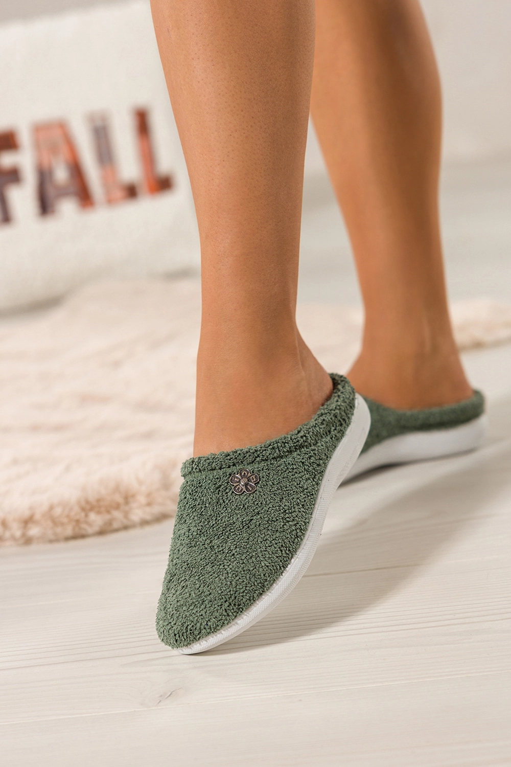 Zaokrąglony nosek oraz subtelny stalowy kwiatek na cholewce nadają kapciom wyjątkowego uroku. Zielony kolor sprawia, że doskonale wpasują się w każdy domowy outfit, dodając nuty elegancji nawet w codziennym wypoczynku. Wygodna wsuwana konstrukcja pozwala na szybkie zakładanie i zdejmowanie bez wysiłku.