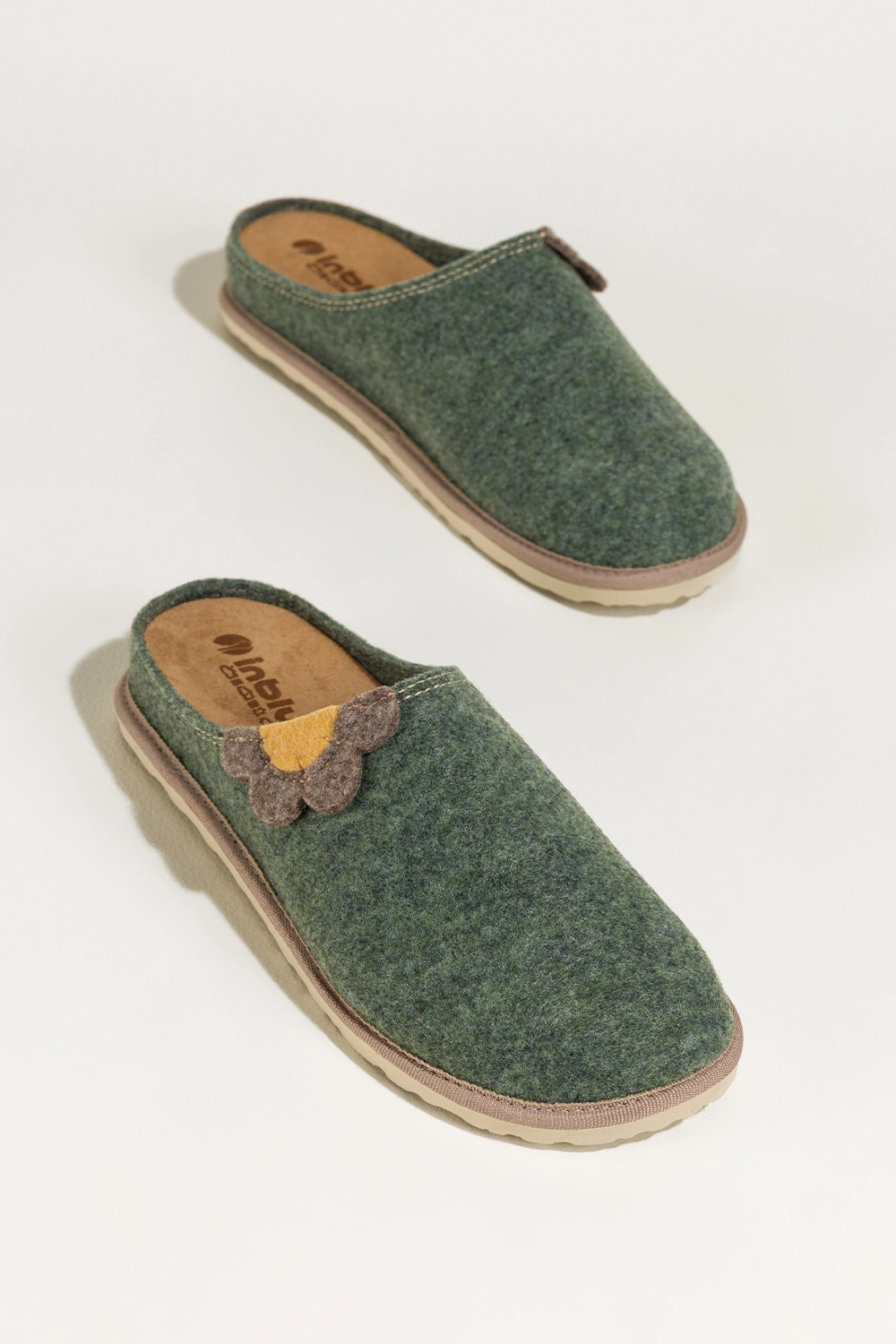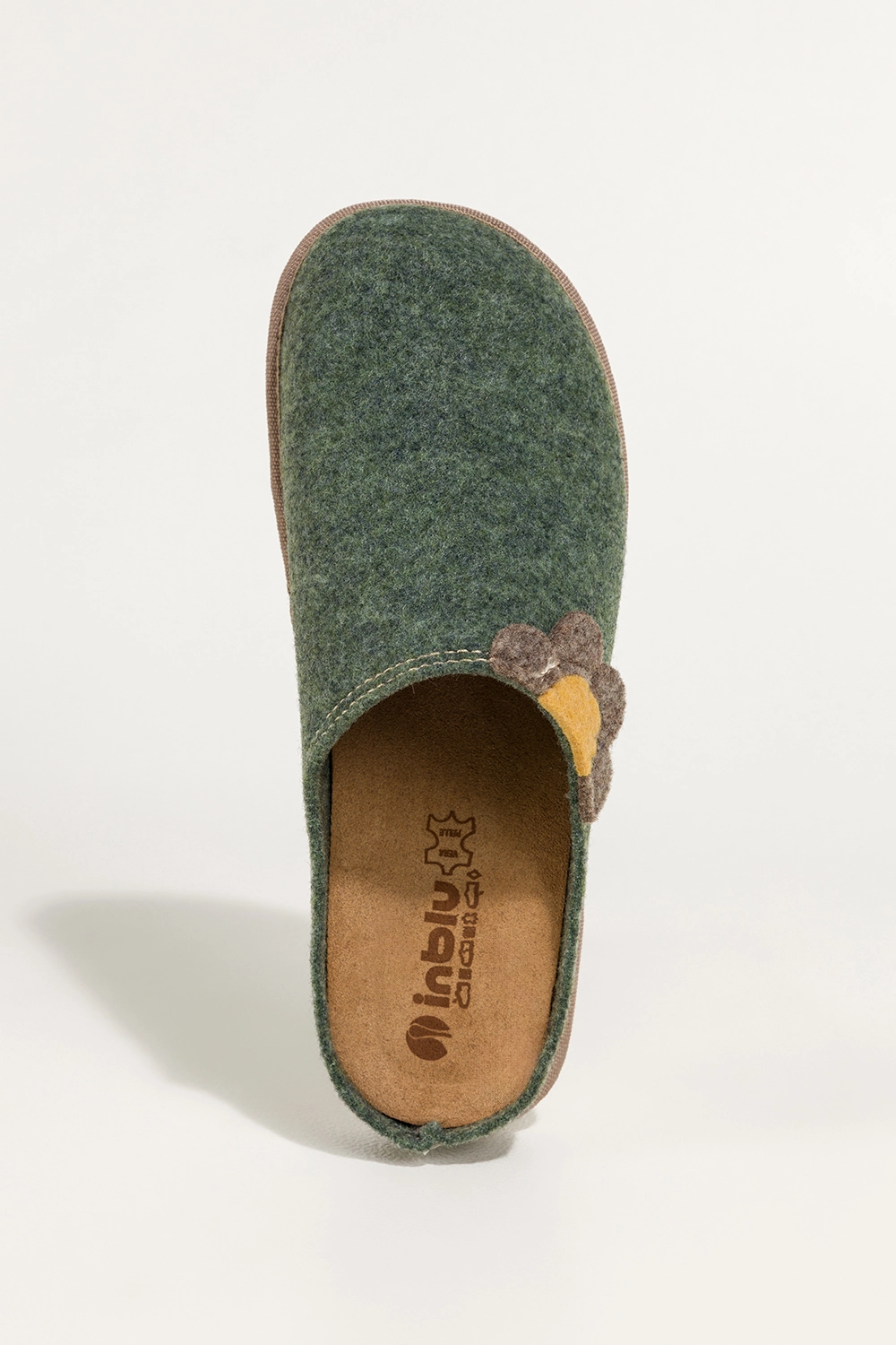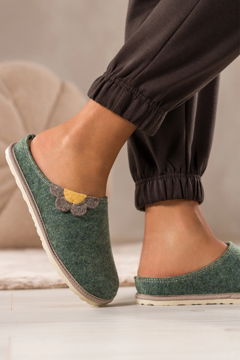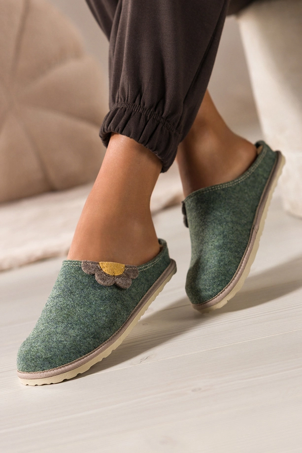 Zielone kapcie damskie Inblu obuwie domowe z wyjmowaną skórzaną wkładką ozdobny kwiat XH999956. Wykonane z miękkiego filcu, zapewniają stopom przyjemne ciepło i komfort, nawet podczas długiego noszenia. Naturalna, skórzana wkładka jest wyjmowana, co ułatwia utrzymanie higieny i pozwala na indywidualne dopasowanie. Wsuwana konstrukcja oraz lekka, płaska podeszwa gwarantują wygodę przy każdym kroku. To idealne obuwie domowe na chłodniejsze dni, które dba o zdrowie i komfort Twoich stóp.