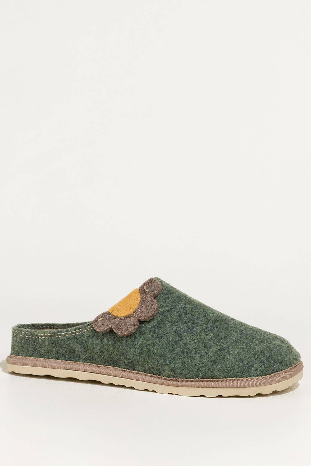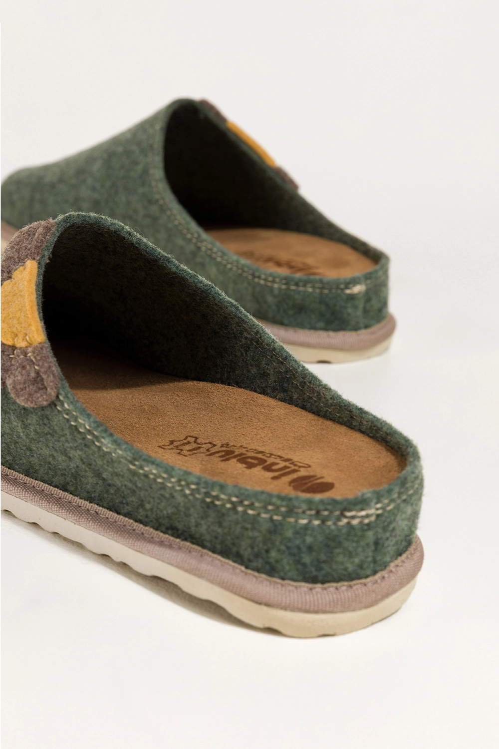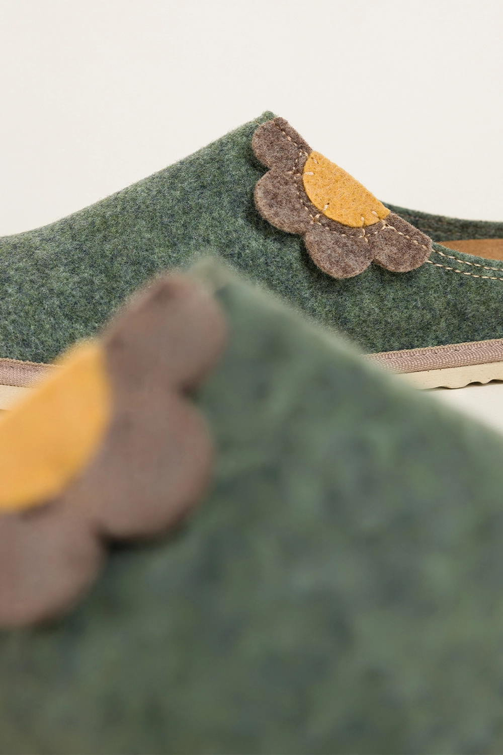 Zielone kapcie damskie Inblu obuwie domowe z wyjmowaną skórzaną wkładką ozdobny kwiat XH999956. Wykonane z miękkiego filcu, zapewniają stopom przyjemne ciepło i komfort, nawet podczas długiego noszenia. Naturalna, skórzana wkładka jest wyjmowana, co ułatwia utrzymanie higieny i pozwala na indywidualne dopasowanie. Wsuwana konstrukcja oraz lekka, płaska podeszwa gwarantują wygodę przy każdym kroku. To idealne obuwie domowe na chłodniejsze dni, które dba o zdrowie i komfort Twoich stóp.