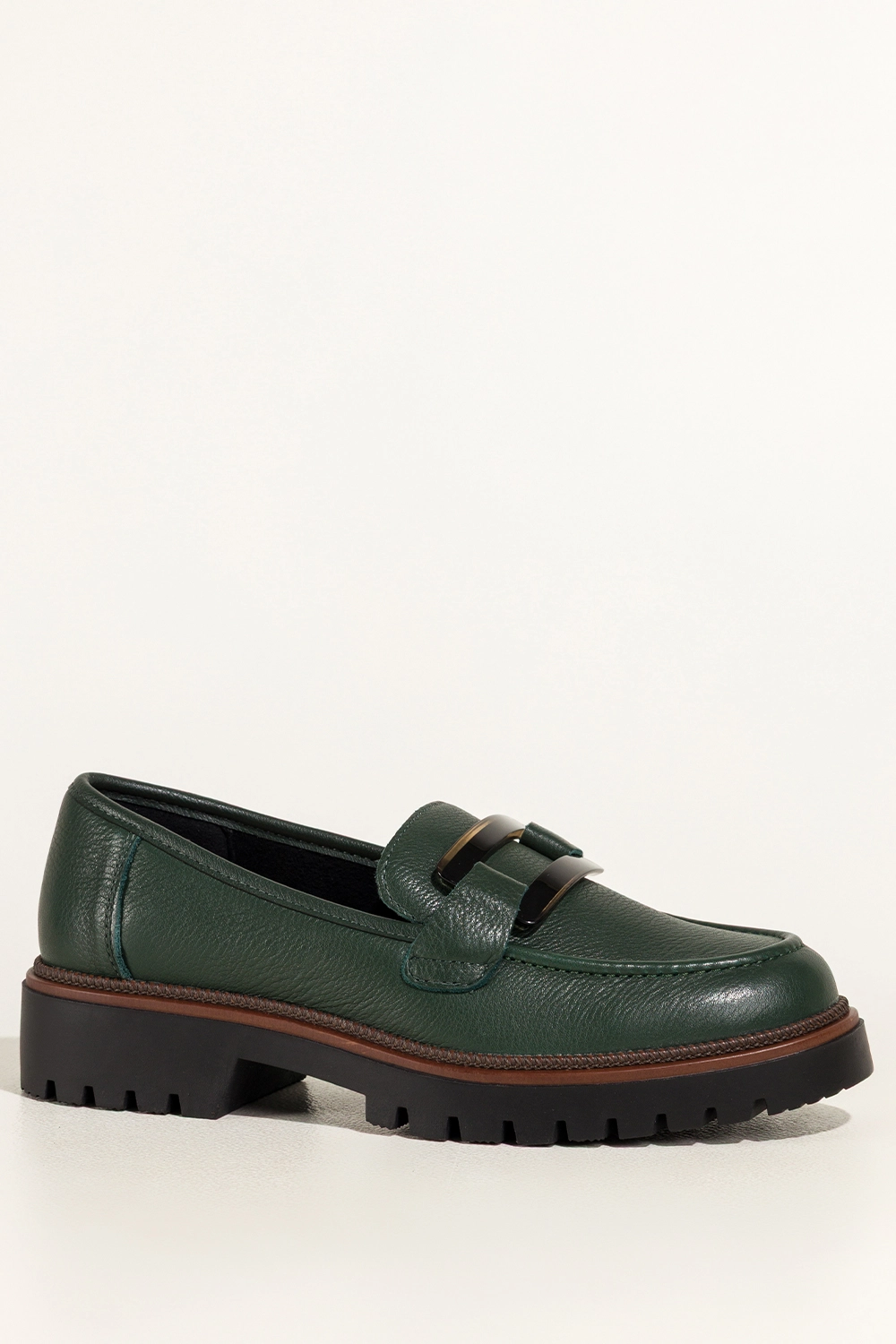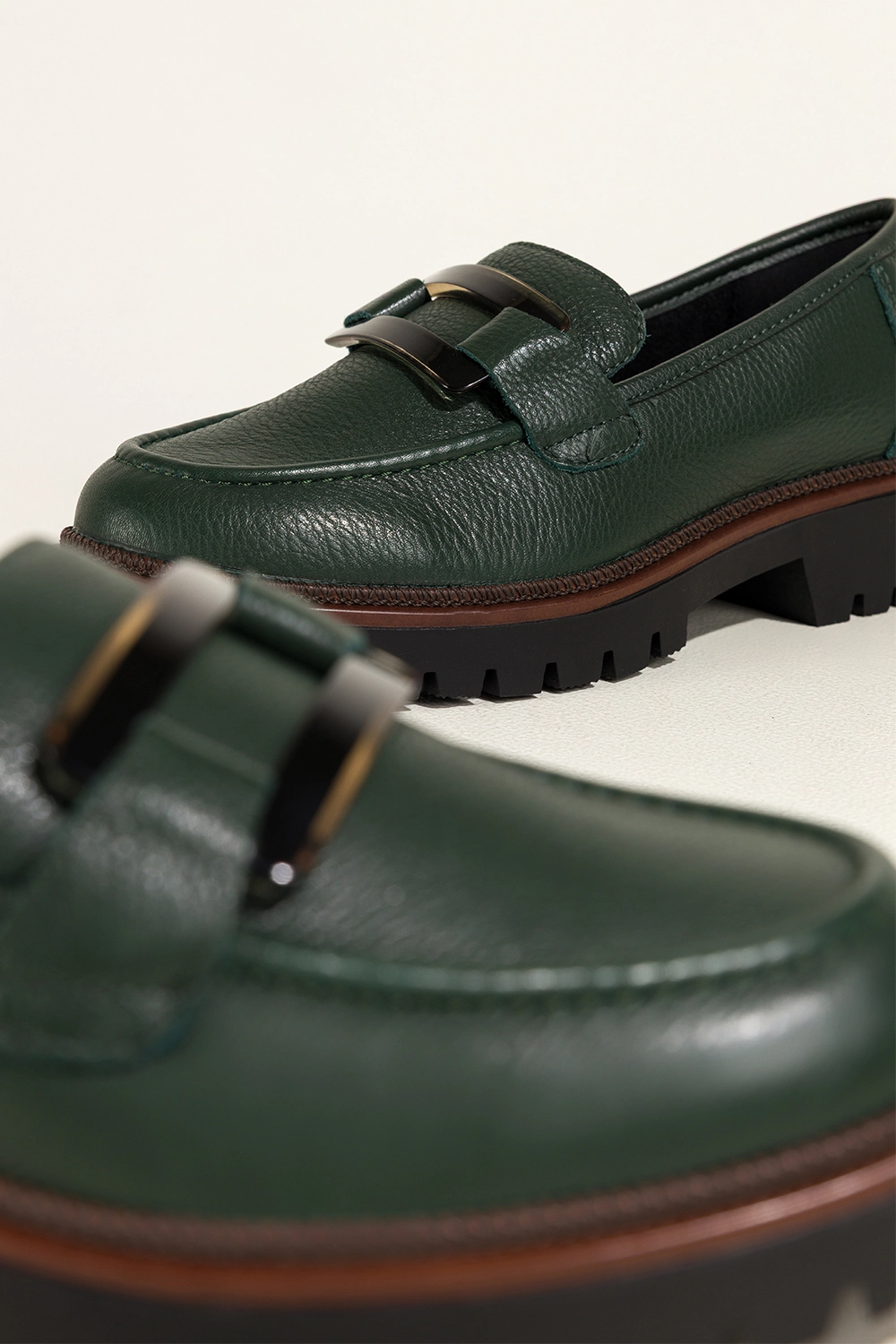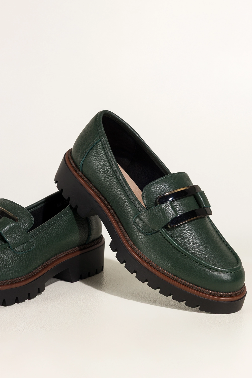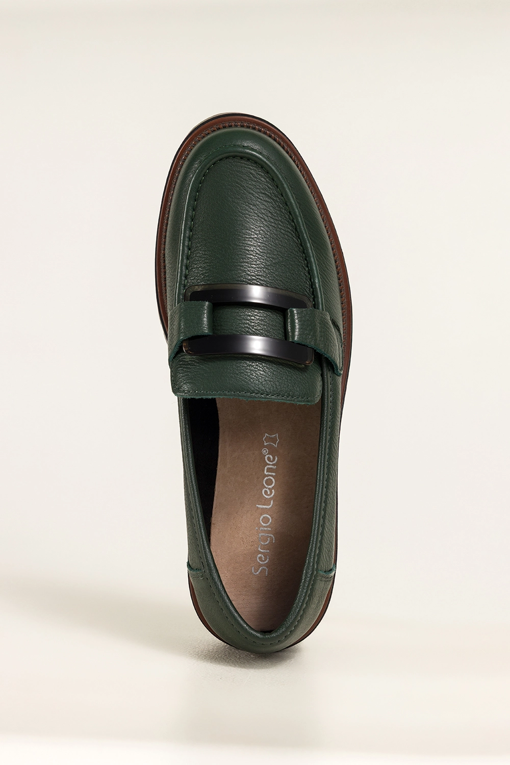 Zielone mokasyny skórzane damskie Sergio Leone na bieżnikowanej podeszwie czarna ozdoba na cholewce NP74833-H
