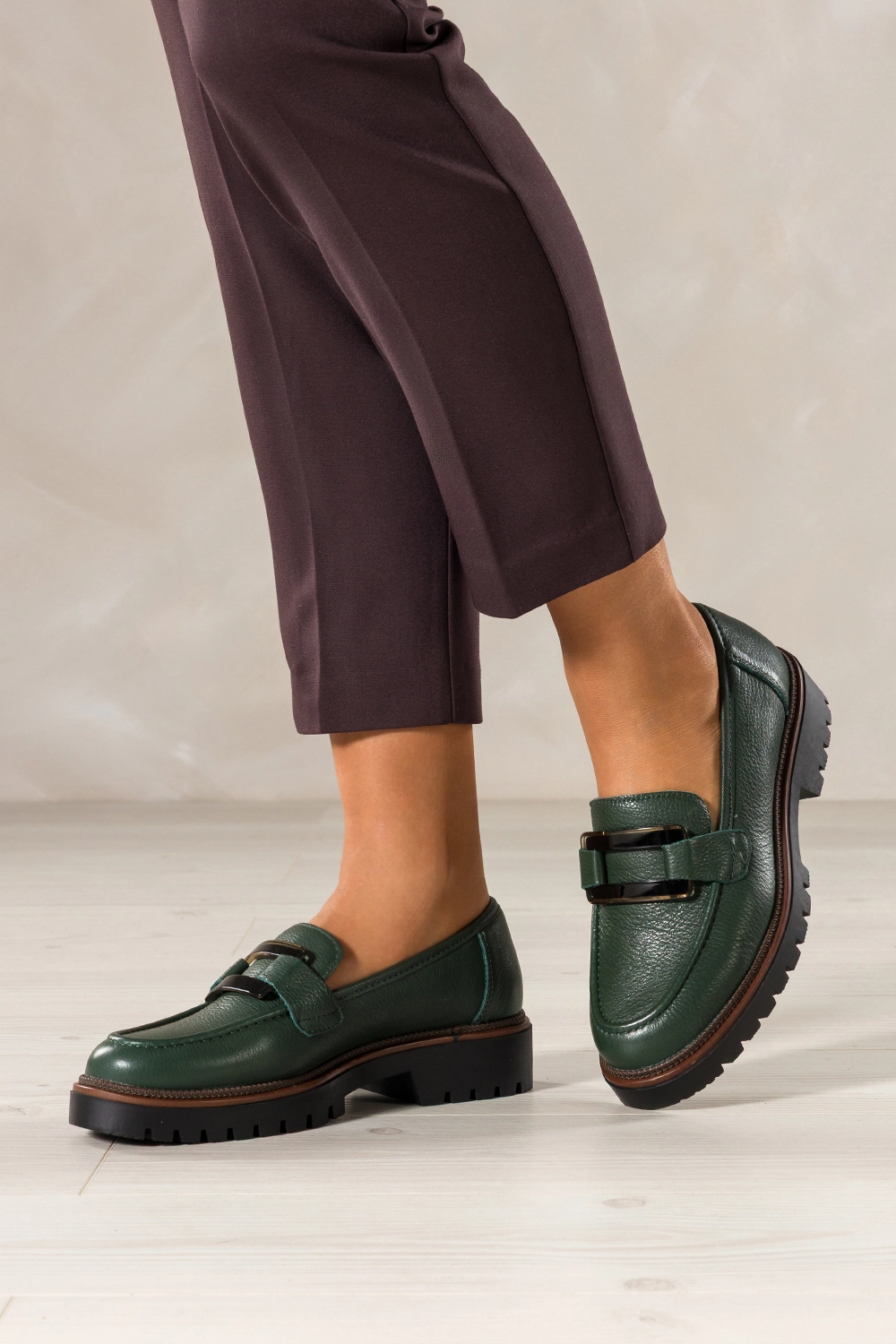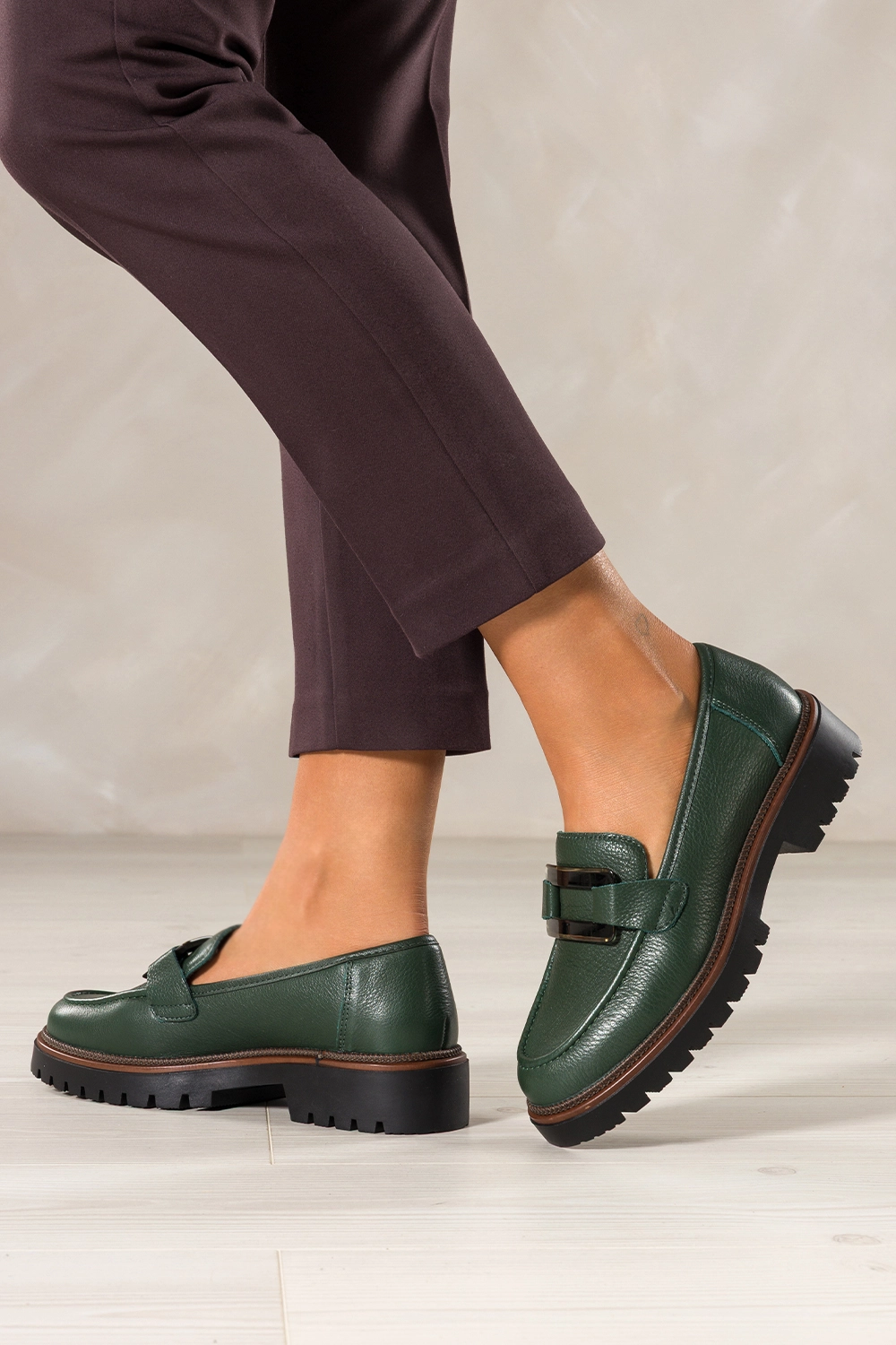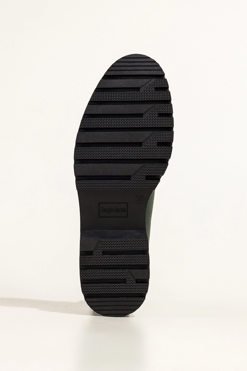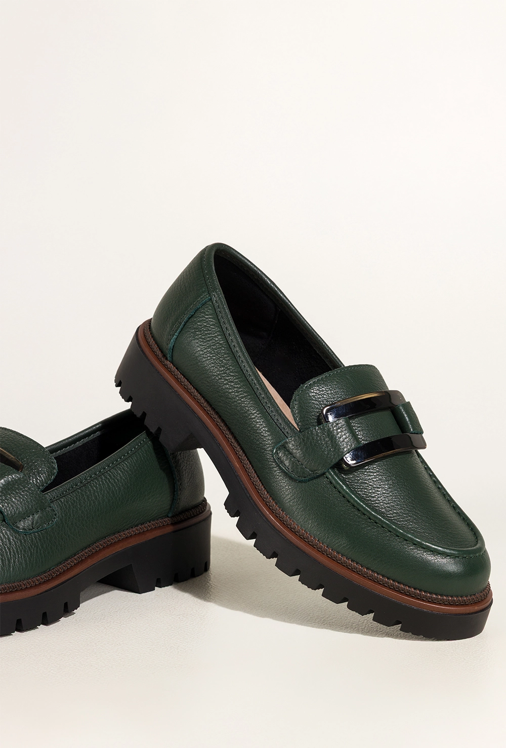 Zielone mokasyny skórzane damskie Sergio Leone na bieżnikowanej podeszwie czarna ozdoba na cholewce NP74833-H