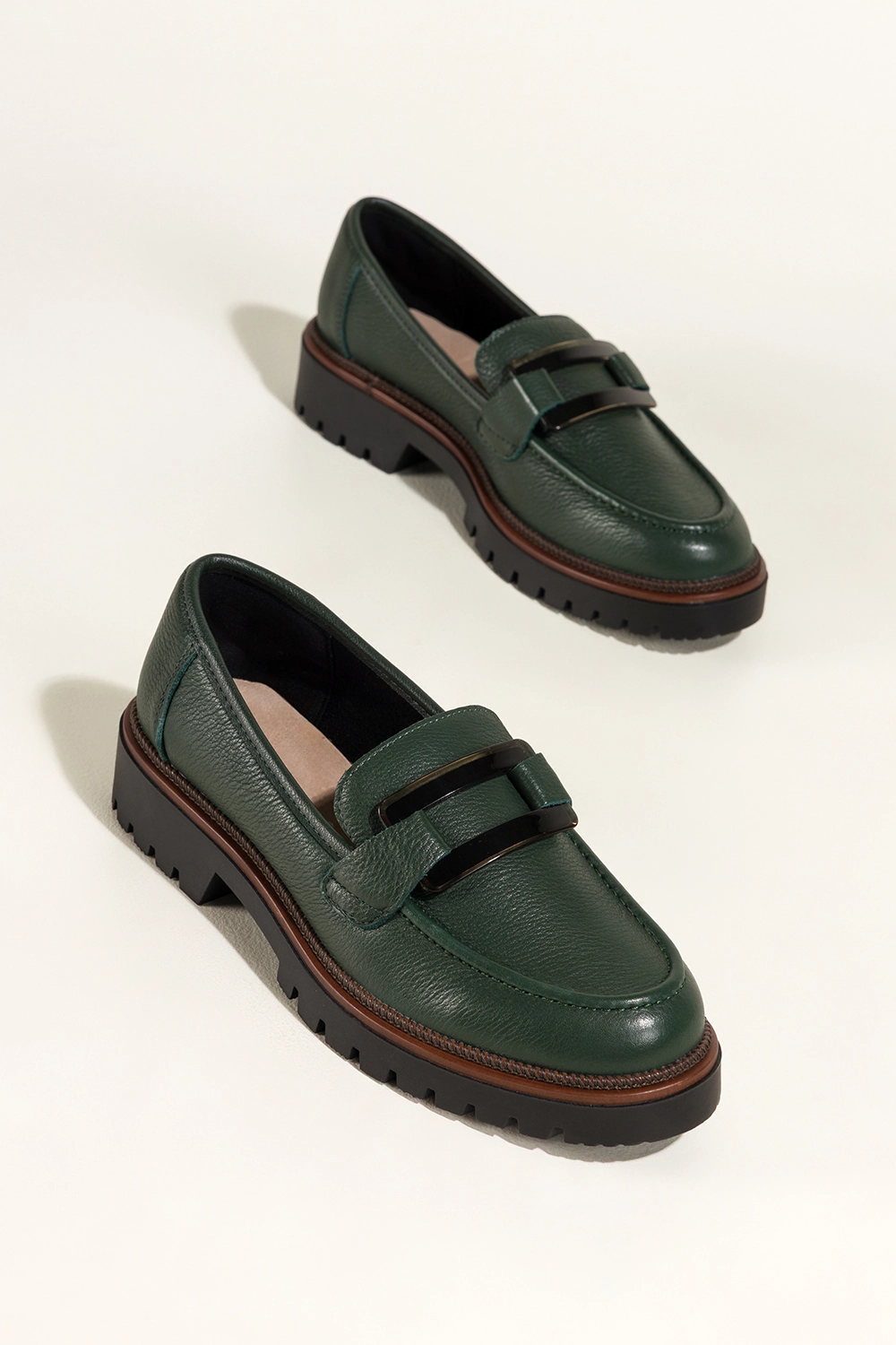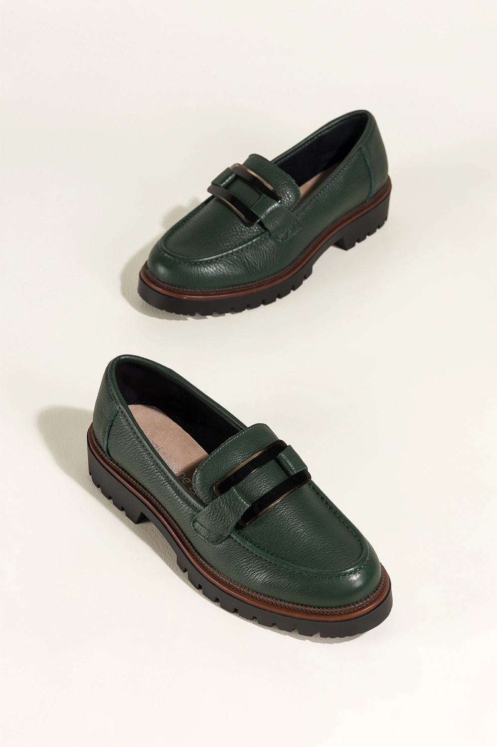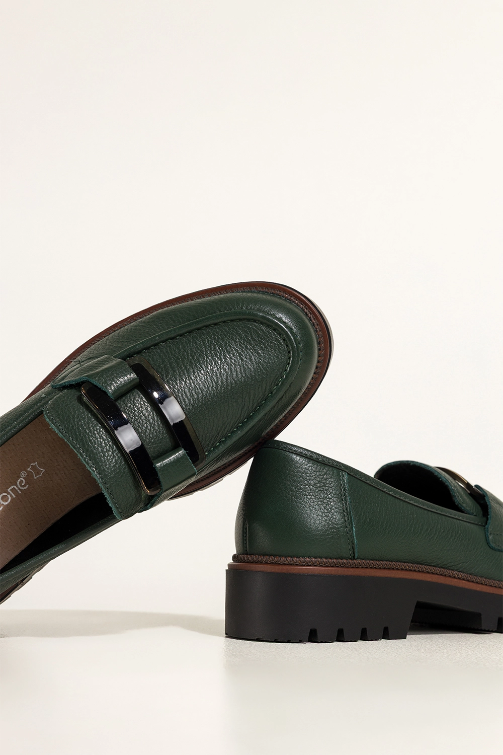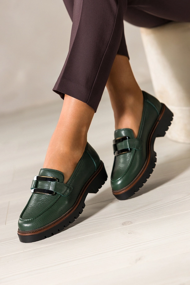 Zielone mokasyny skórzane damskie Sergio Leone na bieżnikowanej podeszwie czarna ozdoba na cholewce model NP74833-H. Wykonane z wysokogatunkowej, miękkiej skóry naturalnej. Skórzana wkładka dodatkowo podnosi komfort, idealnie dopasowując się do kształtu stopy. Ich solidna, bieżnikowana podeszwa gwarantuje stabilność i bezpieczeństwo na każdej nawierzchni, nawet podczas długiego dnia na nogach.