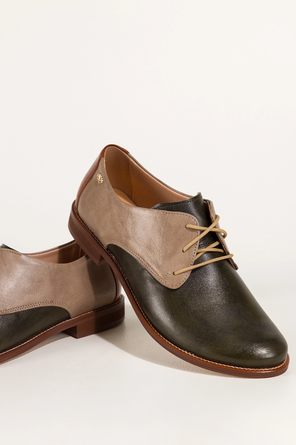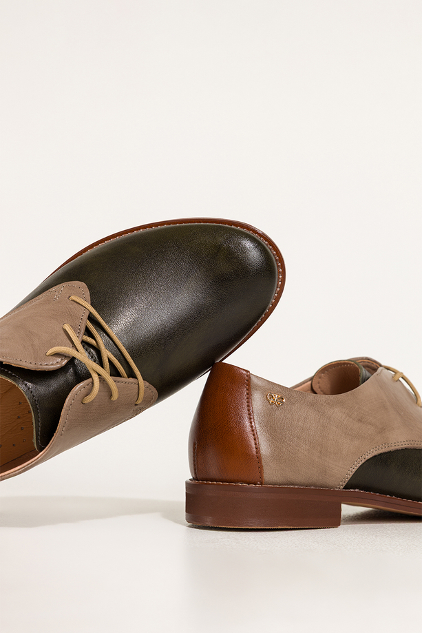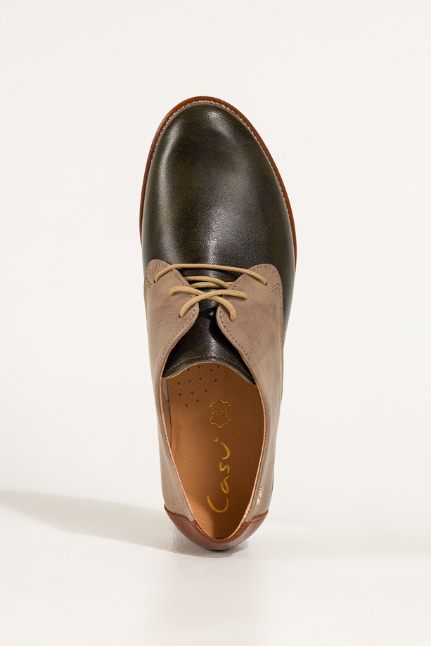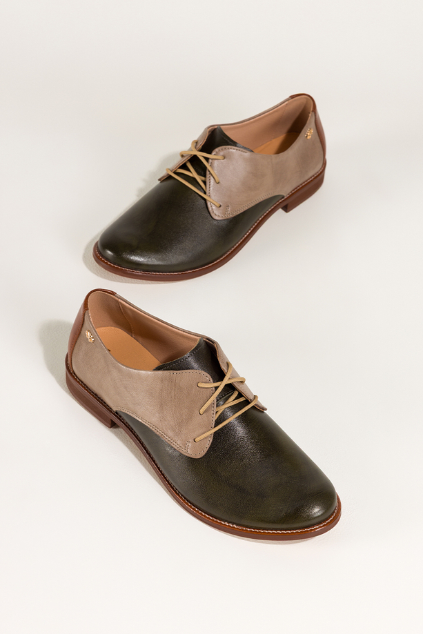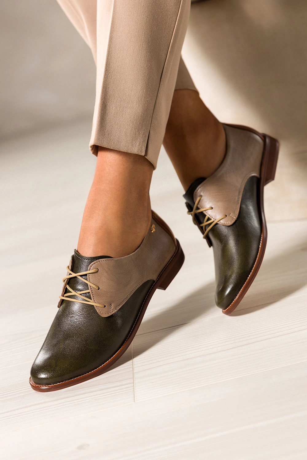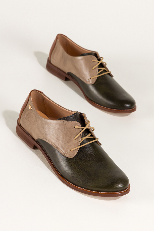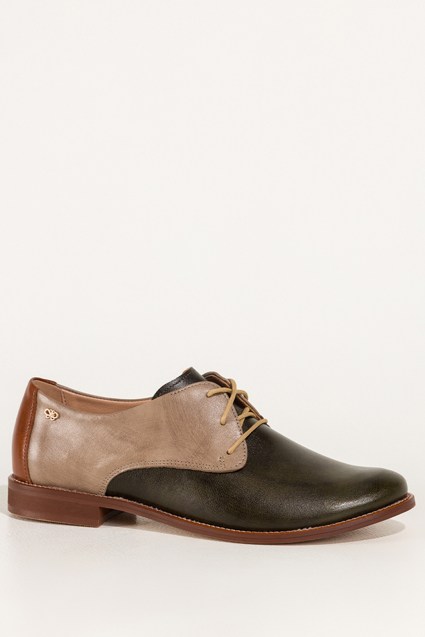 Zielone półbuty skórzane damskie płaskie złota ozdoba beżowe i brązowe wstawki sznurowane PRODUKT POLSKI Casu model 5761-SLTO H, to kwintesencja polskiego rzemiosła i precyzji. Wykonane z wysokogatunkowej skóry naturalnej, gwarantują trwałość, wygodę i elegancki wygląd przez wiele sezonów. Miękka, skórzana wkładka doskonale dopasowuje się do kształtu stopy, zapewniając komfort nawet podczas długiego dnia.