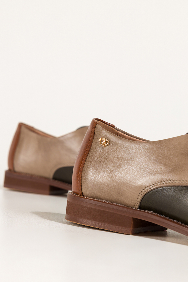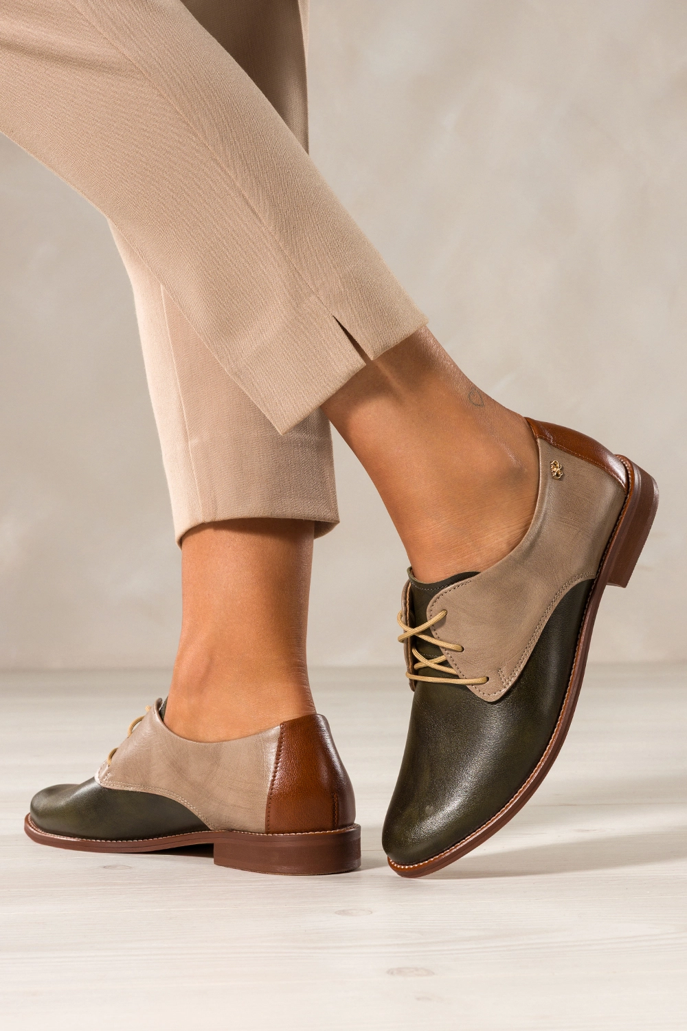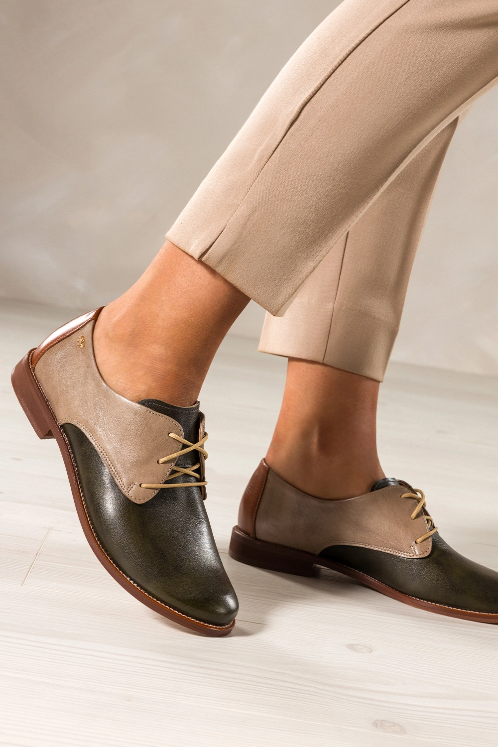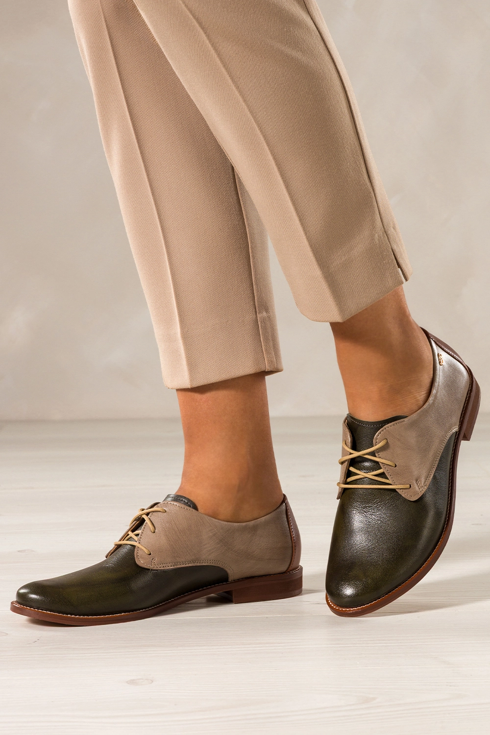 Zielone półbuty skórzane damskie płaskie złota ozdoba beżowe i brązowe wstawki sznurowane PRODUKT POLSKI Casu model 5761-SLTO H, to kwintesencja polskiego rzemiosła i precyzji. Wykonane z wysokogatunkowej skóry naturalnej, gwarantują trwałość, wygodę i elegancki wygląd przez wiele sezonów. Miękka, skórzana wkładka doskonale dopasowuje się do kształtu stopy, zapewniając komfort nawet podczas długiego dnia.