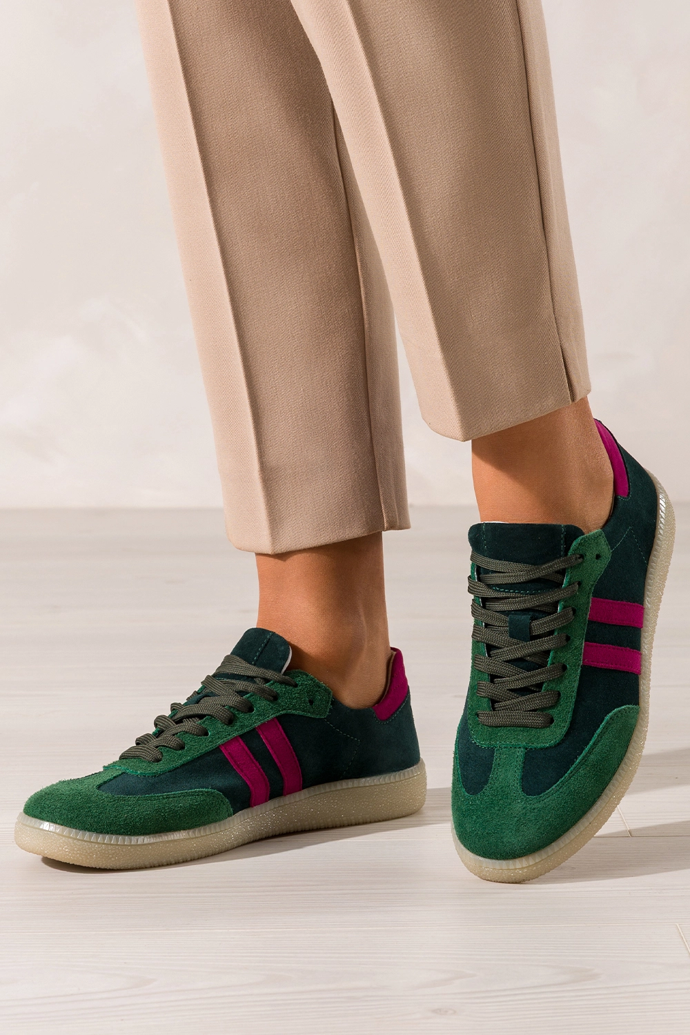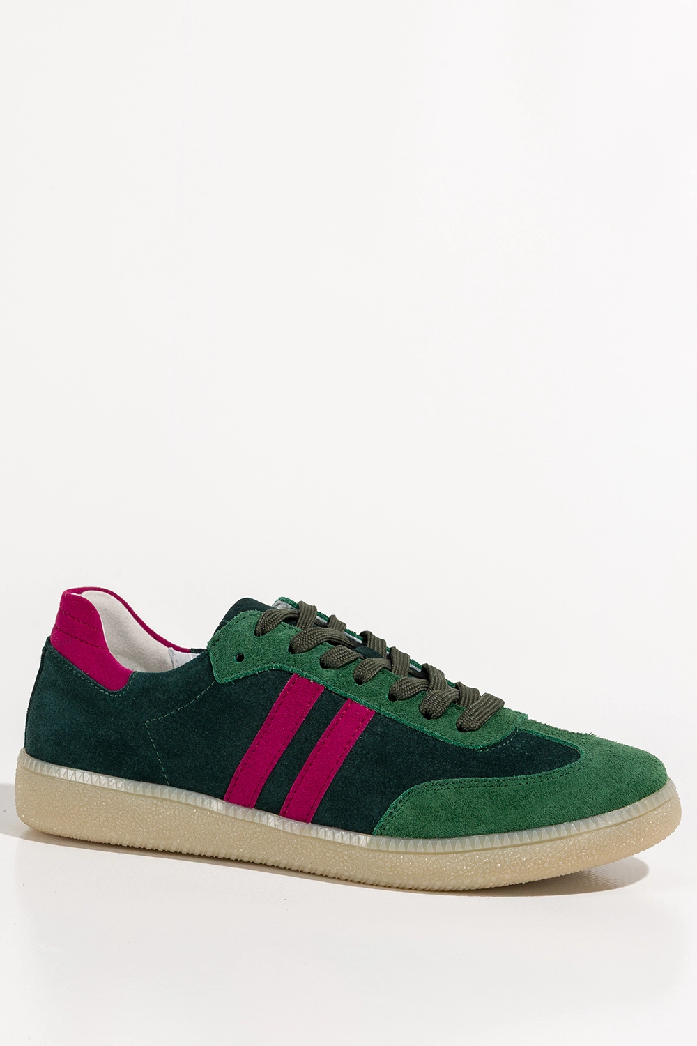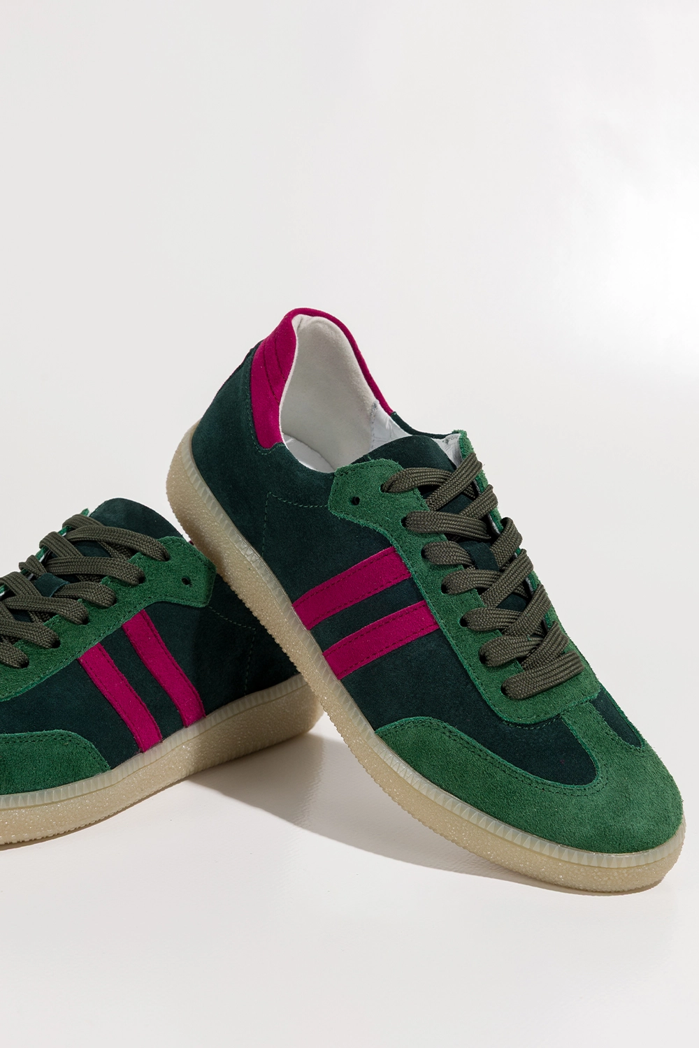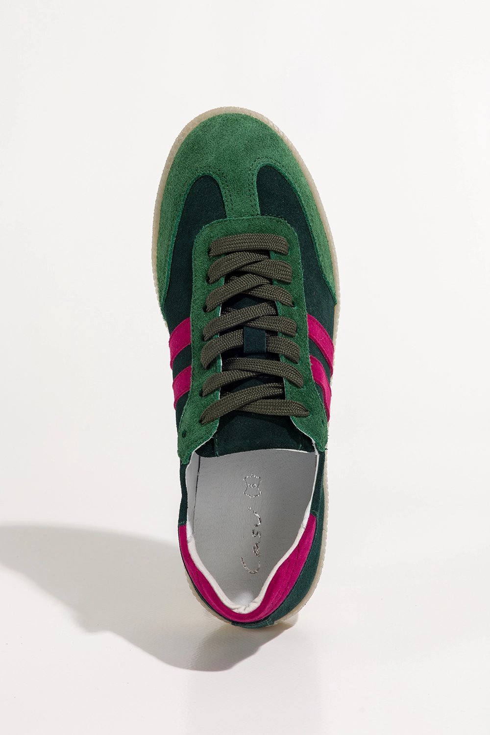 Zielone sneakersy skórzane damskie buty sportowe z fuksjowymi wstawkami sznurowane PRODUKT POLSKI Casu N1068 to połączenie wyjątkowego stylu, niezawodnej wygody i mistrzowskiego wykonania, które zadowoli nawet najbardziej wymagające klientki. Model ten zachwyca głębokim, szlachetnym odcieniem zieleni, kontrastującym z energetycznymi, fuksjowymi akcentami – to właśnie ten kolorystyczny duet sprawia, że buty przyciągają spojrzenia i stają się modowym manifestem kobiecej pewności siebie. Wykonane z wysokogatunkowej skóry zamszowej, z miękką, naturalną skórzaną wkładką i jasną, elastyczną podeszwą, gwarantują nie tylko estetyczne wrażenia, ale przede wszystkim komfort i trwałość. To doskonała inwestycja w obuwie, które łączy jakość premium z przystępną ceną.